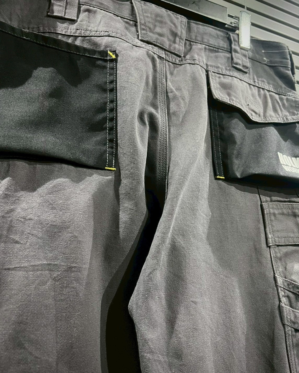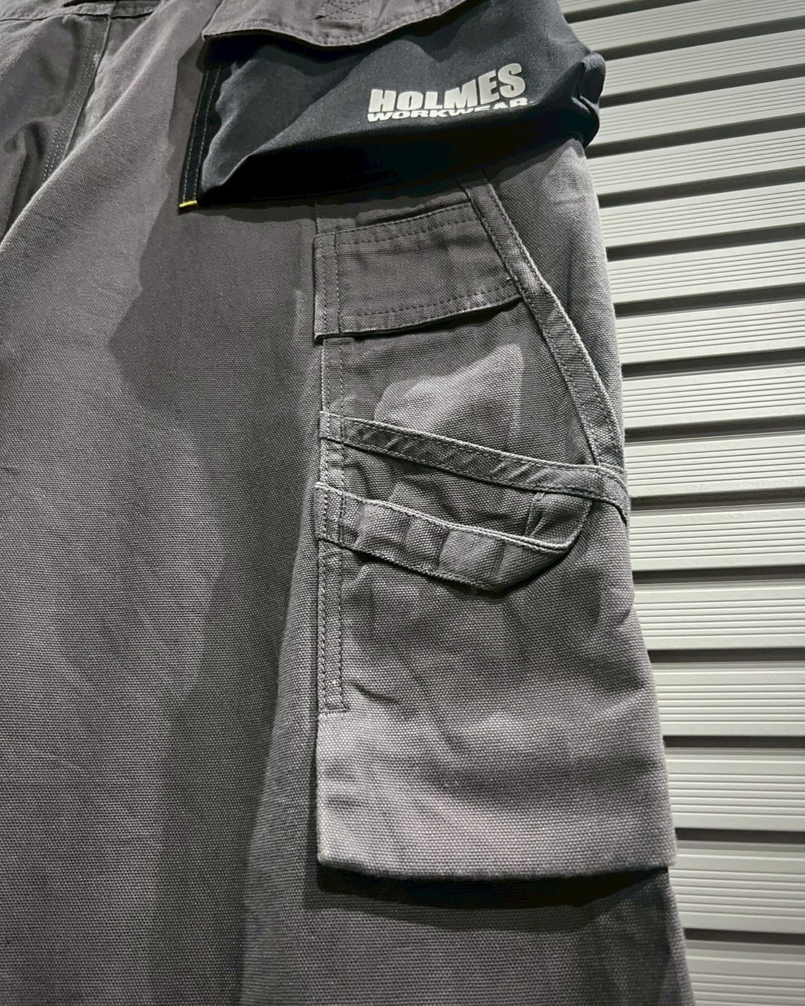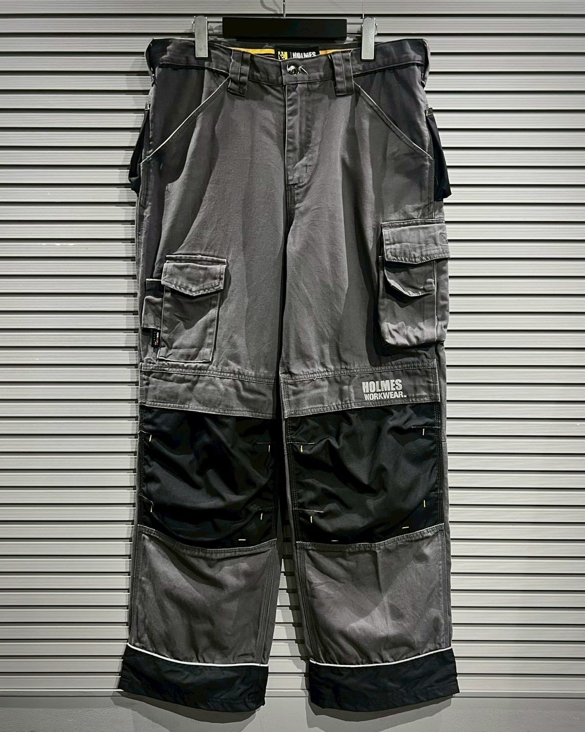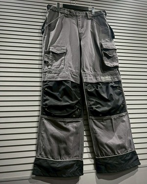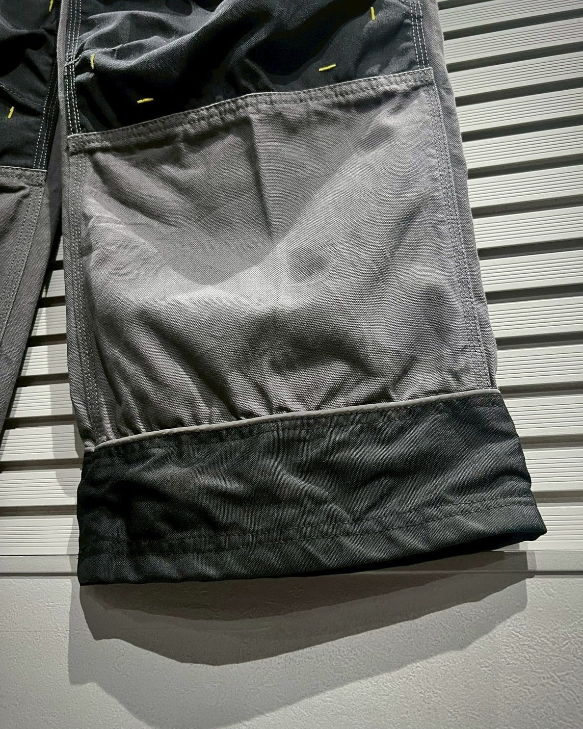 高密度に織られたボディをベースに、膝部分にはナイロン素材を切り替えたダブルニー仕様を採用。ハードな現場での耐久性を意識した構造ながら、グレー×ブラックのバイカラーデザインがモードな印象を添えます。