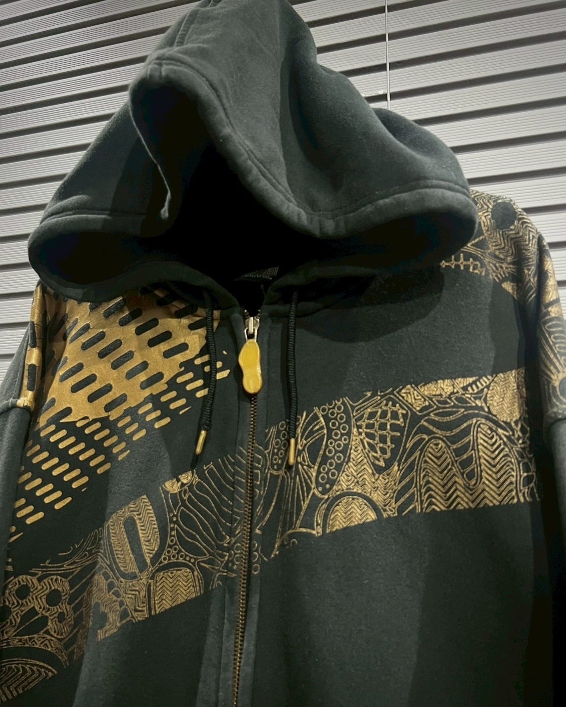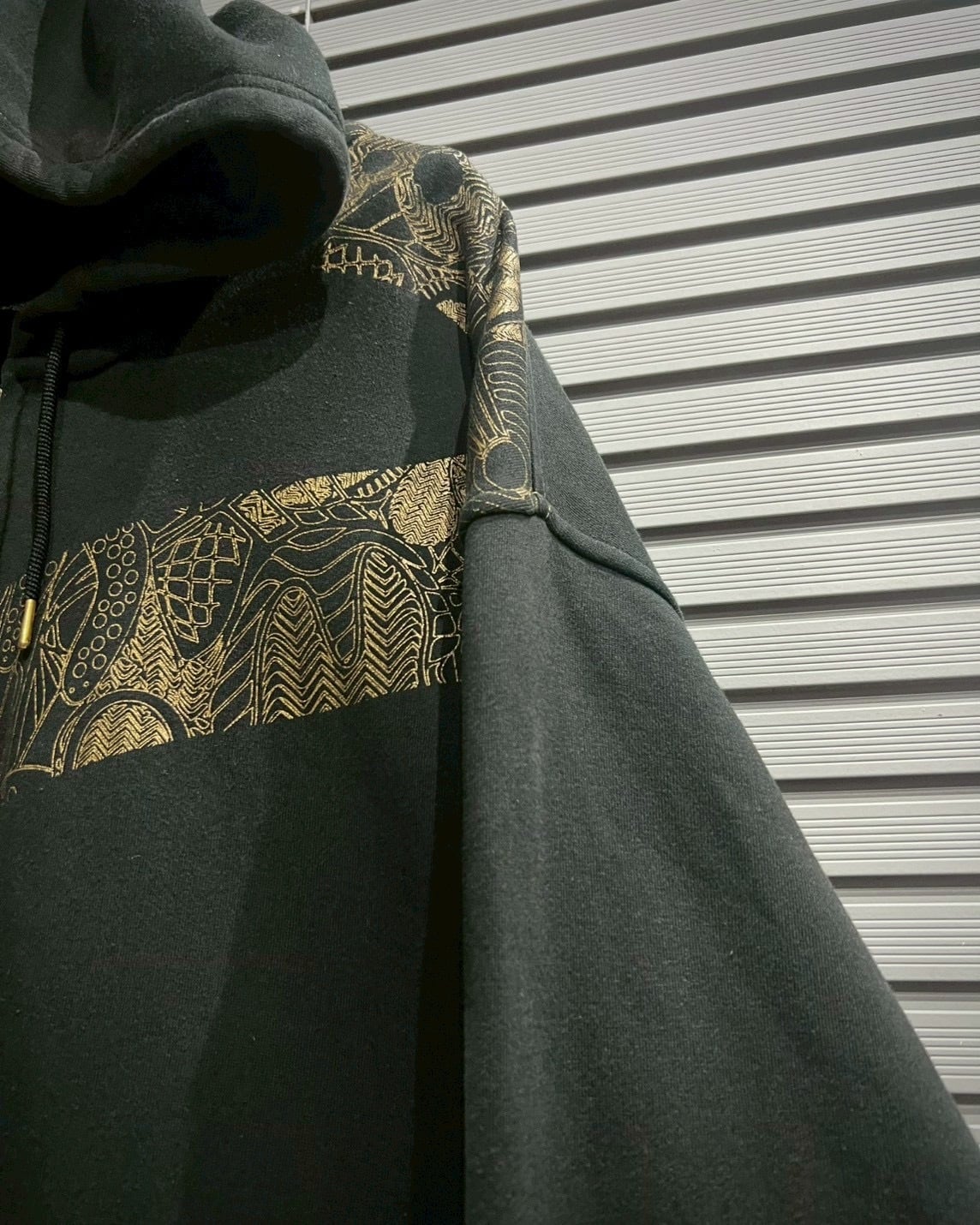 ゴールドプリントでバスケットシューズのソールパターンをモチーフ化。スリーブやショルダーを斜めに走るように大胆に配置され、ボディ全体にグラフィカルなリズムと立体感を生み出しています。