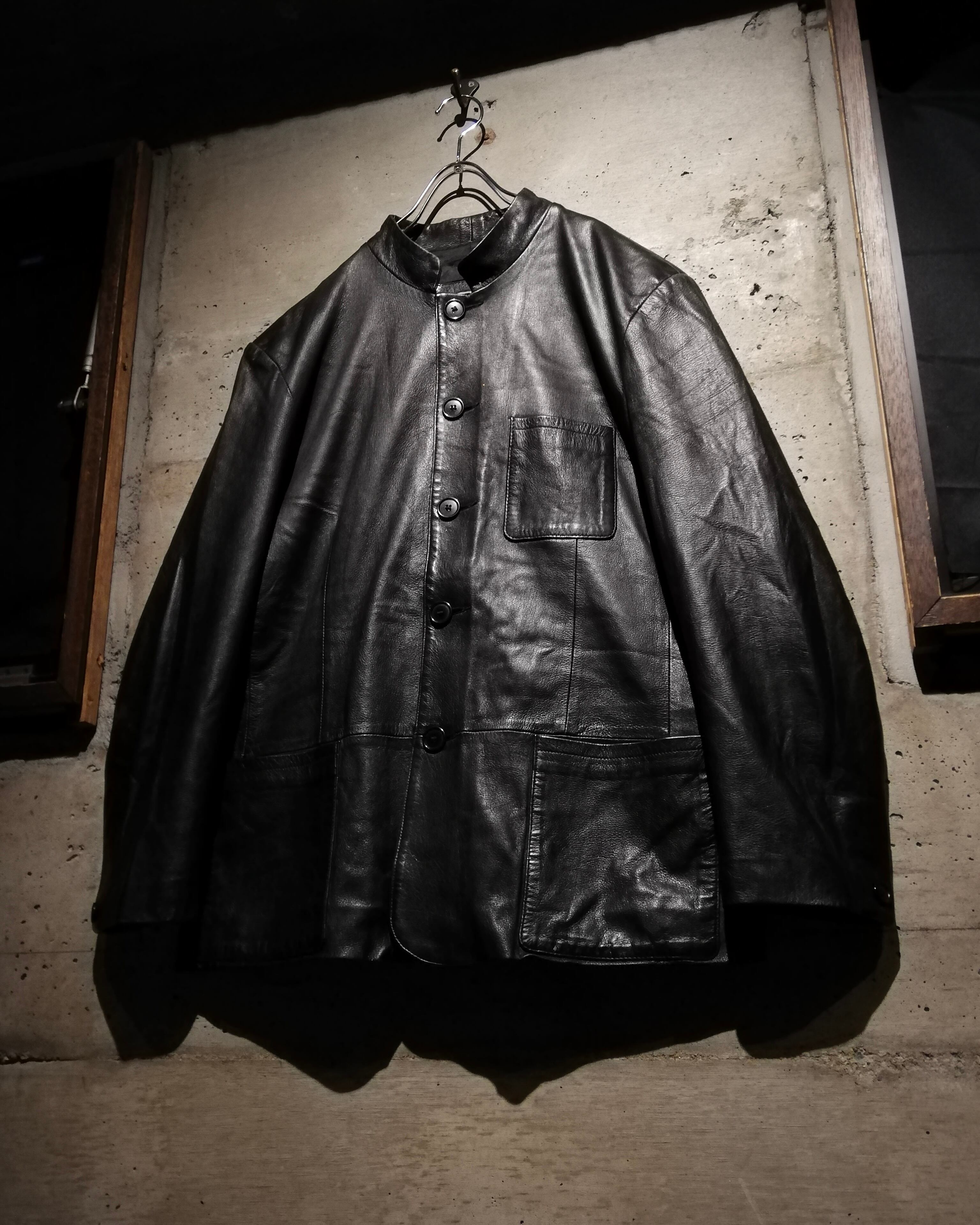 マオカラージャケットをベースにしたミニマルなデザインながら、イタリアンレザーならではのしなやかさと深い艶を纏い、無骨さとエレガンスを兼ね備えた1着。