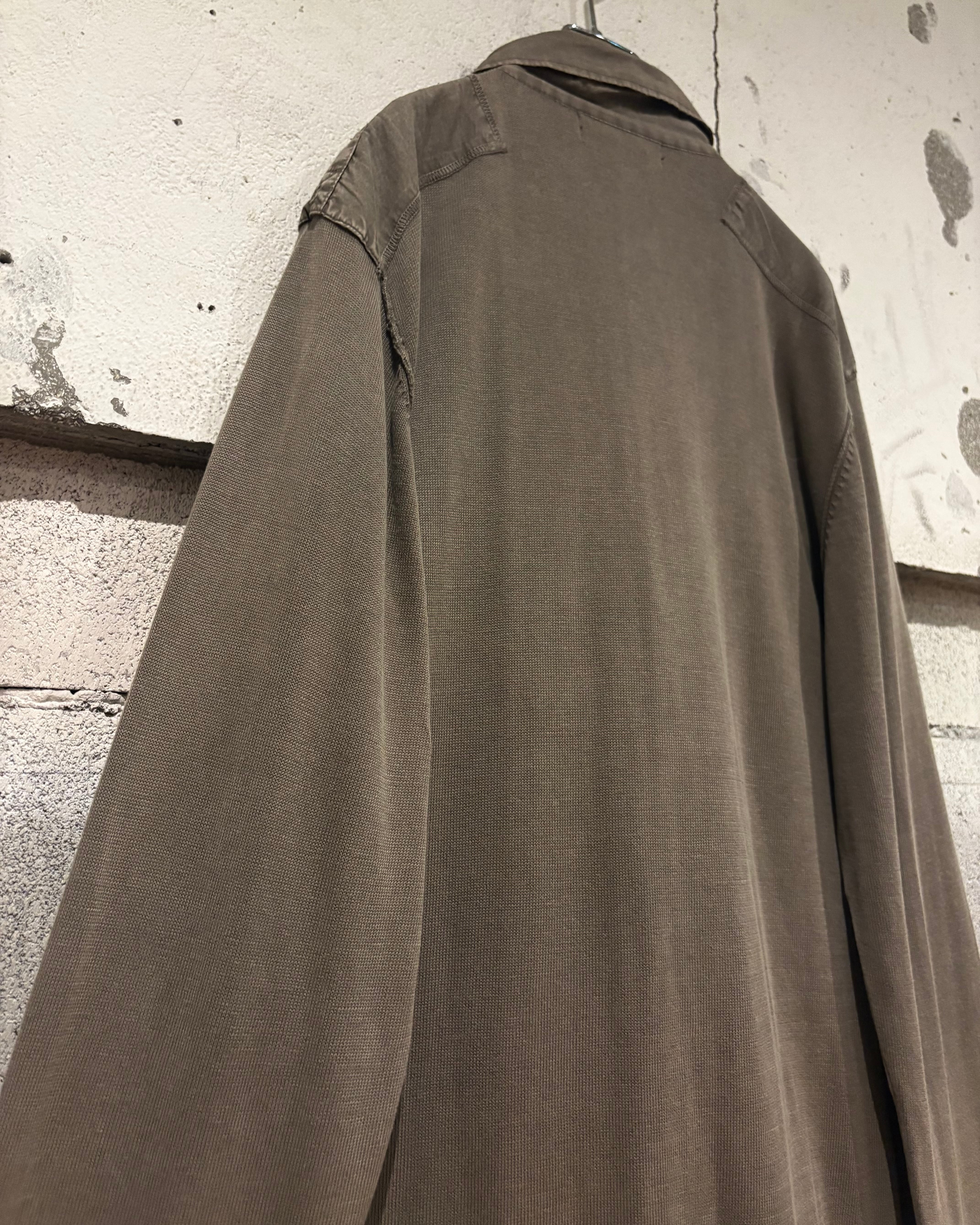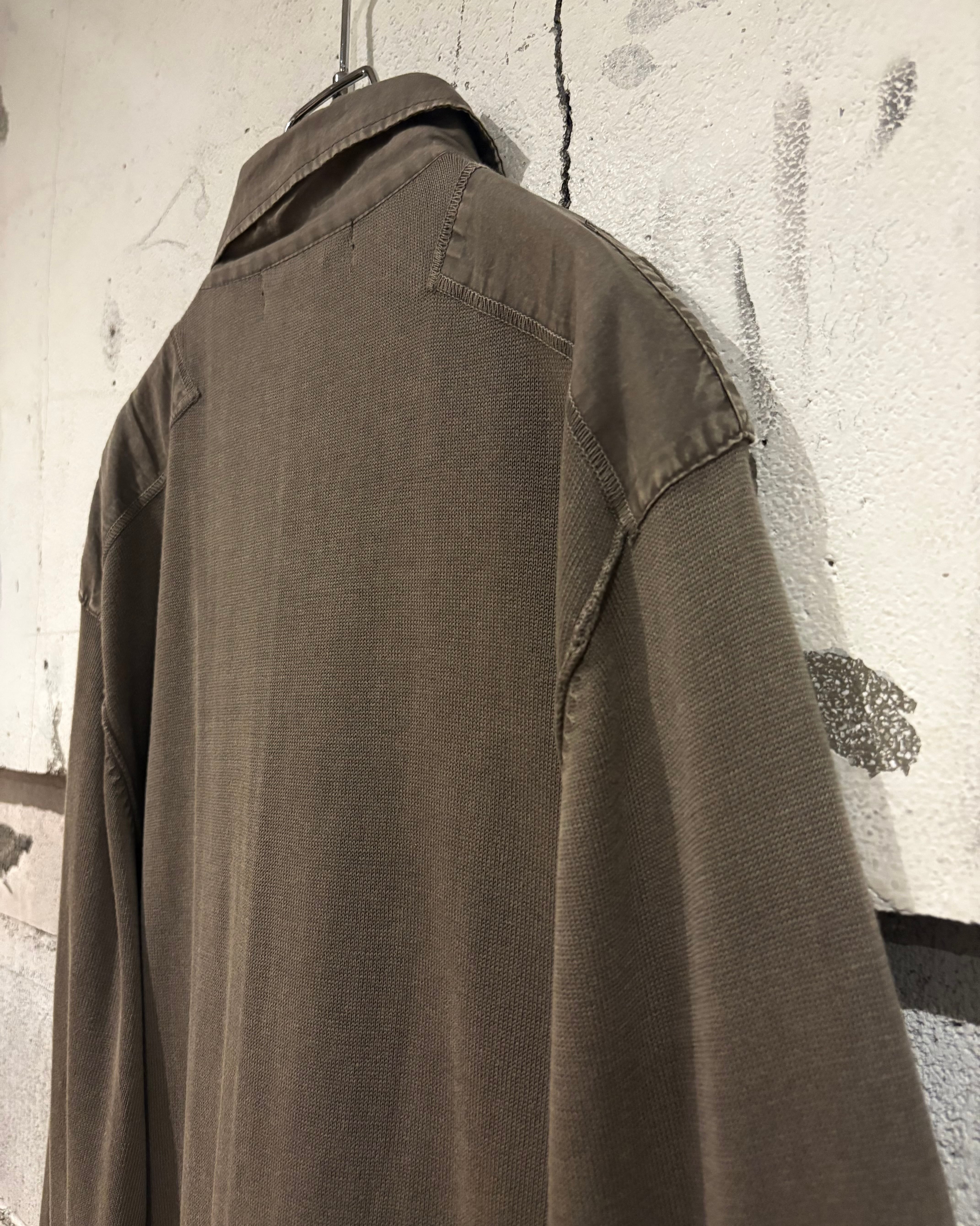 ボディ全体には柔らかなコットンニット地を採用し、肩、襟部分にはコットン織地の切り替えをプラス。編地の立体感と生地の質感が絶妙にコントラストを描き、落ち着いたグレージュトーンに深みをもたらしています。