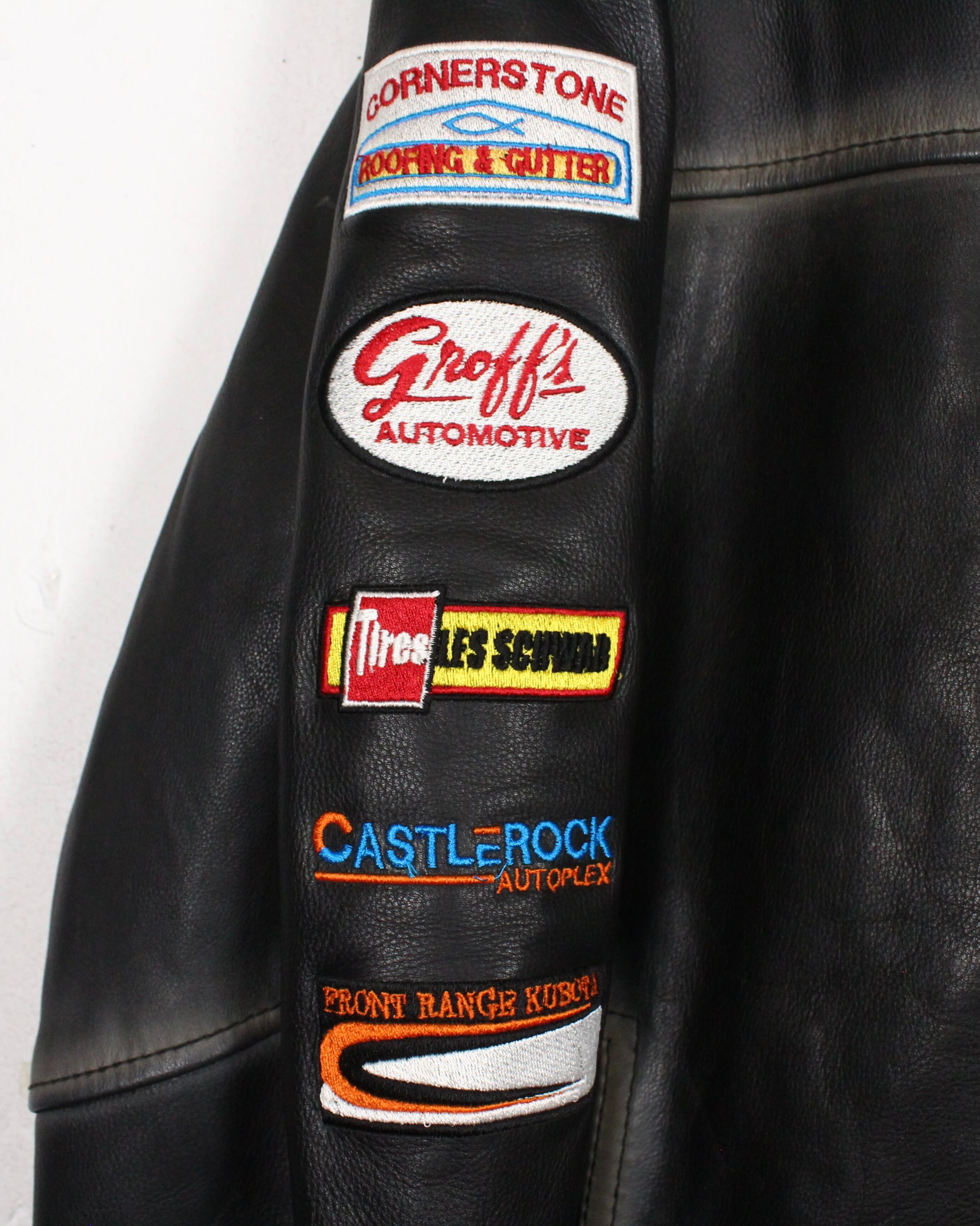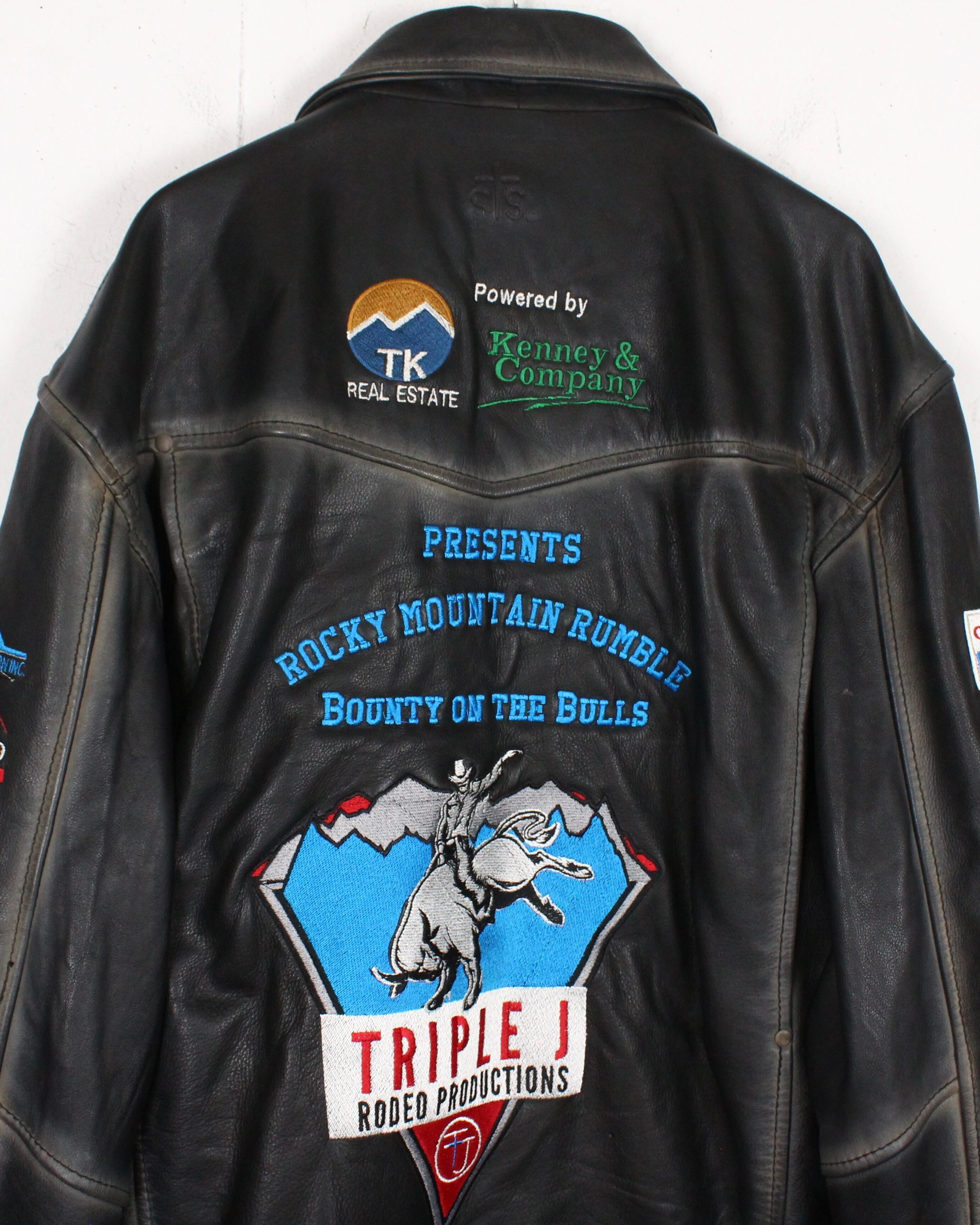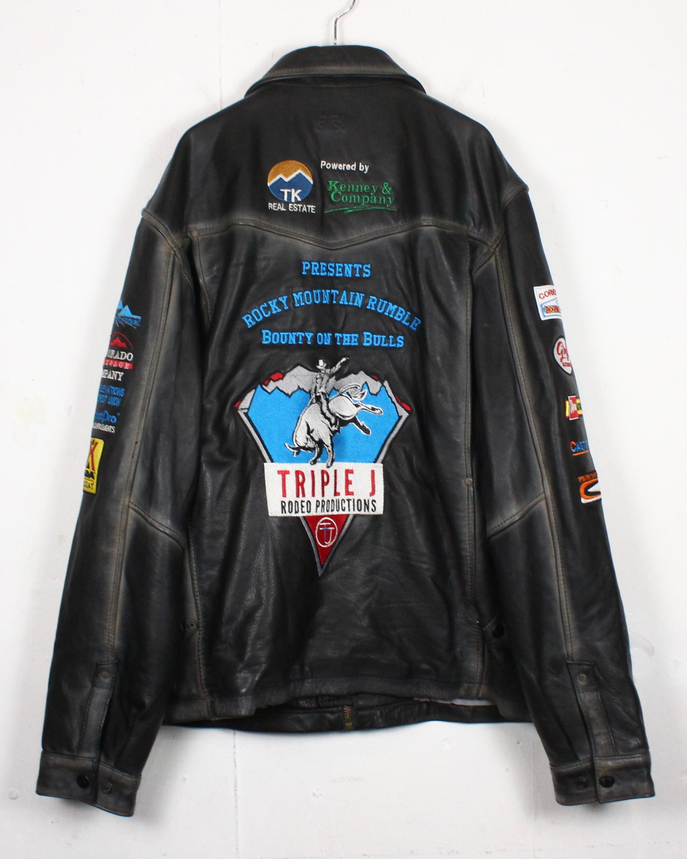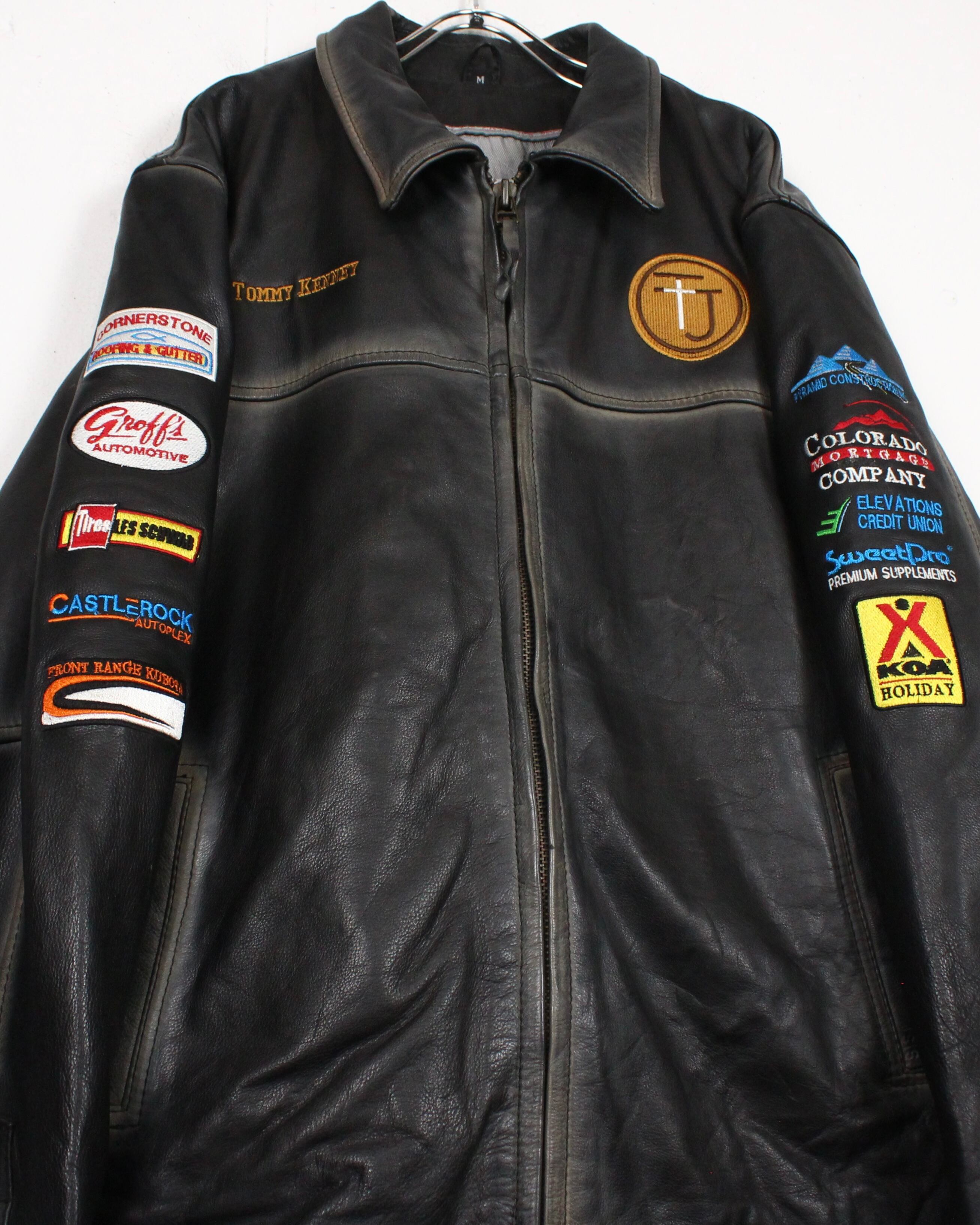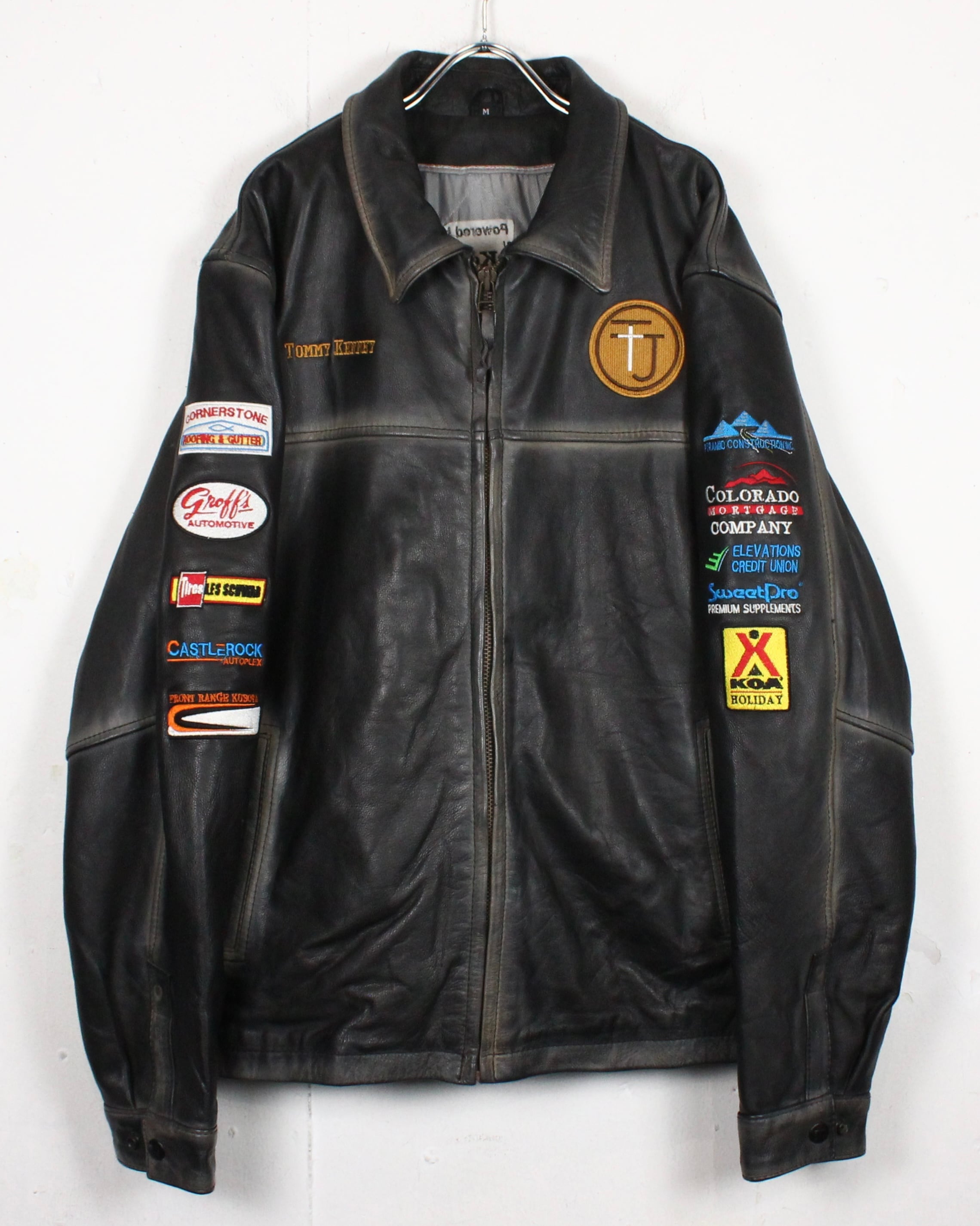 フェード加工を施したボディに、刺繍で企業のネームを刻み込んだジップアップレザージャケット。