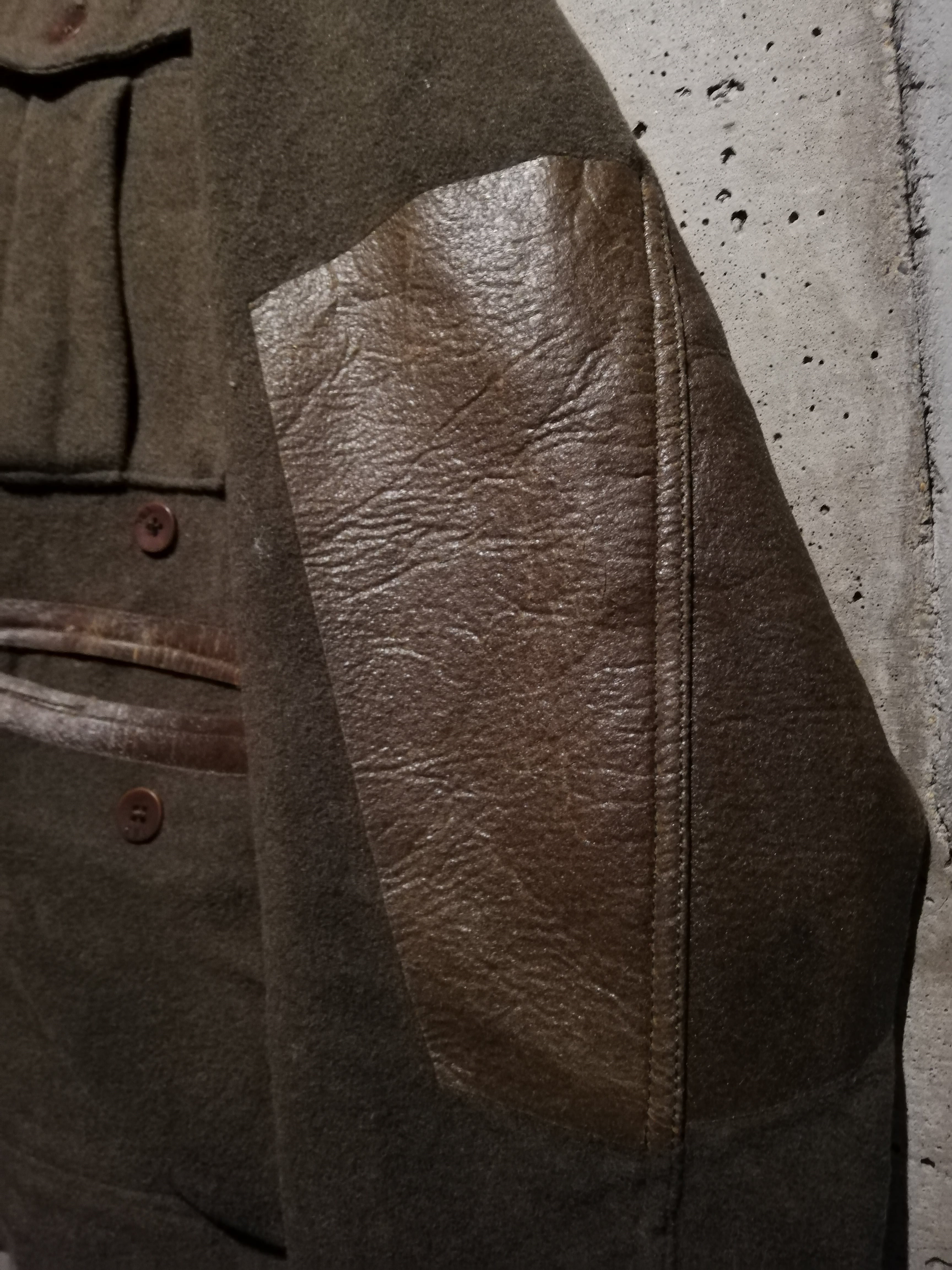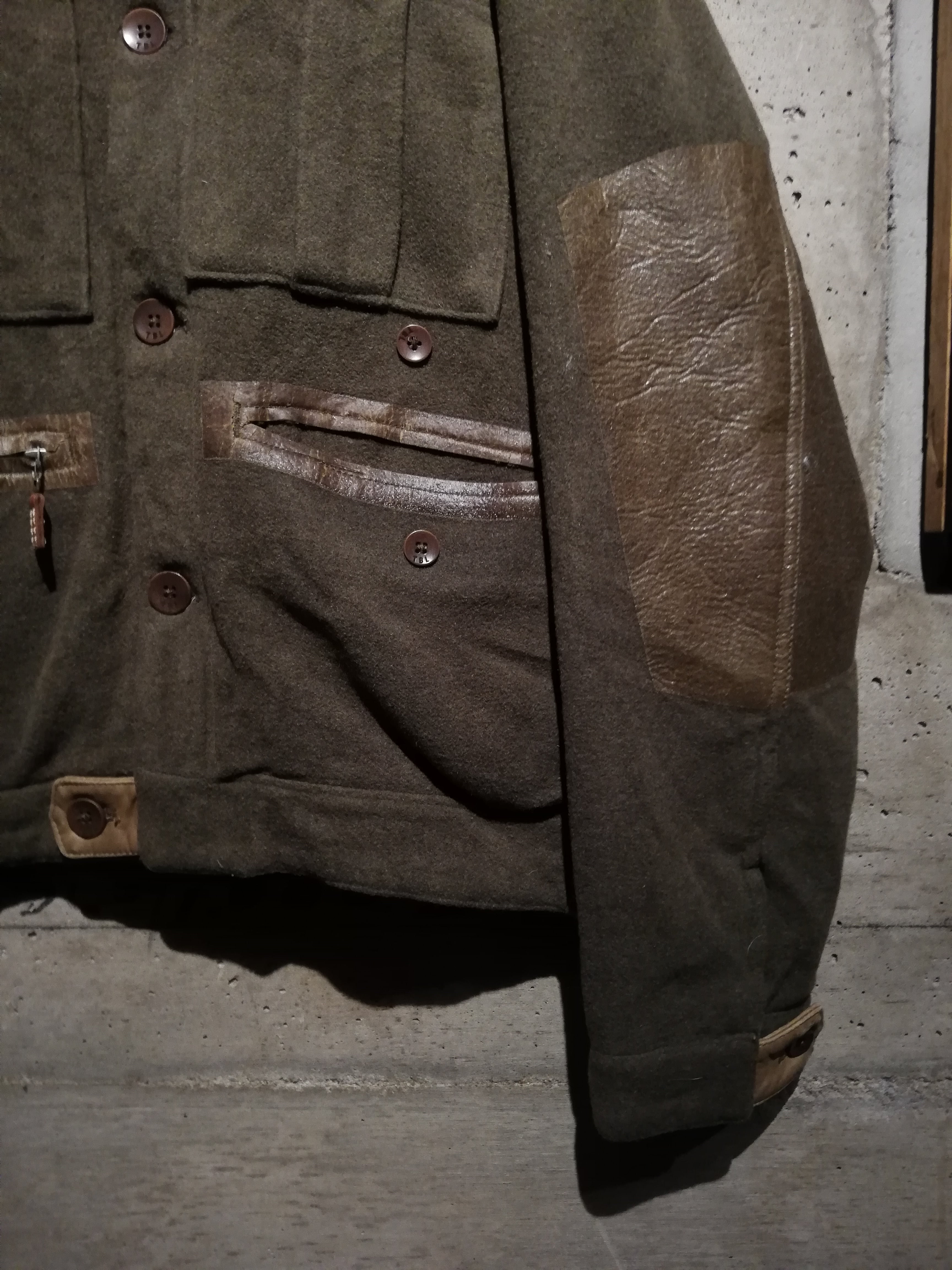 深みのあるオリーブグリーンのウールボディをベースに、袖やポケット周りに異素材を切り替えたコンビデザインが特徴。マットな質感とわずかな色差が生み出す立体的な表情が、ジャケット全体を引き締めています。フロントには4つのフラップポケットとジップポケットを備え、実用性とデザイン性を兼備。ボタンやベルトのディテールもミリタリーライクな雰囲気を漂わせます。