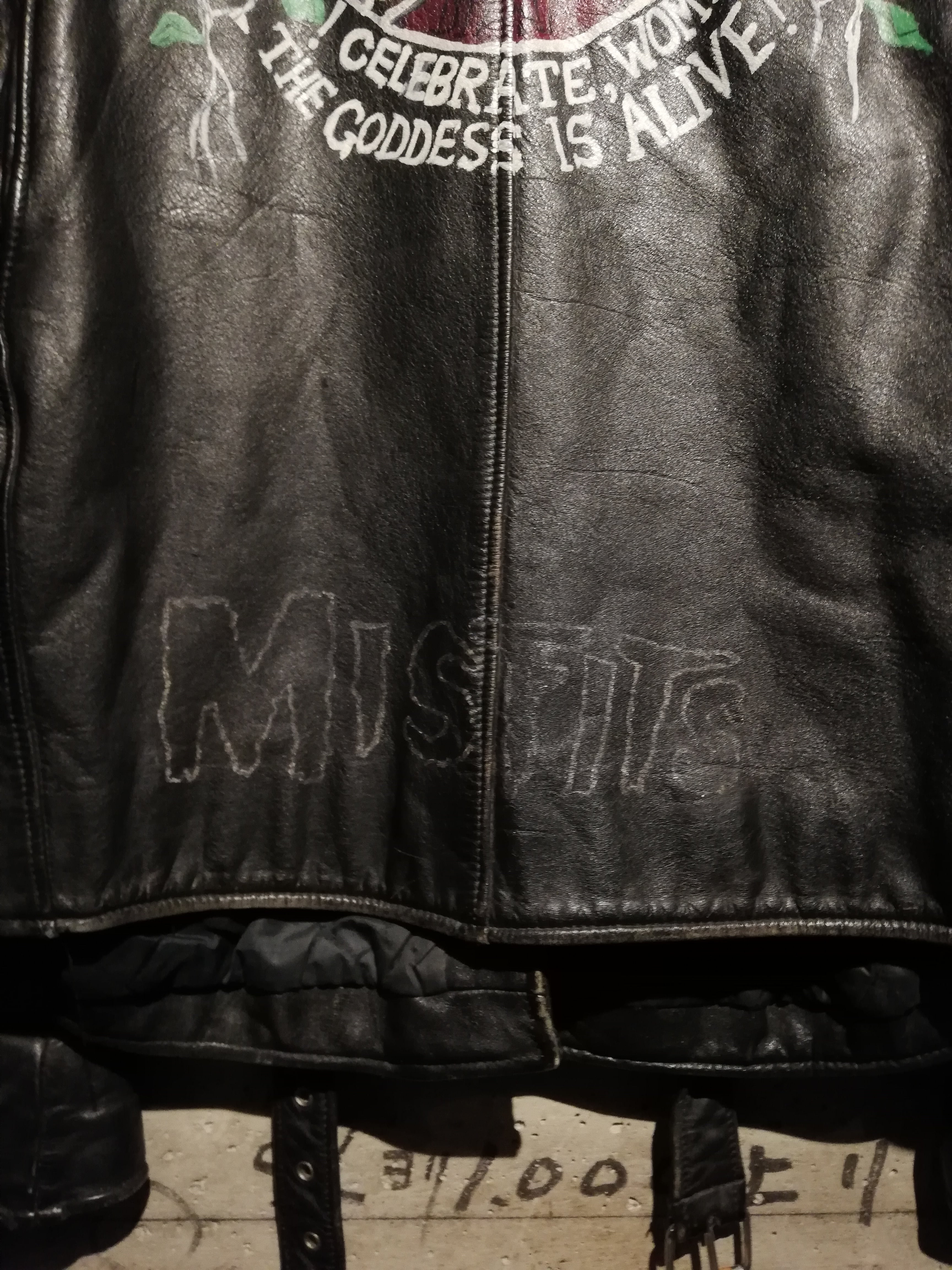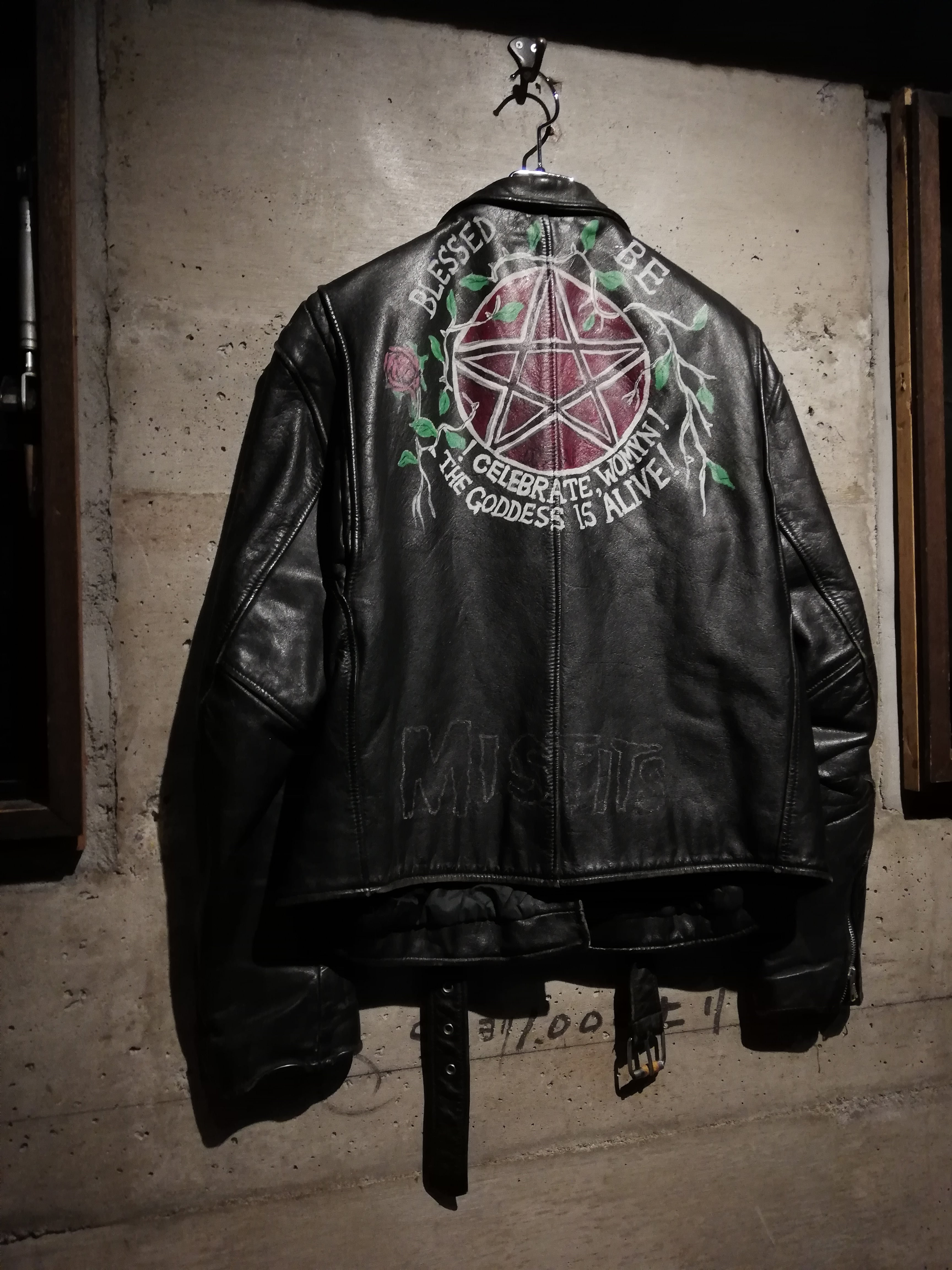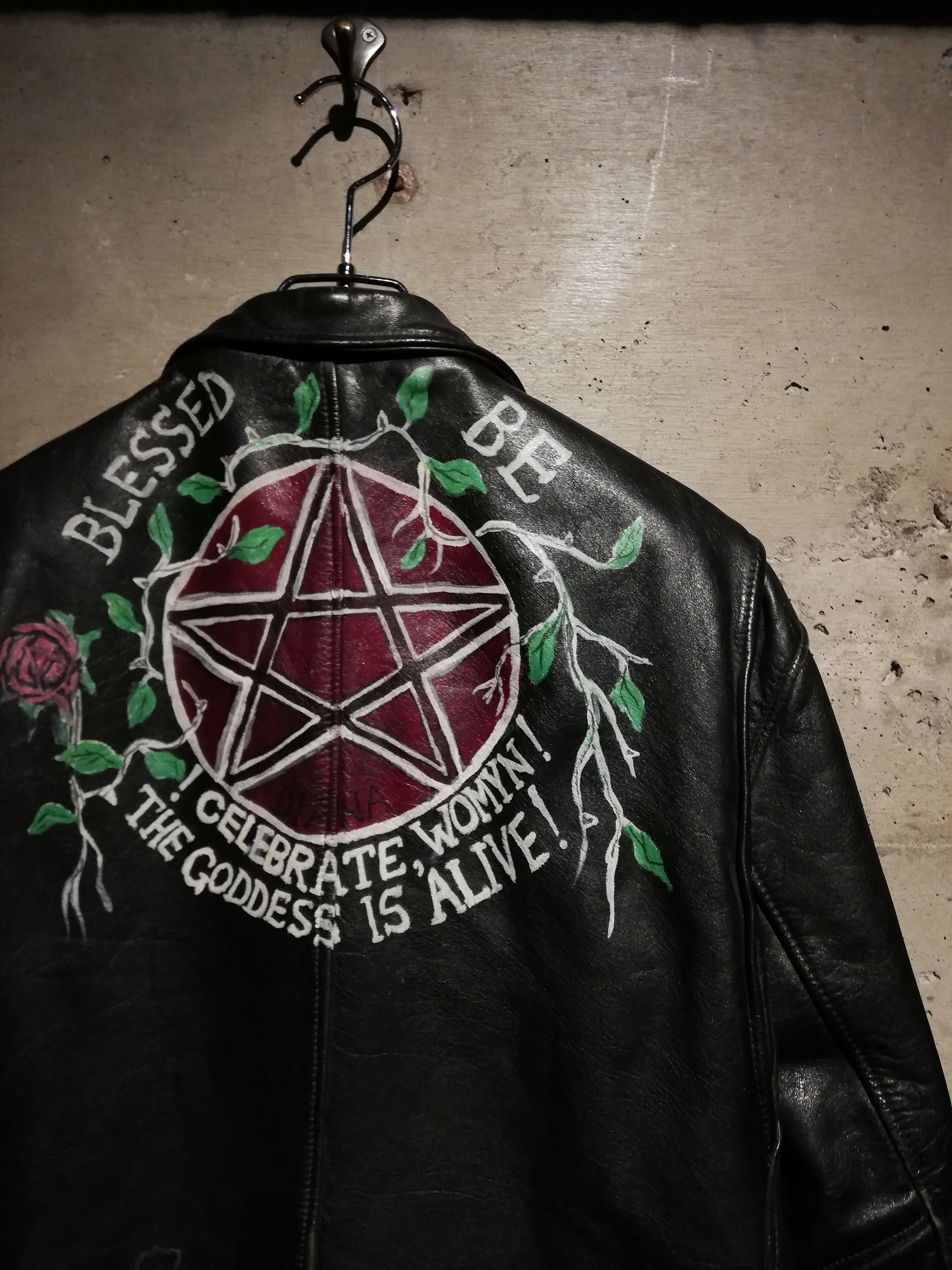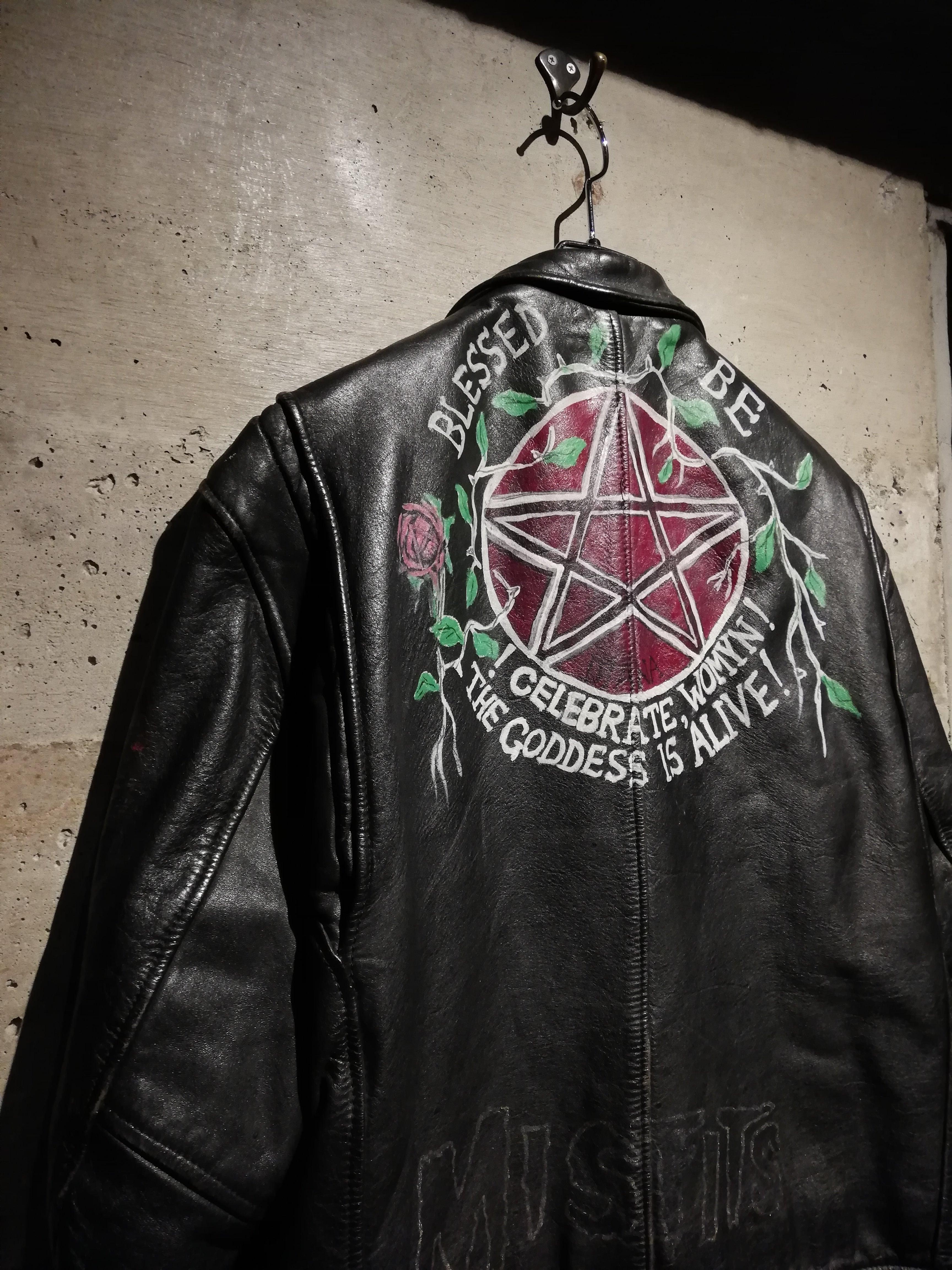 背面には「BLESSED BE」「CELEBRATE WOMAN! THE GODDESS IS ALIVE!」のメッセージとともに、ペンタグラムとバラ、蔦を組み合わせた印象的なアートワークが描かれています。レザーの質感に馴染む経年のクラックやフェードも含め、長い年月をかけて完成した唯一無二の表情。まさにカルチャーとパーソナリティが融合したリアルな“アートピース”。