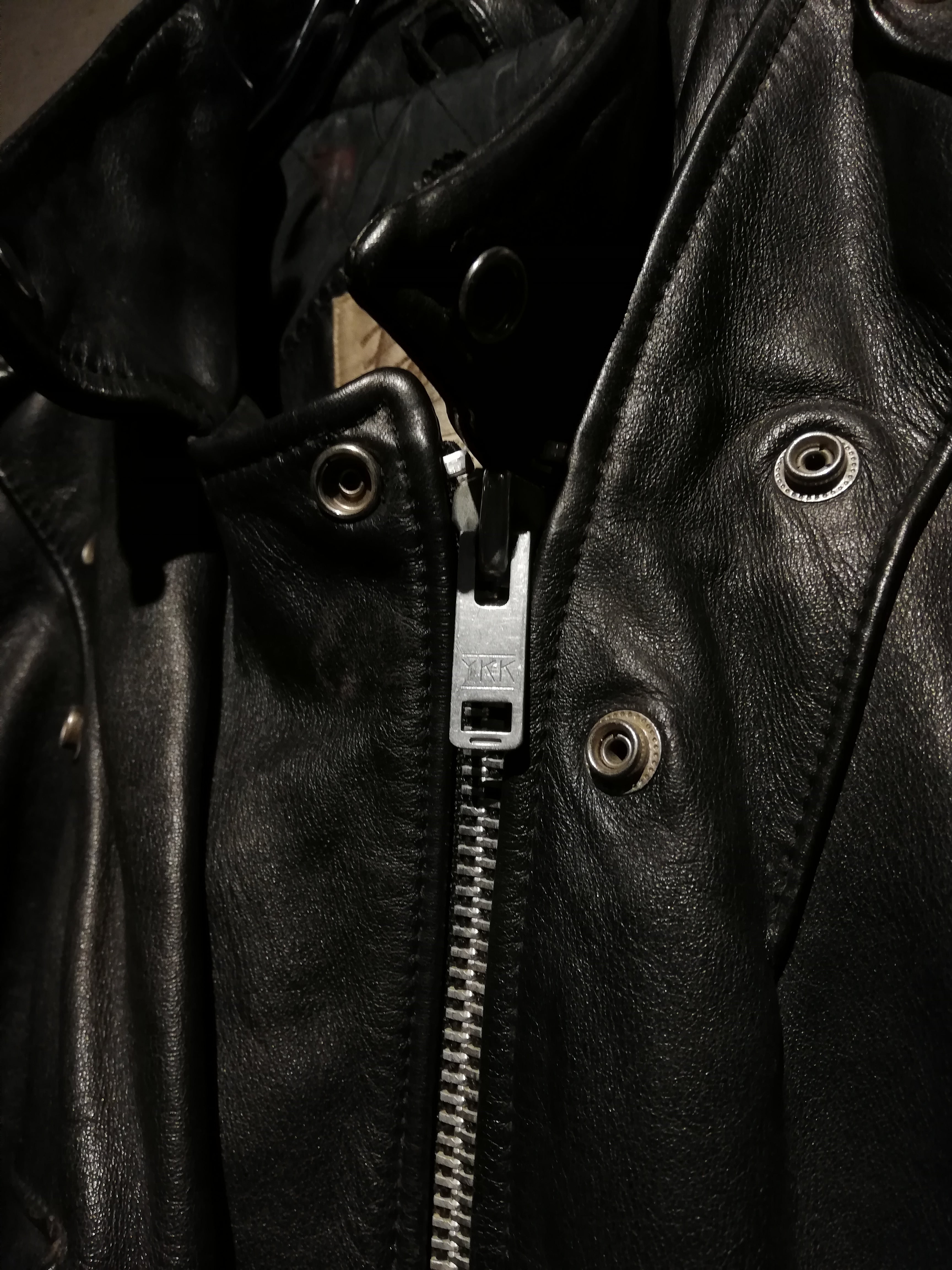 しなやかで厚みのあるレザーを採用し、ダブルライダースならではの無骨なディテールエポーレット、ウエストベルト、フラップポケットをフル装備。YKKジップやキルティングライナーなど、当時のアメリカンレザーらしい重厚な仕立ても健在です。