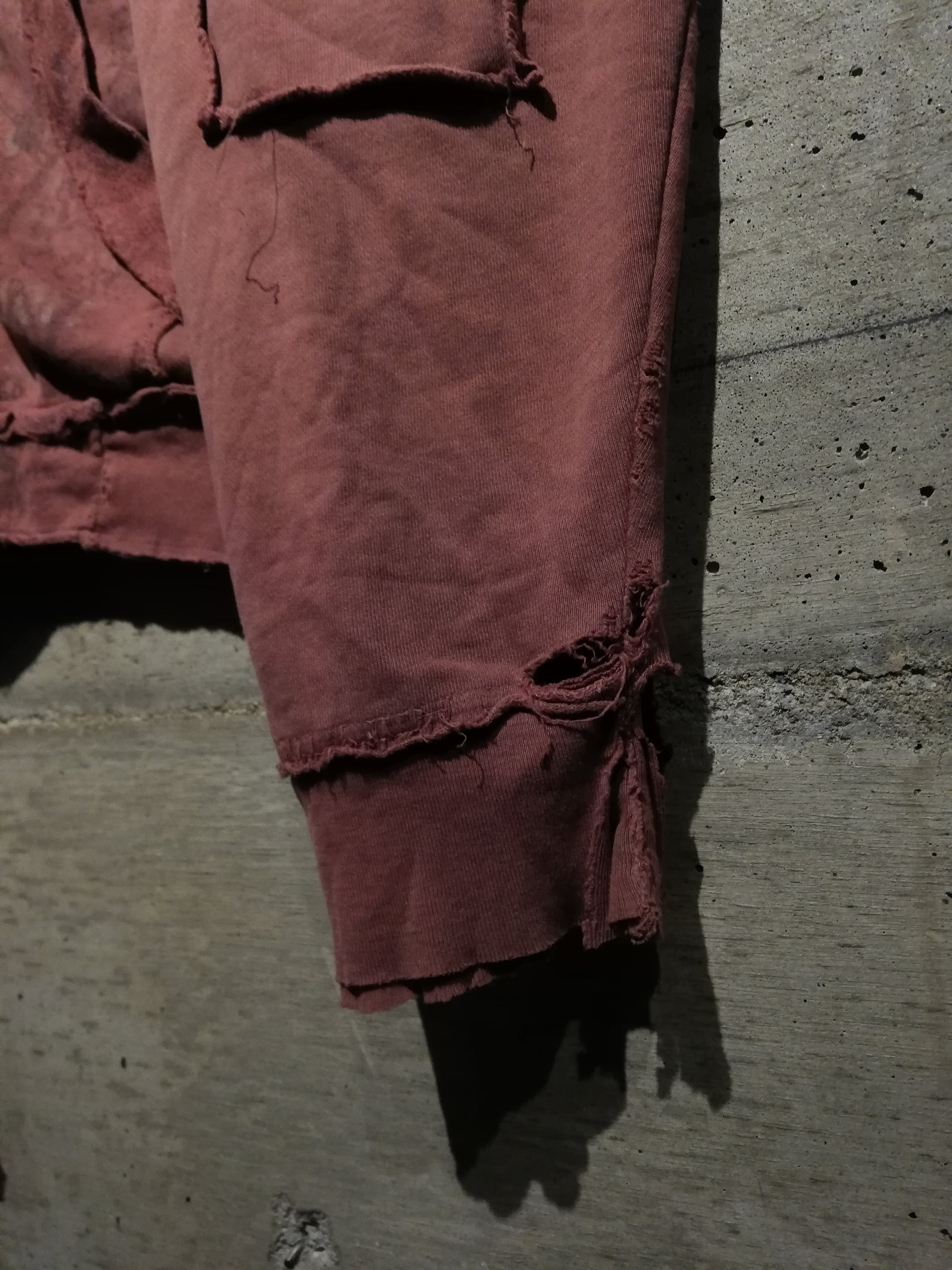 バーガンディトーンのボディにブリーチウォッシュ加工を施し、フロントには宗教画のようなモチーフ、バックにはスカルとトライバルを融合させた象徴的なグラフィックを配置。染めのムラやプリントの掠れ、カットオフされた袖やポケット周りのラフな縫製が、退廃的でありながらアートピースのような迫力を生み出しています。