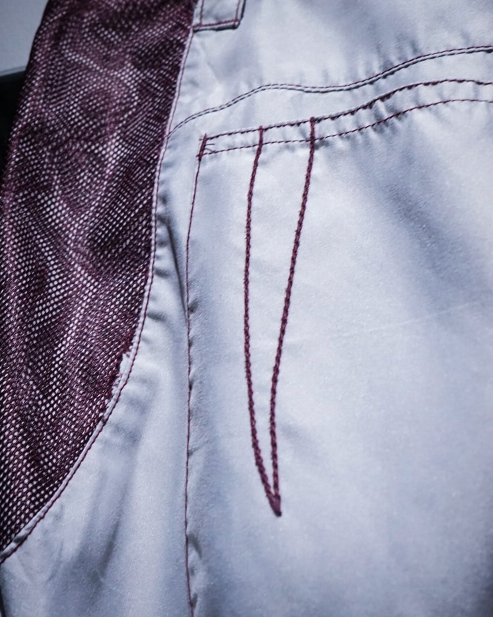 随所にあしらわれたワインレッドのメッシュポケットが立体感を生み、スポーティーかつアヴァンギャルドなムードを強調しています。