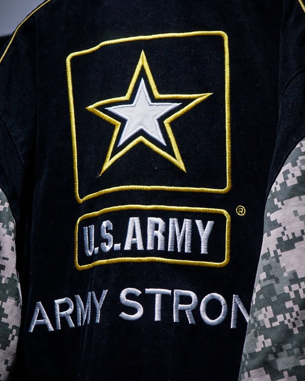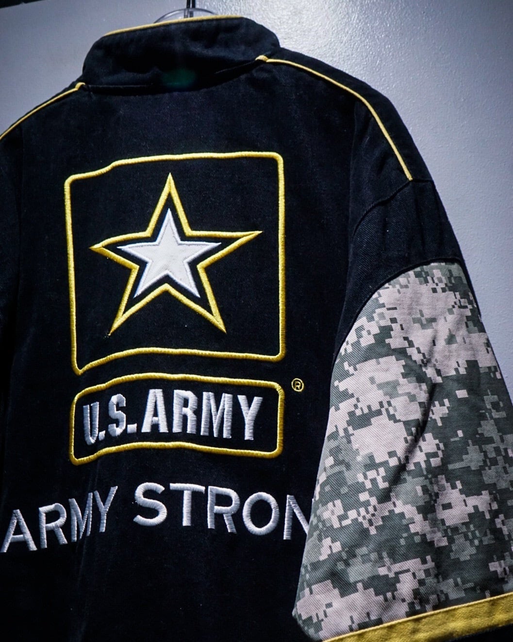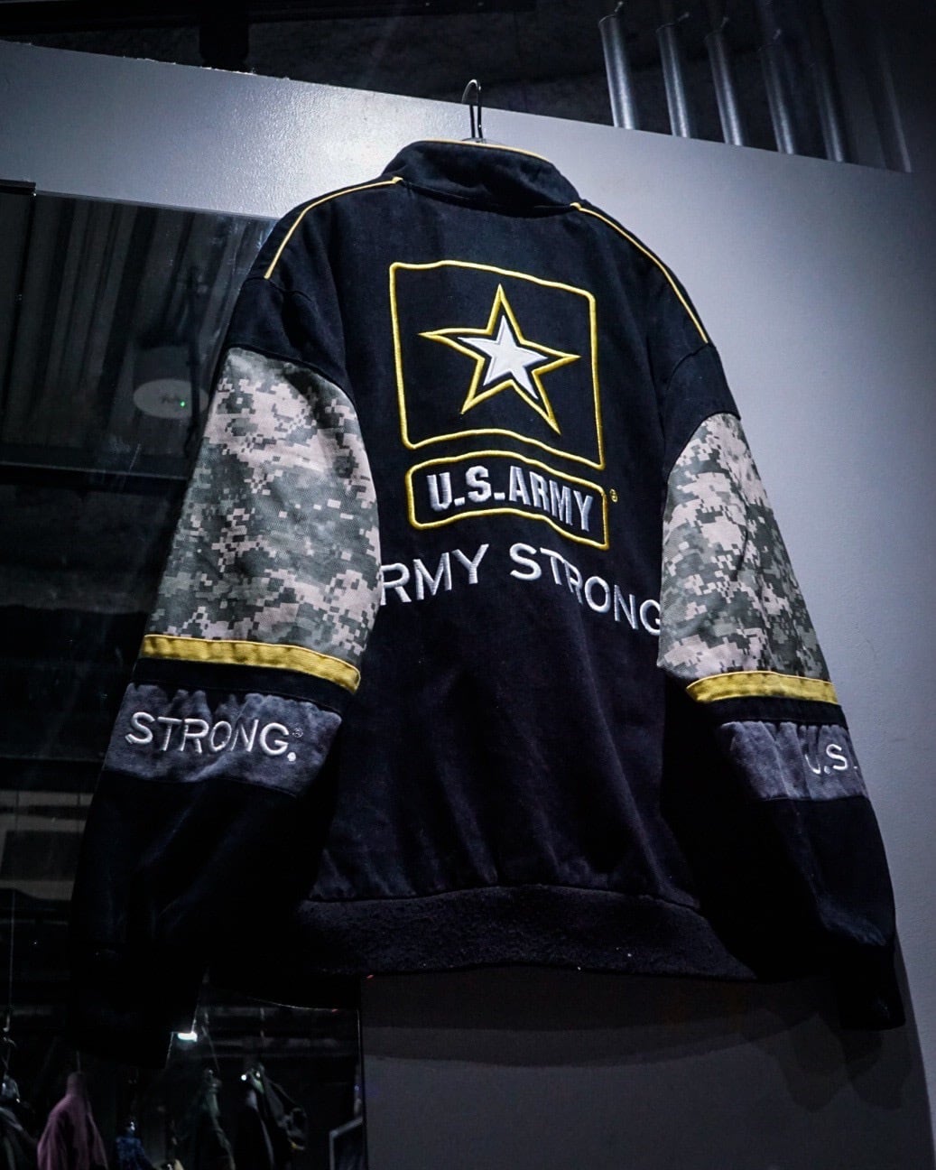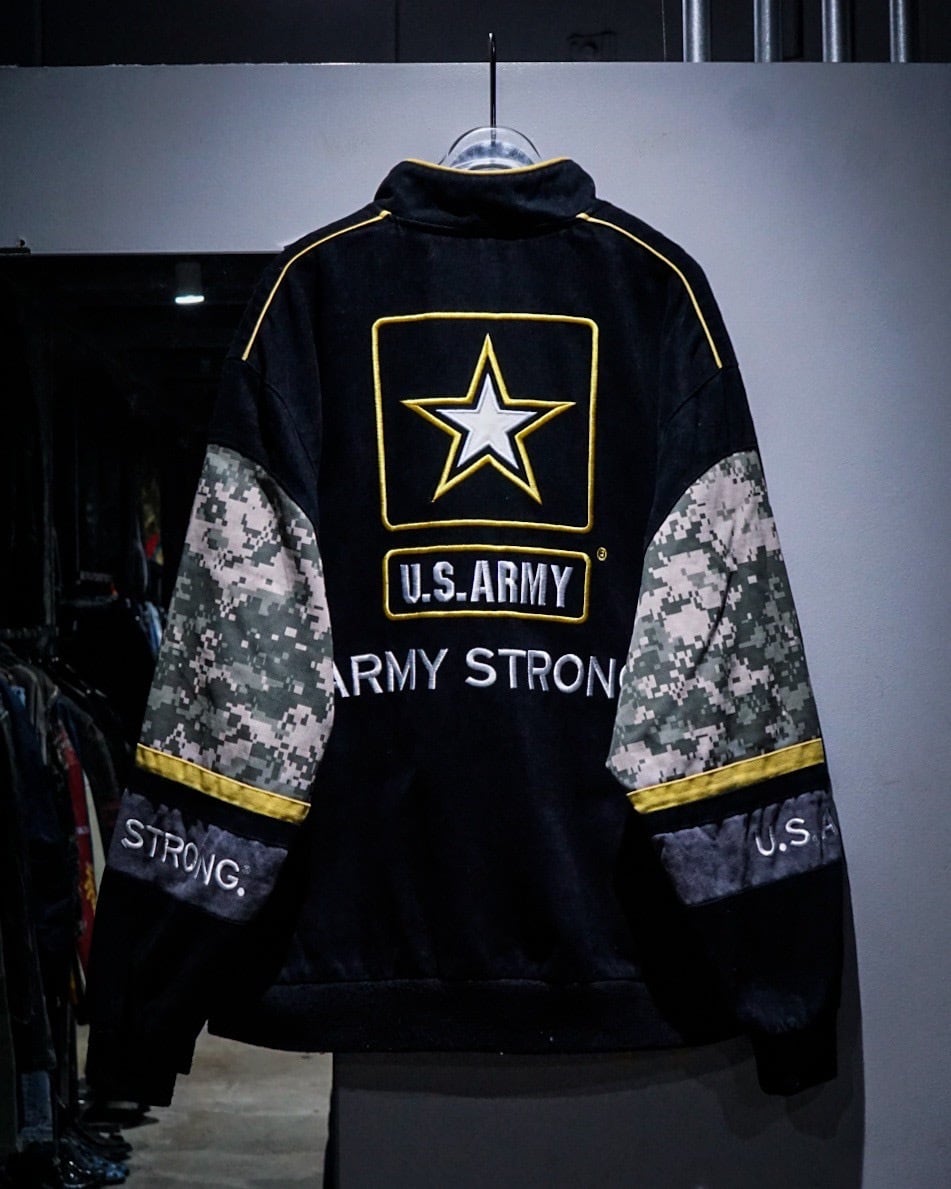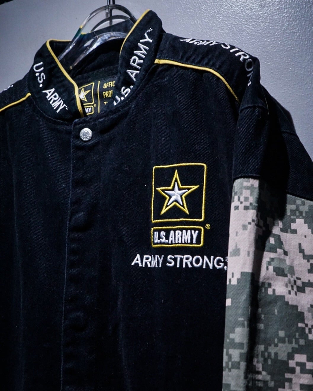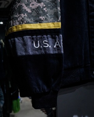 ボディは深みのあるブラックをベースに、両袖にはデジタルカモを切り替え。さらにイエローのパイピングを挟み込みながら、「U.S. ARMY」や「ARMY STRONG」といった刺繍を随所に配置。アメリカンミリタリーの象徴とも言える星マークのロゴが、フロント、背面両面にドカンと鎮座し、唯一無二の存在感を放ちます。