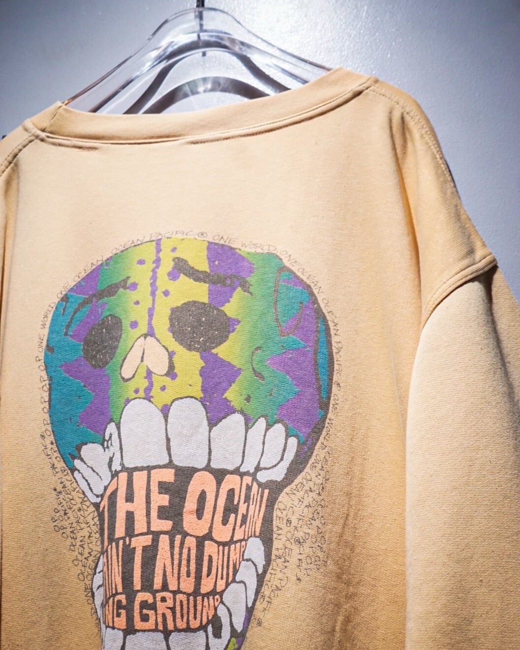 ボディはハリとコシのあるスウェット生地を採用し、淡いオレンジのトーンで構成された柔らかな表情。フロントには“THE OCEAN AIN’T NO DUMPING GROUND”とメッセージを掲げたアーティスティックなスカルプリントを大胆に配置。