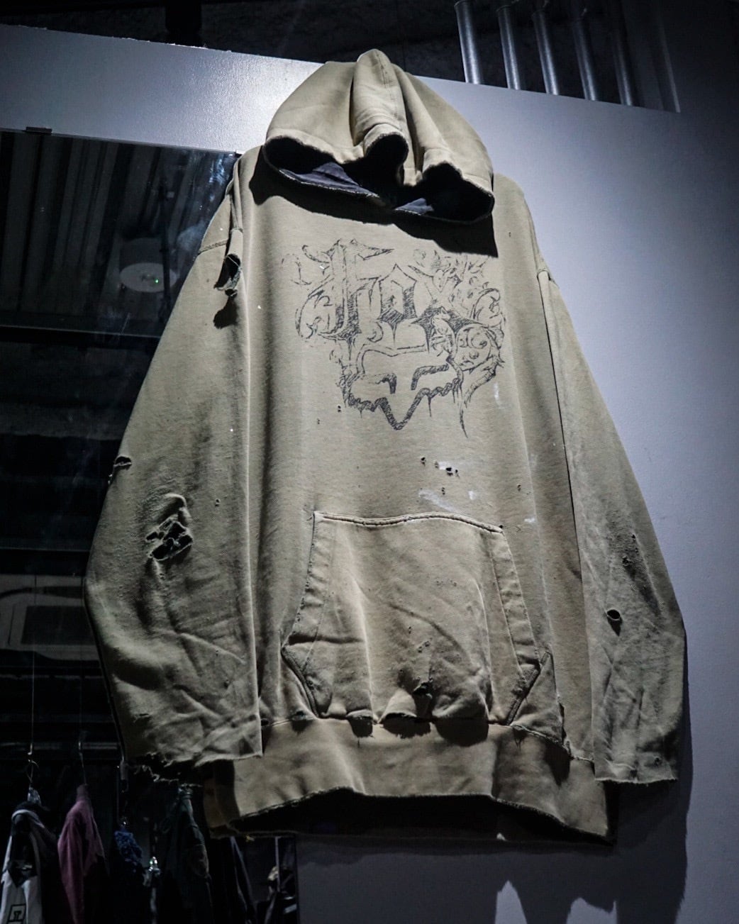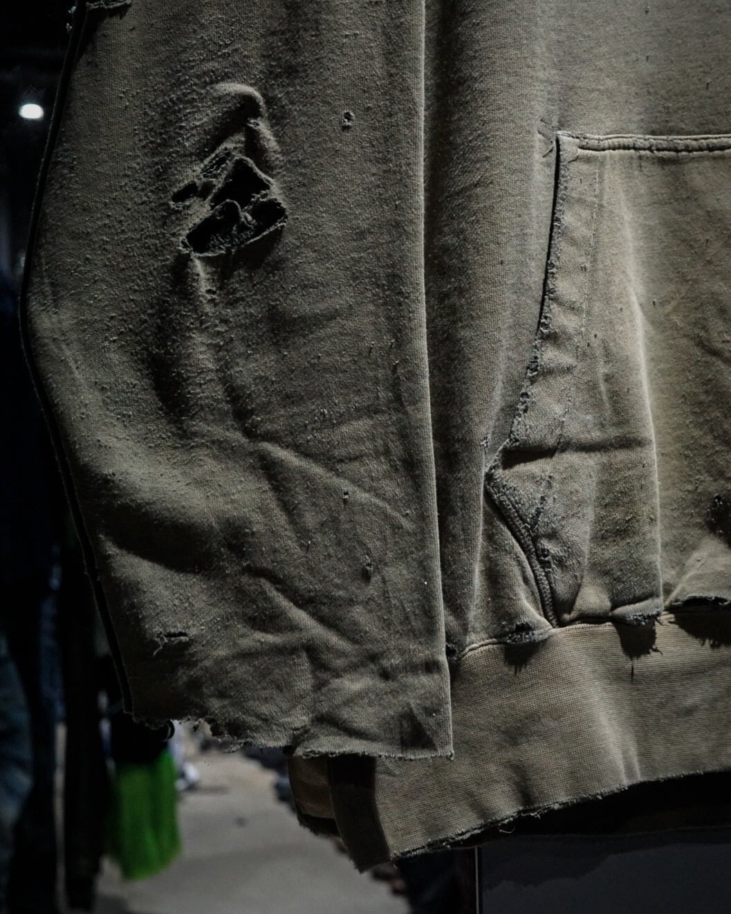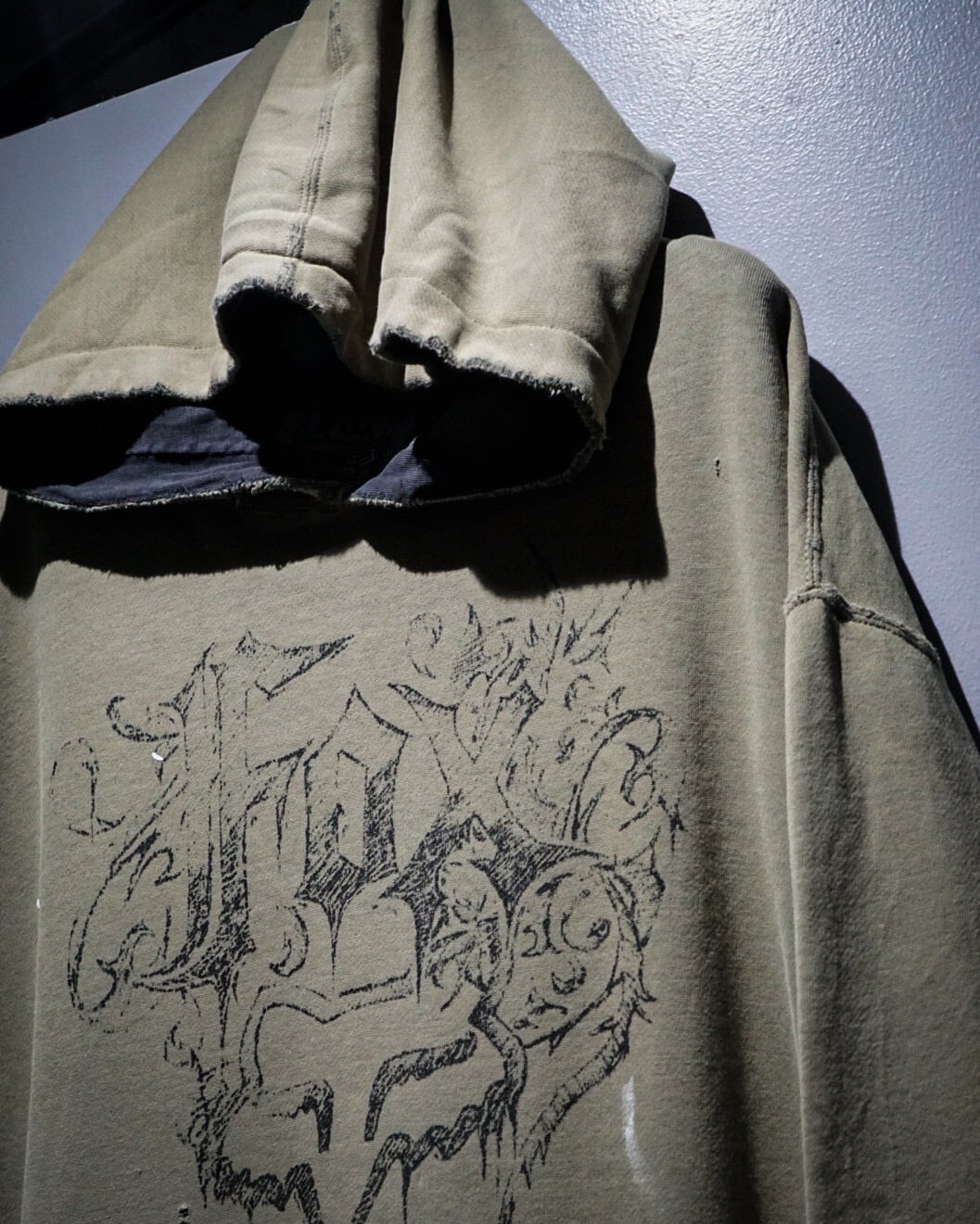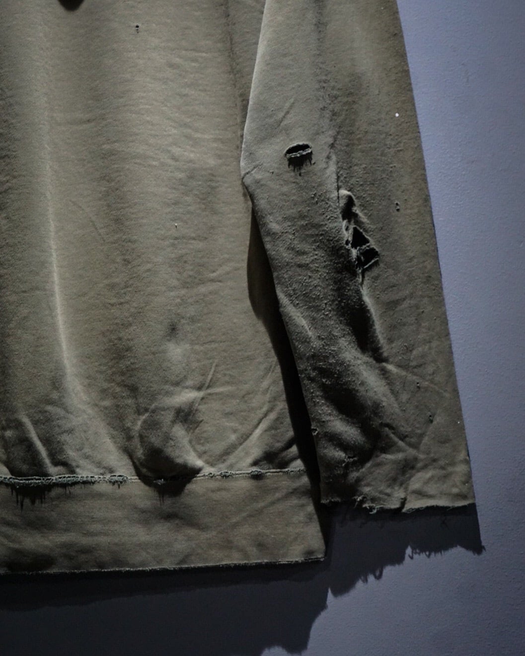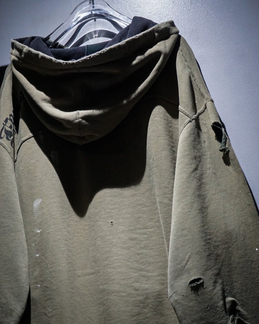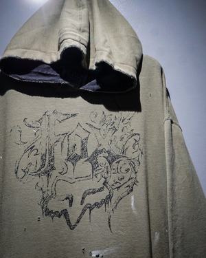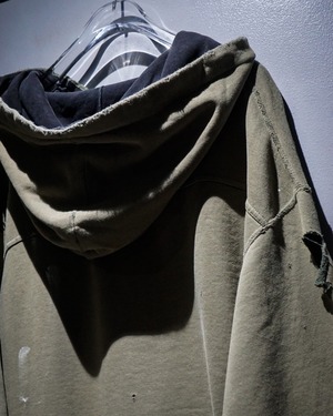 ベースはオリーブカーキのスウェット生地。褪色したボディにブリーチ跡やペンキの飛びが混在し、自然に生まれたダメージが唯一無二な表情を作り上げています。袖口や裾の解れ、フード部分のダメージもリアルで、ヴィンテージスウェットの“生きた質感”を堪能できる仕上がり。
