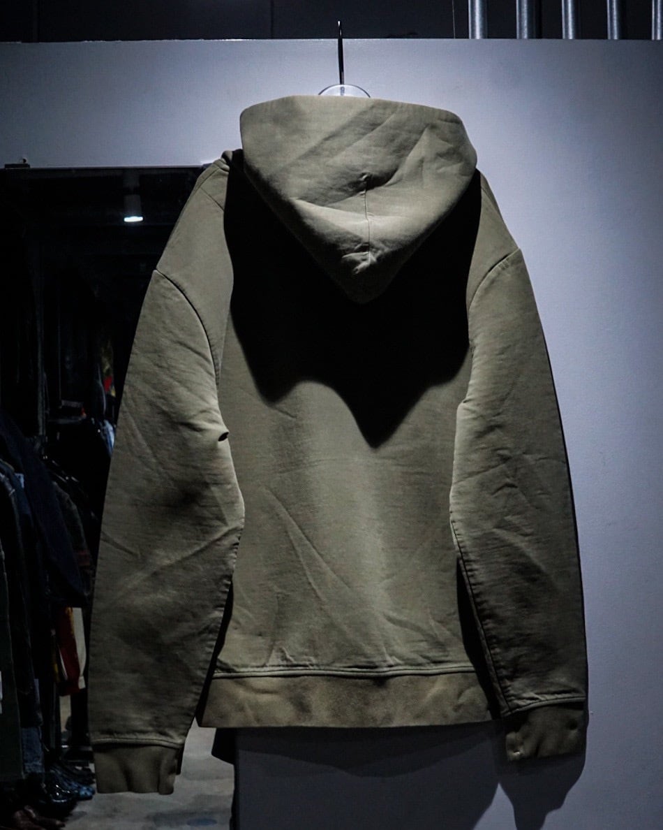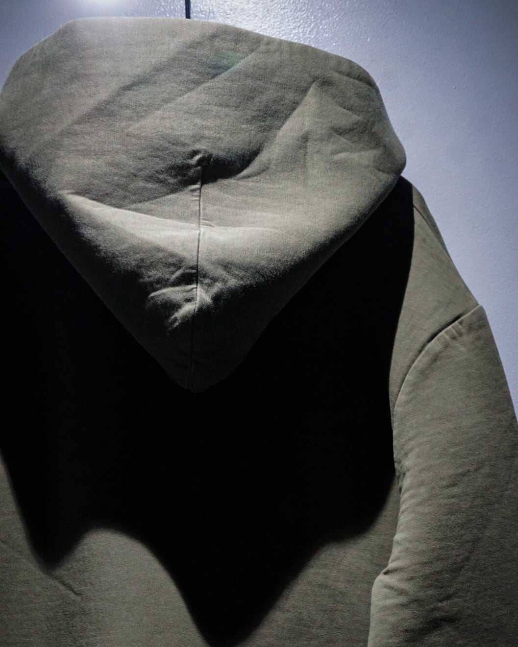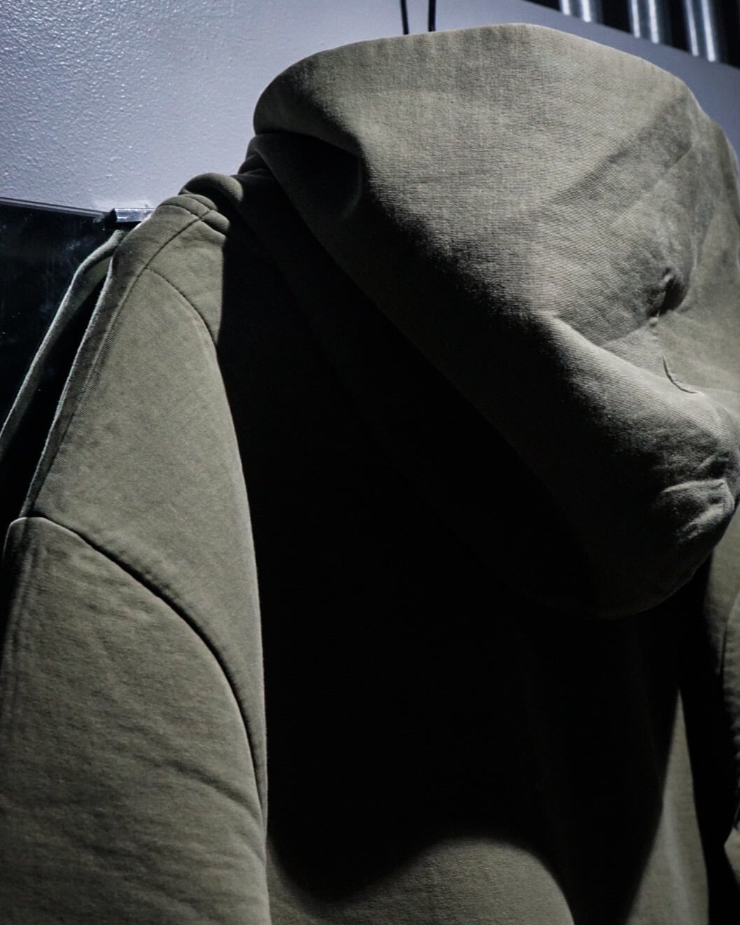 ネック部分に2つのスナップボタンを配した独特のハイネックフードデザインが特徴で、開閉によって首元の表情を変化させられる構造。カンガルーポケットやリブ仕様の袖・裾が全体を引き締め、ボンディングならではの構築的なフォルムを際立たせています。