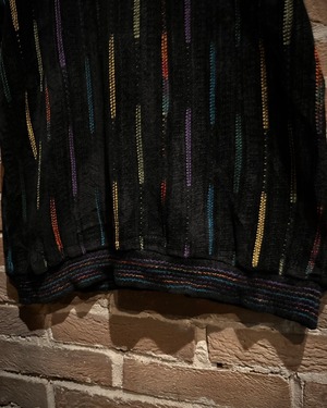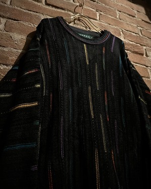 ベースは深みのあるブラックボディ。その上にブルー、パープル、イエロー、レッドといった多色の糸をランダムに走らせたマルチストライプパターンを採用。糸の凹凸によって生まれる立体的な編み地と、部分的に輝く糸の光沢が視覚的なリズムを生み出します。
