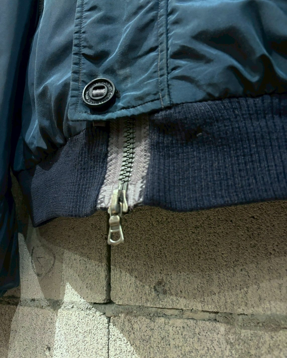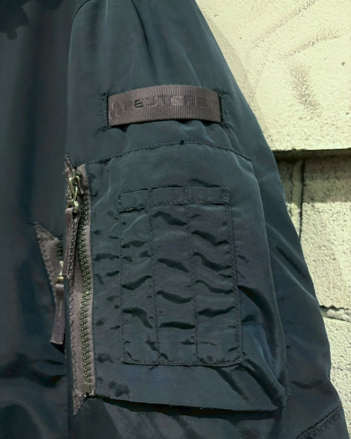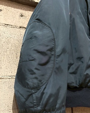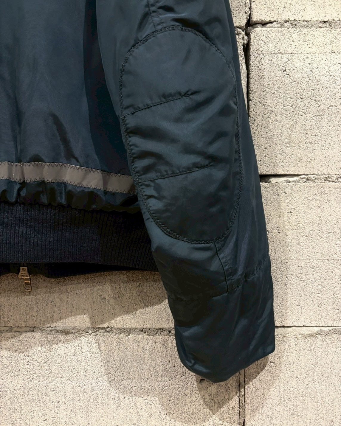 フロントはジップ+ボタンのダブルクロージャー仕様。袖にはフライトジャケットらしいユーティリティポケットを配置し、バックにはリフレクティブテープを走らせることで機能美を強調。ナイロン特有の艶感が角度によって表情を変え、スポーティでありながらもラグジュアリーな佇まいを演出します。