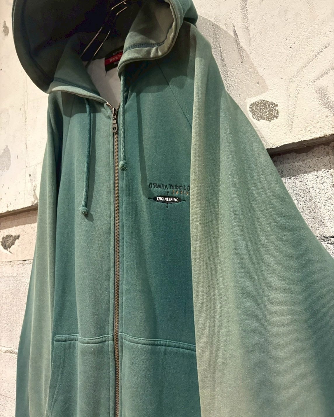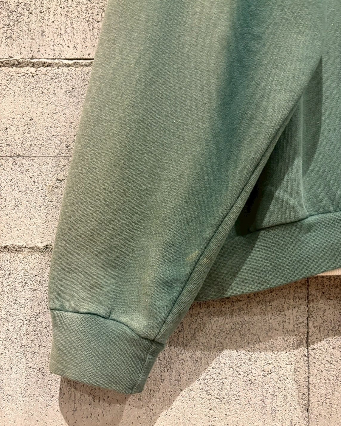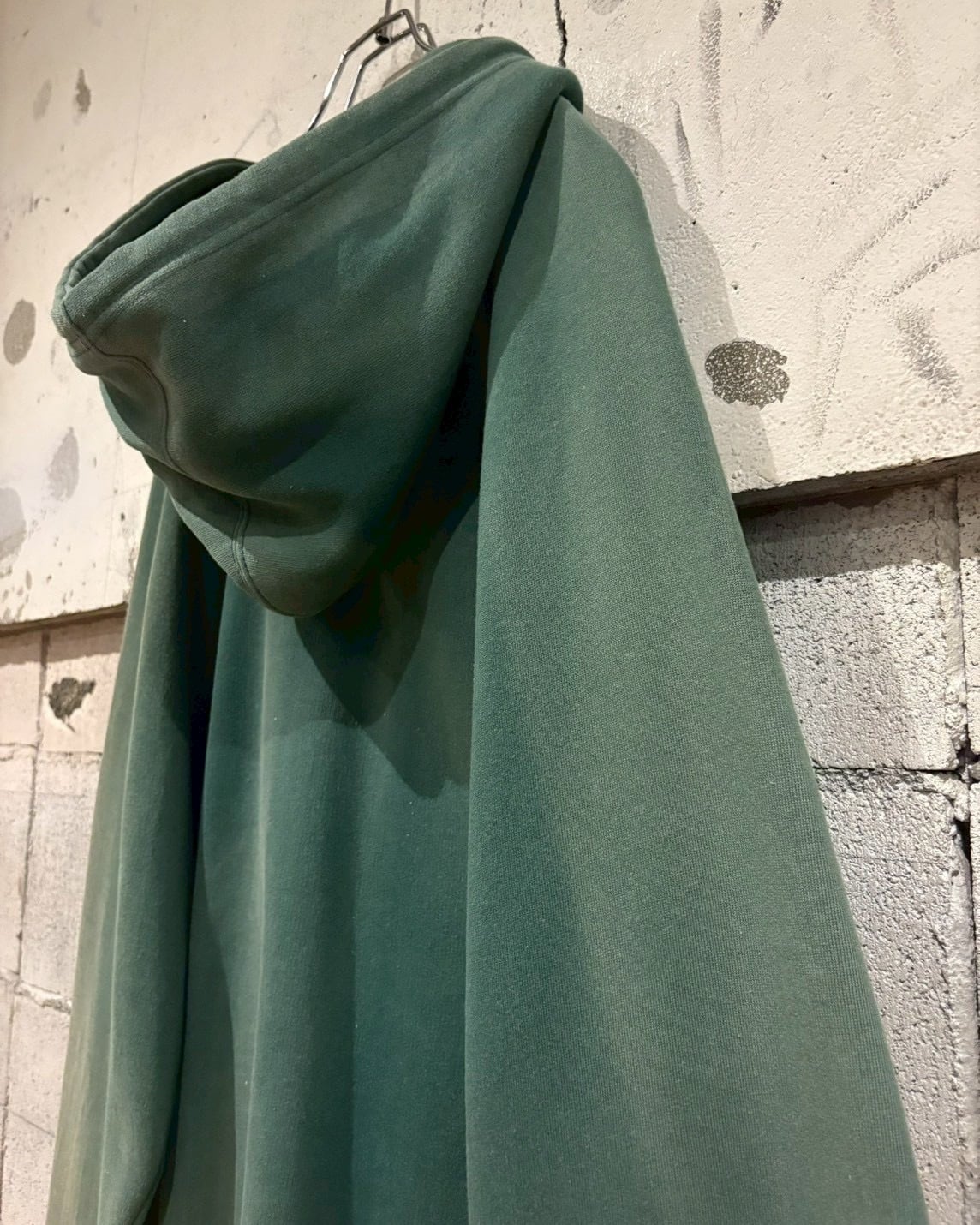 長年の着用と日焼けによって全体にかかったサンフェードが特徴で、深みのあるグリーンが柔らかく褪色し、唯一無二の表情を纏ったジップアップフーディ。