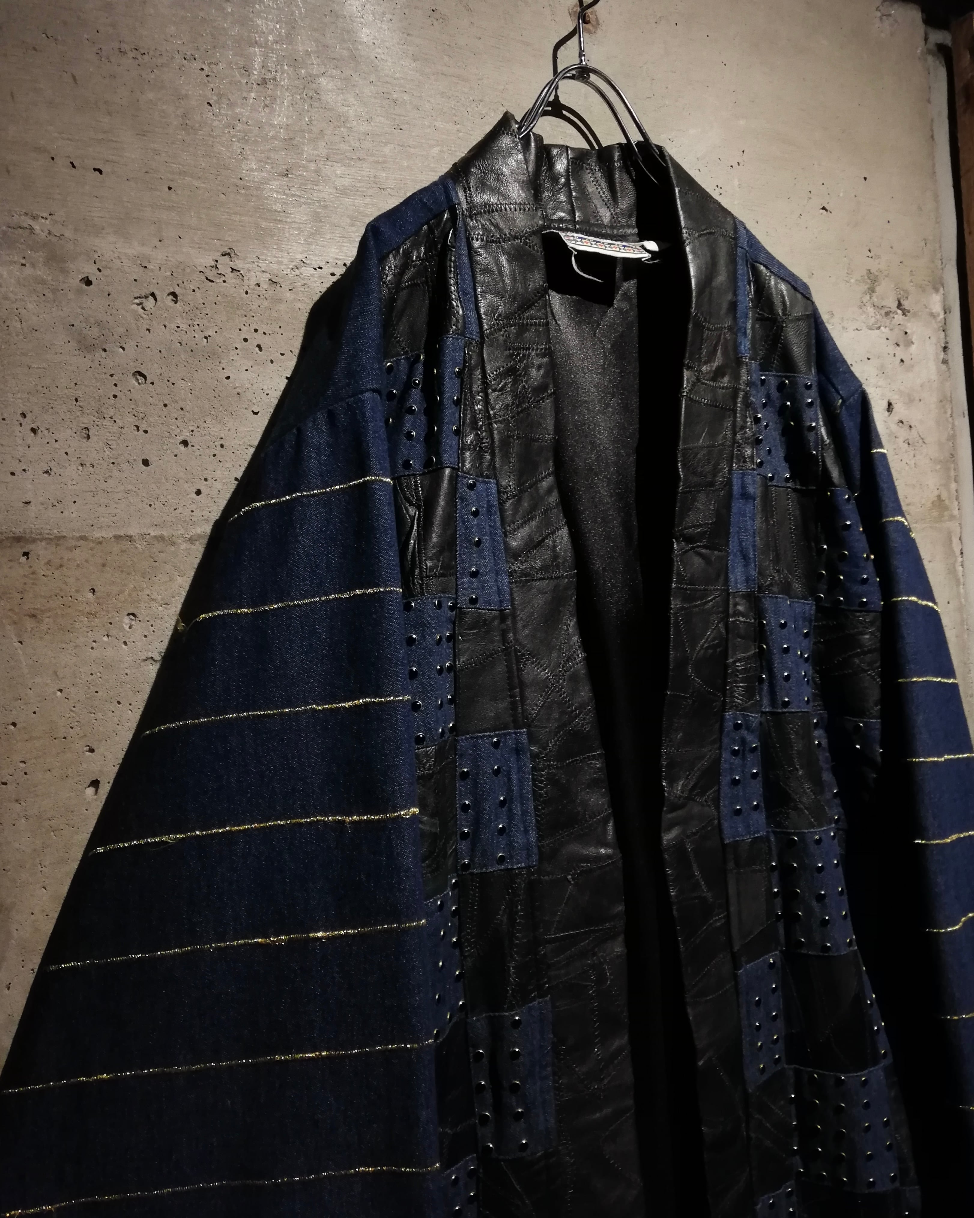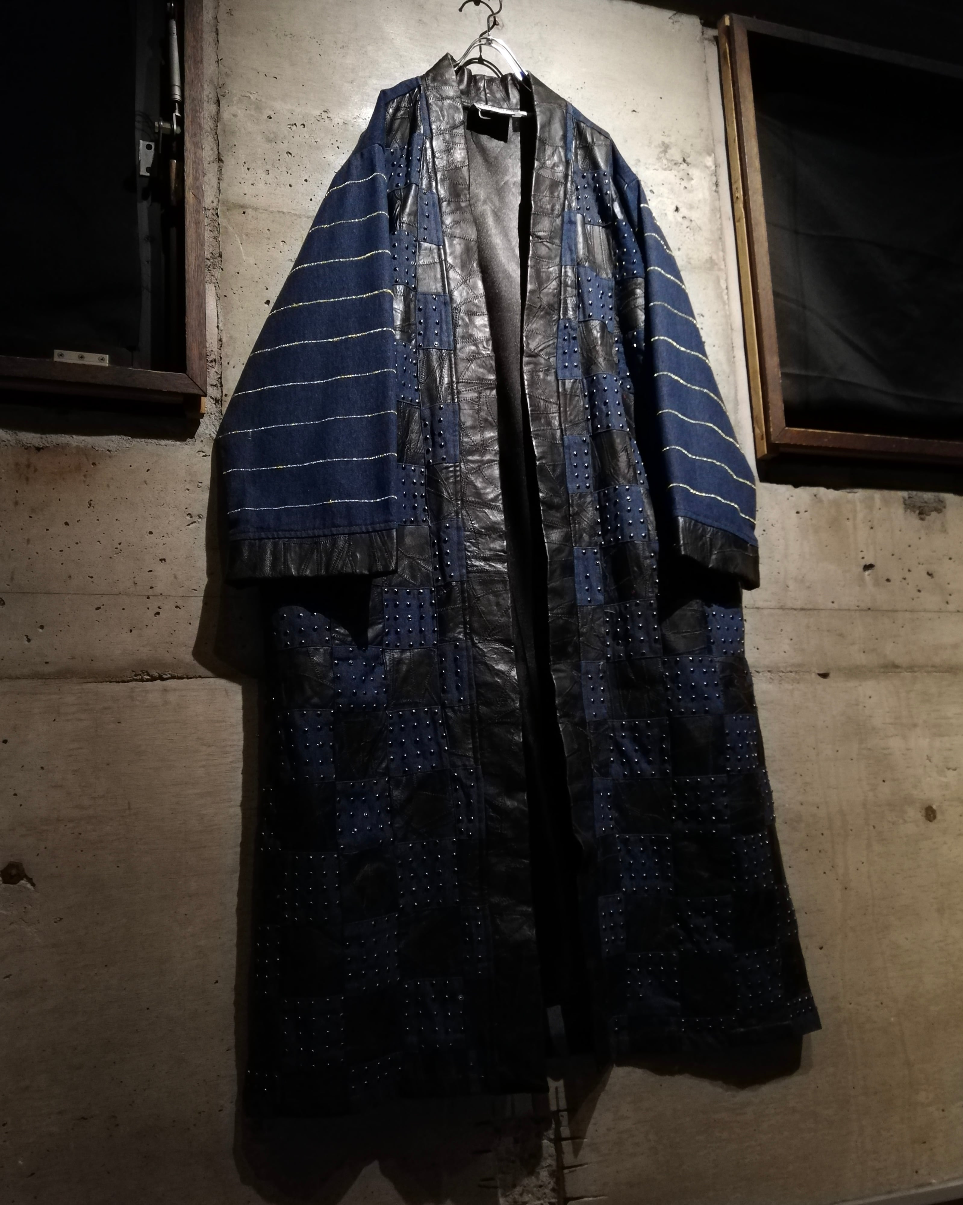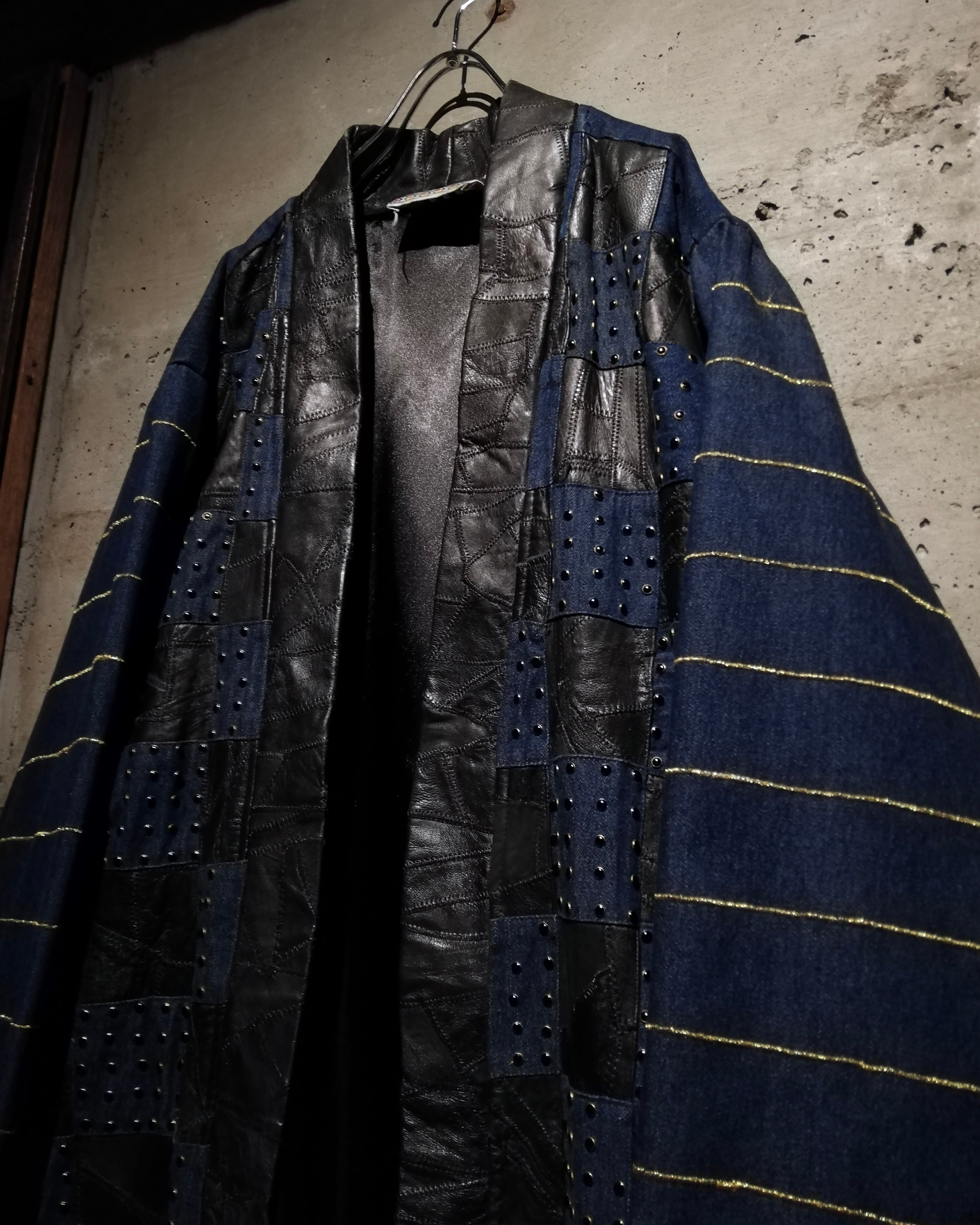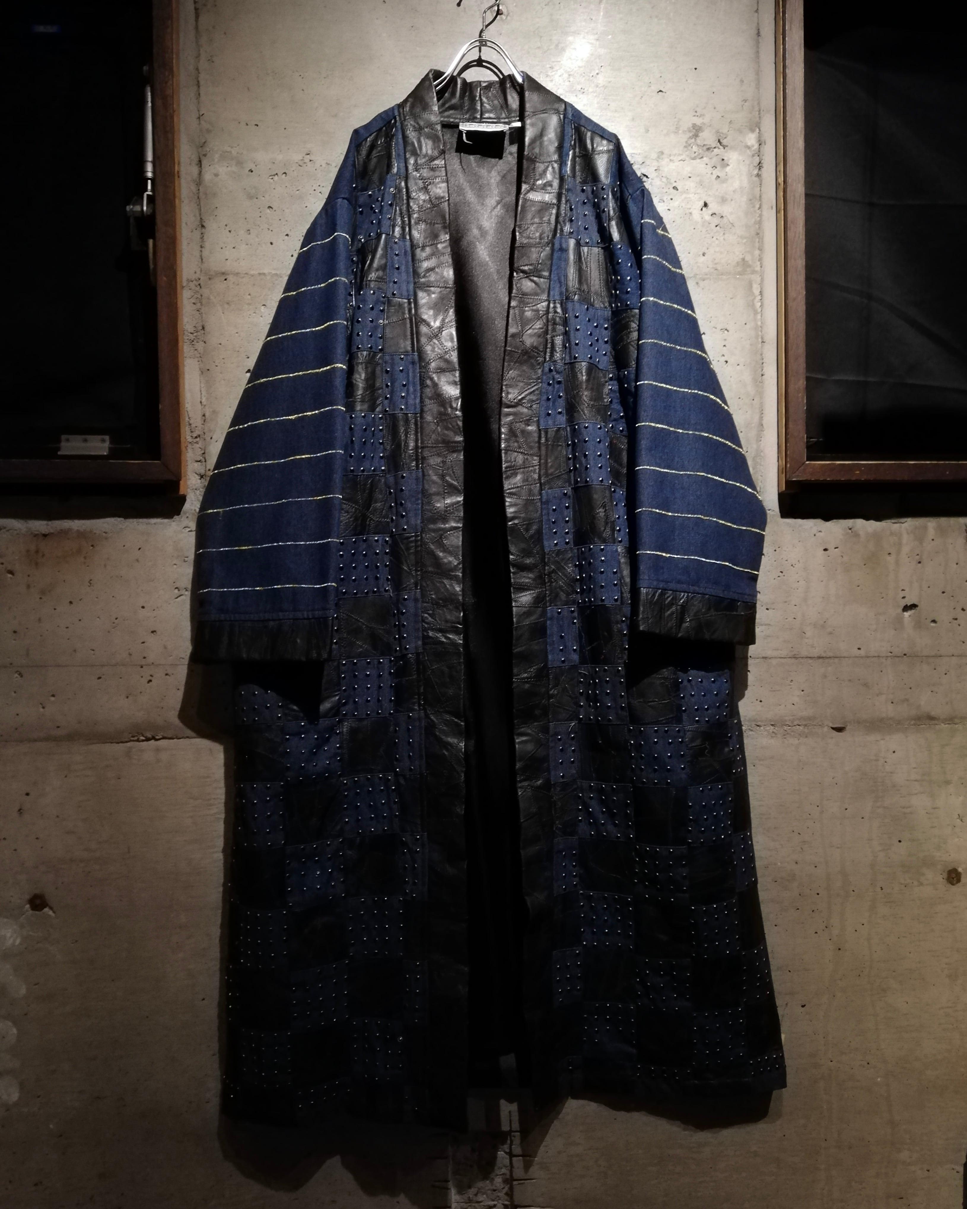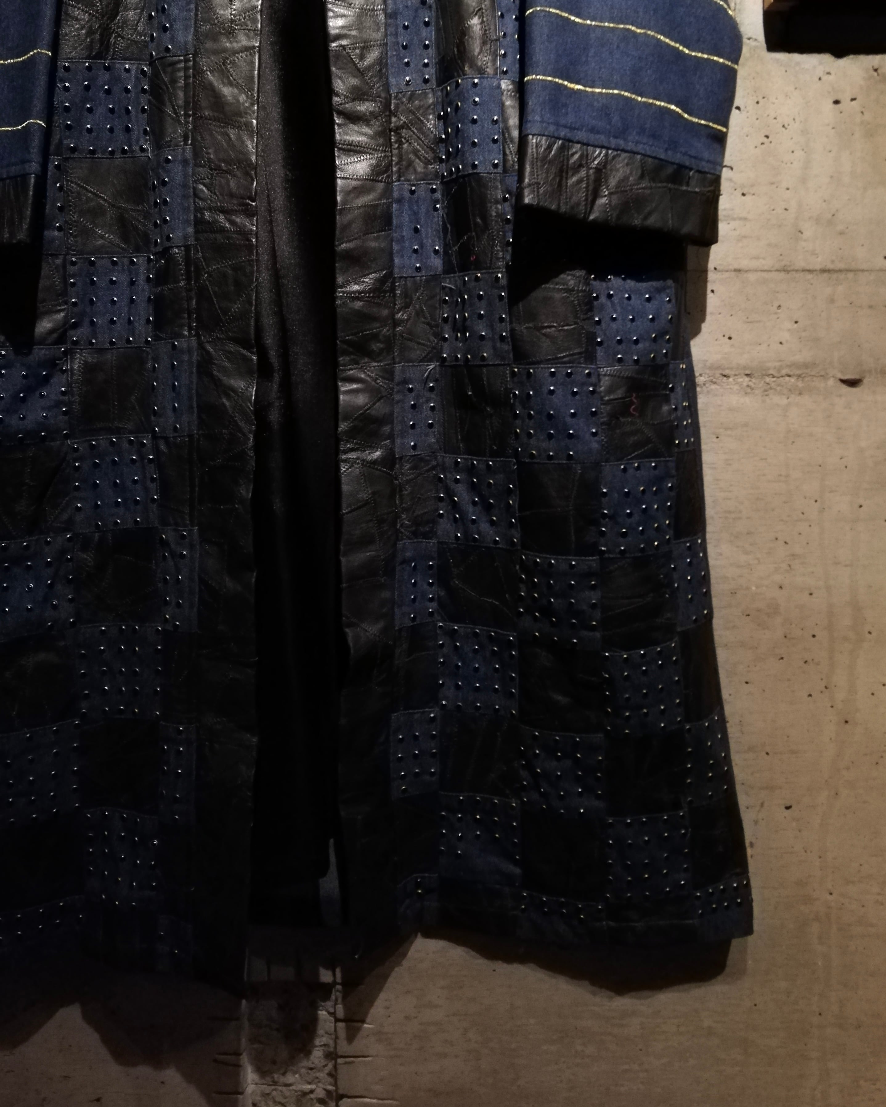 レザーとデニム、異素材を組み合わせたハンドクラフト仕様のロングガウンコート。1枚ずつ丁寧に仕立てられたパッチワーク構成で、クラフトらしい温もりと存在感を併せ持つデザインです。