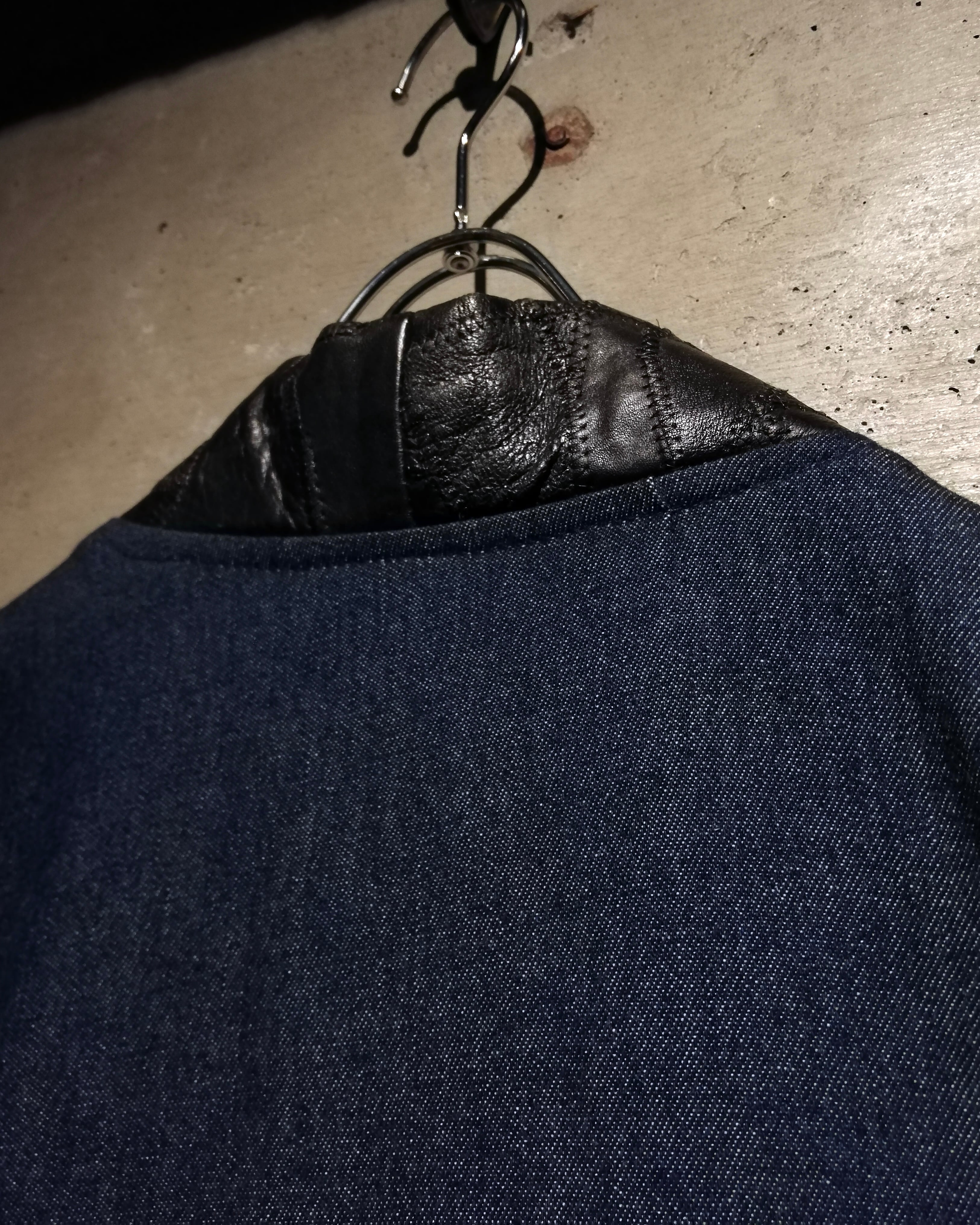 背面はデニムをメインに構成し、あえて余白を持たせたミニマルな仕上がり。身幅とアームにしっかりとゆとりを持たせたシルエットで、羽織るだけで自然なドレープが生まれます。動きに合わせてレザーの重厚感とデニムの柔らかさが交差し、奥行きある表情を見せるのも魅力です。