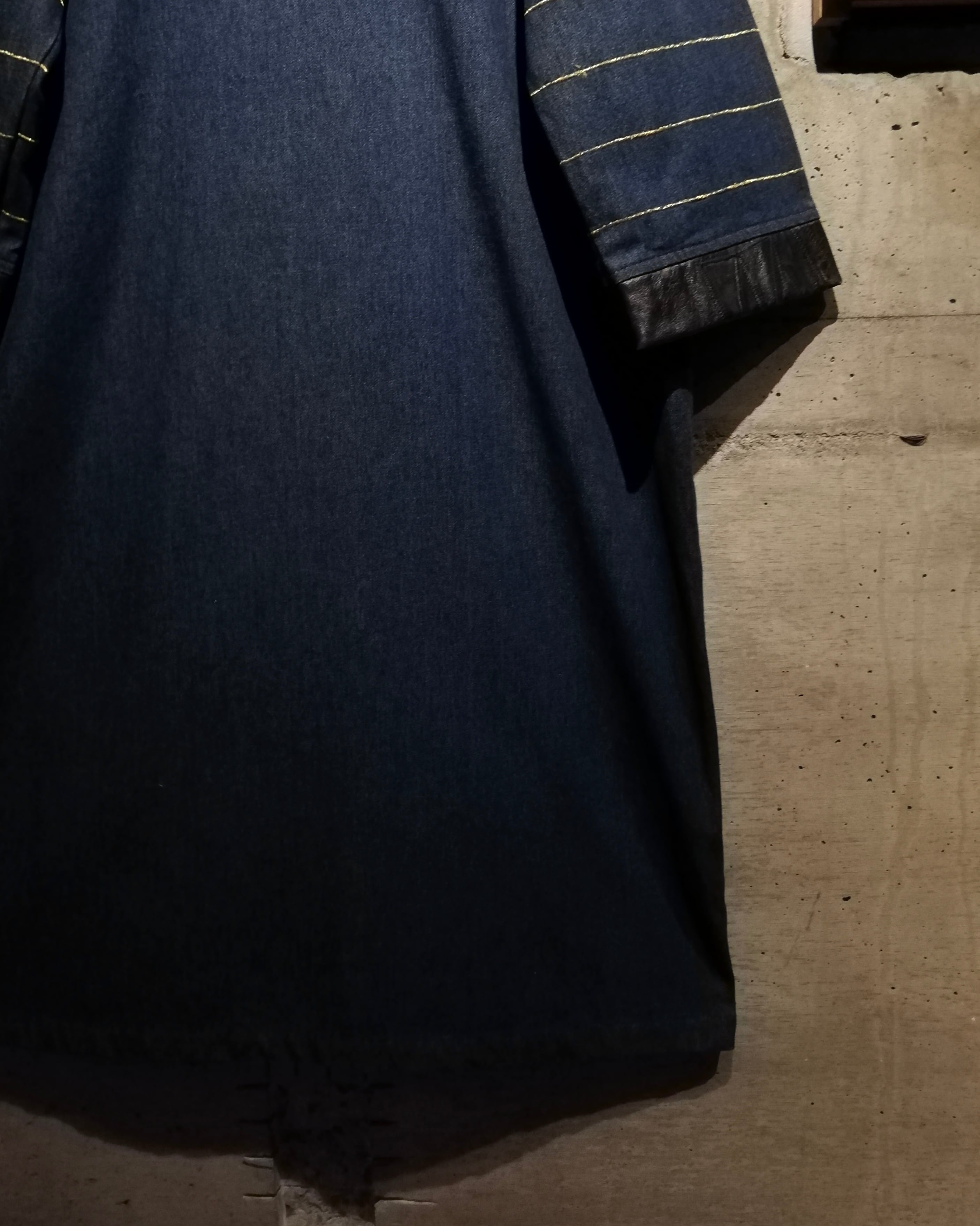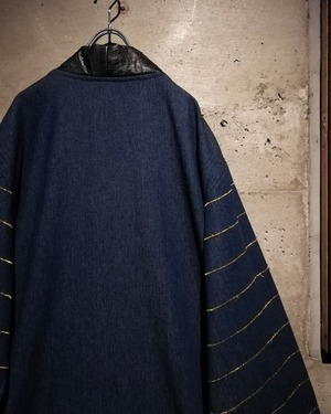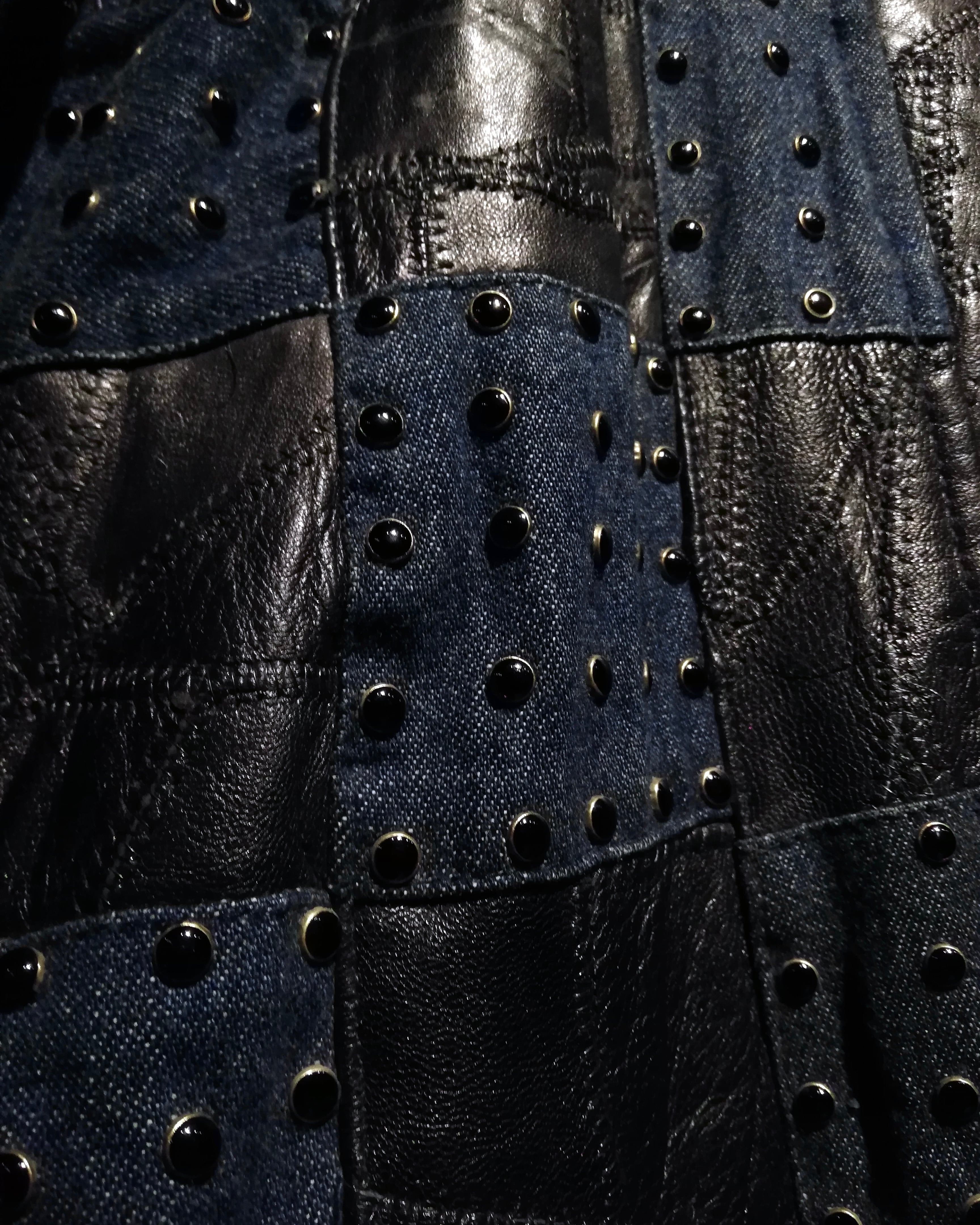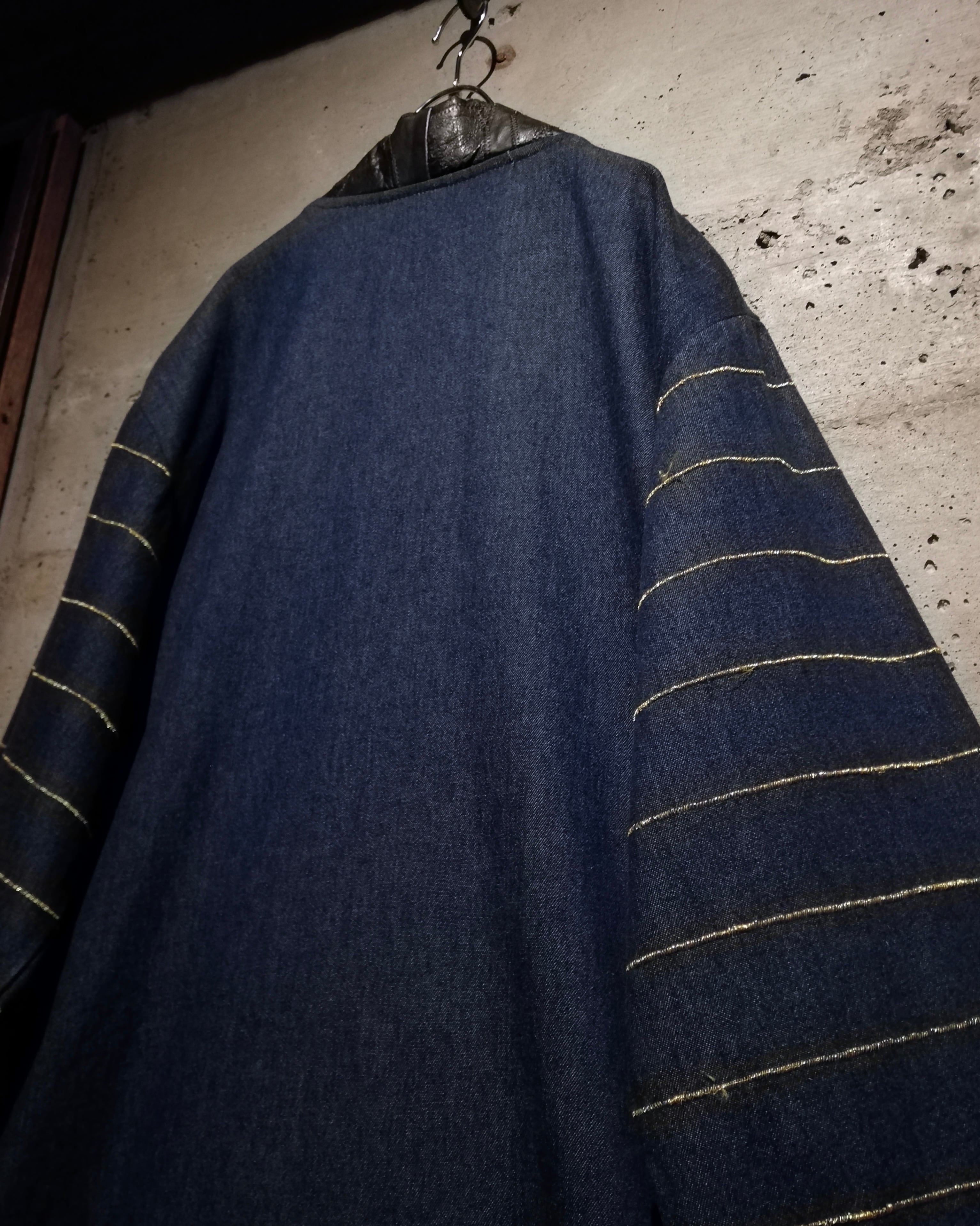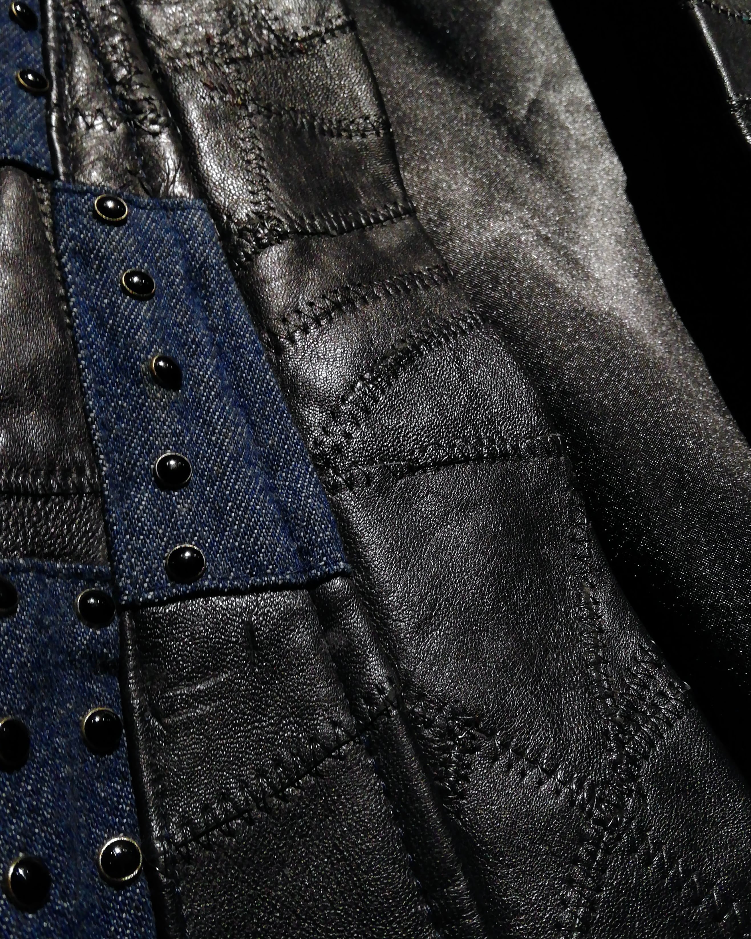 ボディはマットなインディゴデニムと、艶のあるブラックレザーを交互に配置。部分的に施されたスタッズやステッチワークが全体に立体感を生み、素材のコントラストをより際立たせています。袖にはゴールドステッチを走らせ、デザインの中に上品なアクセントをプラス。