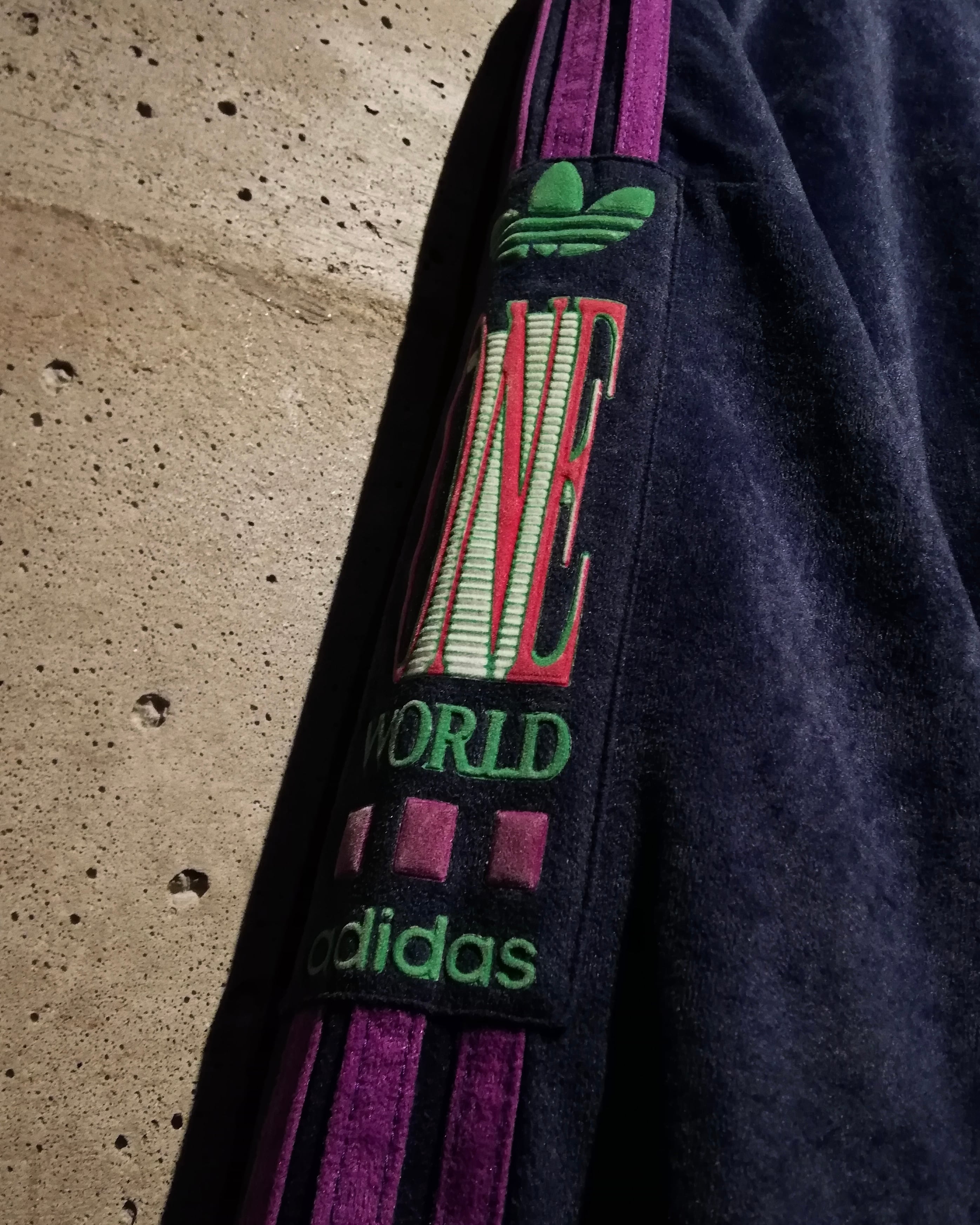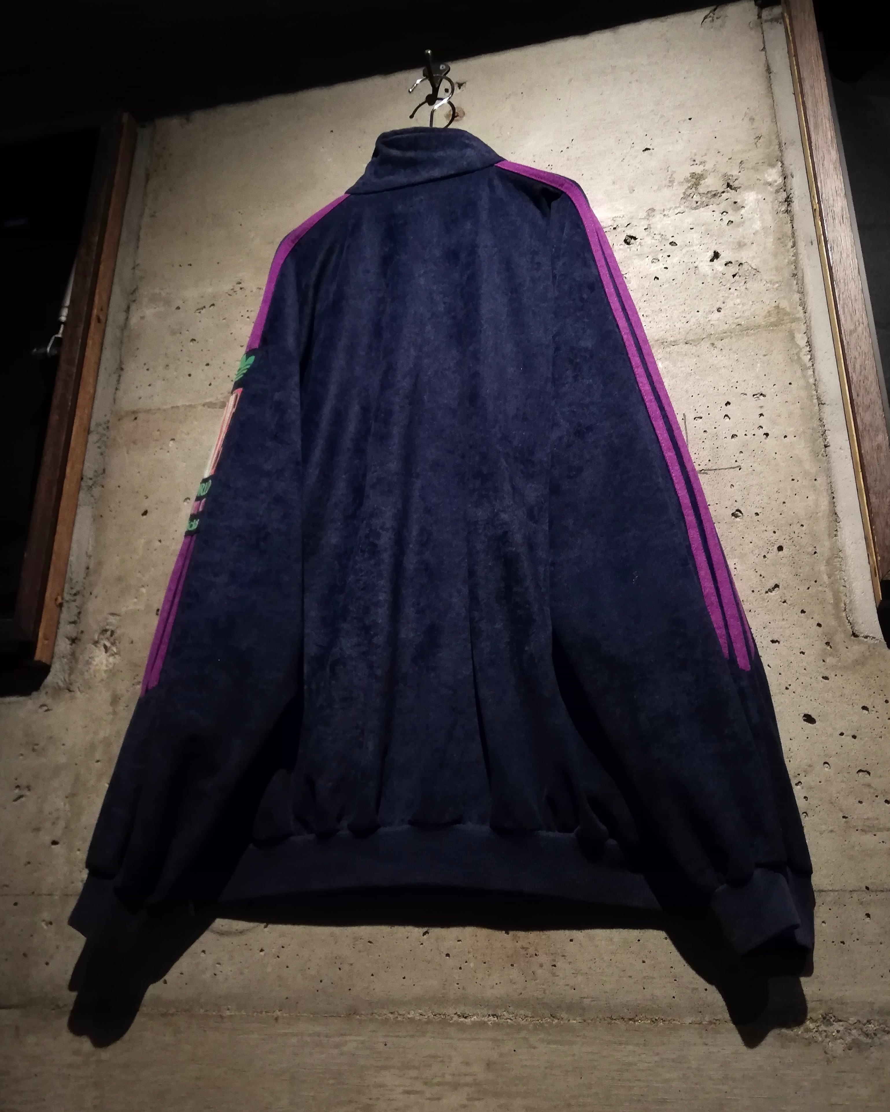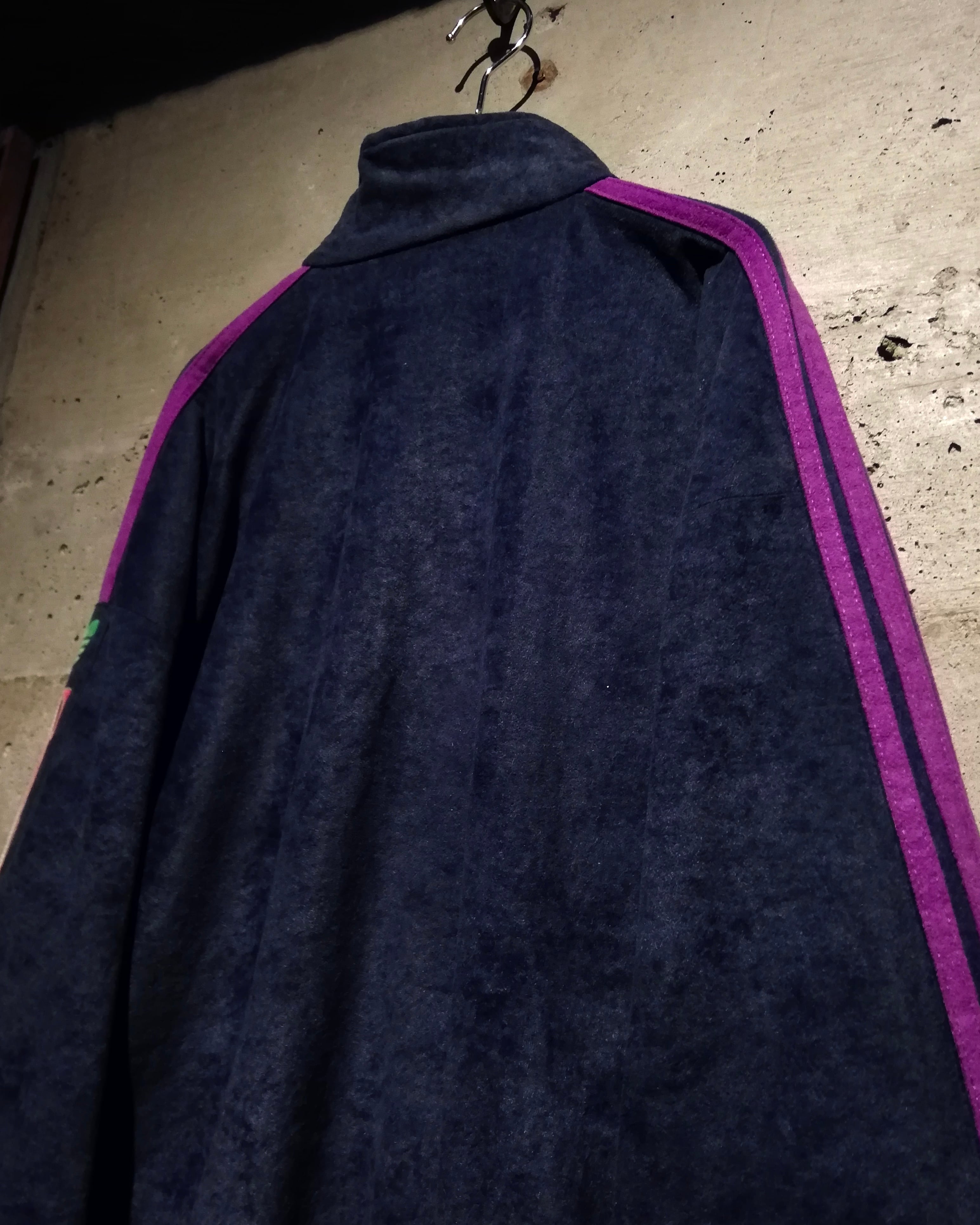 定番のジャージ素材ではなく、上品な光沢を帯びたベロア調のピーチスキン素材を採用。ネイビーベースのボディに、パープルとグリーンを効かせた大胆な配色◎