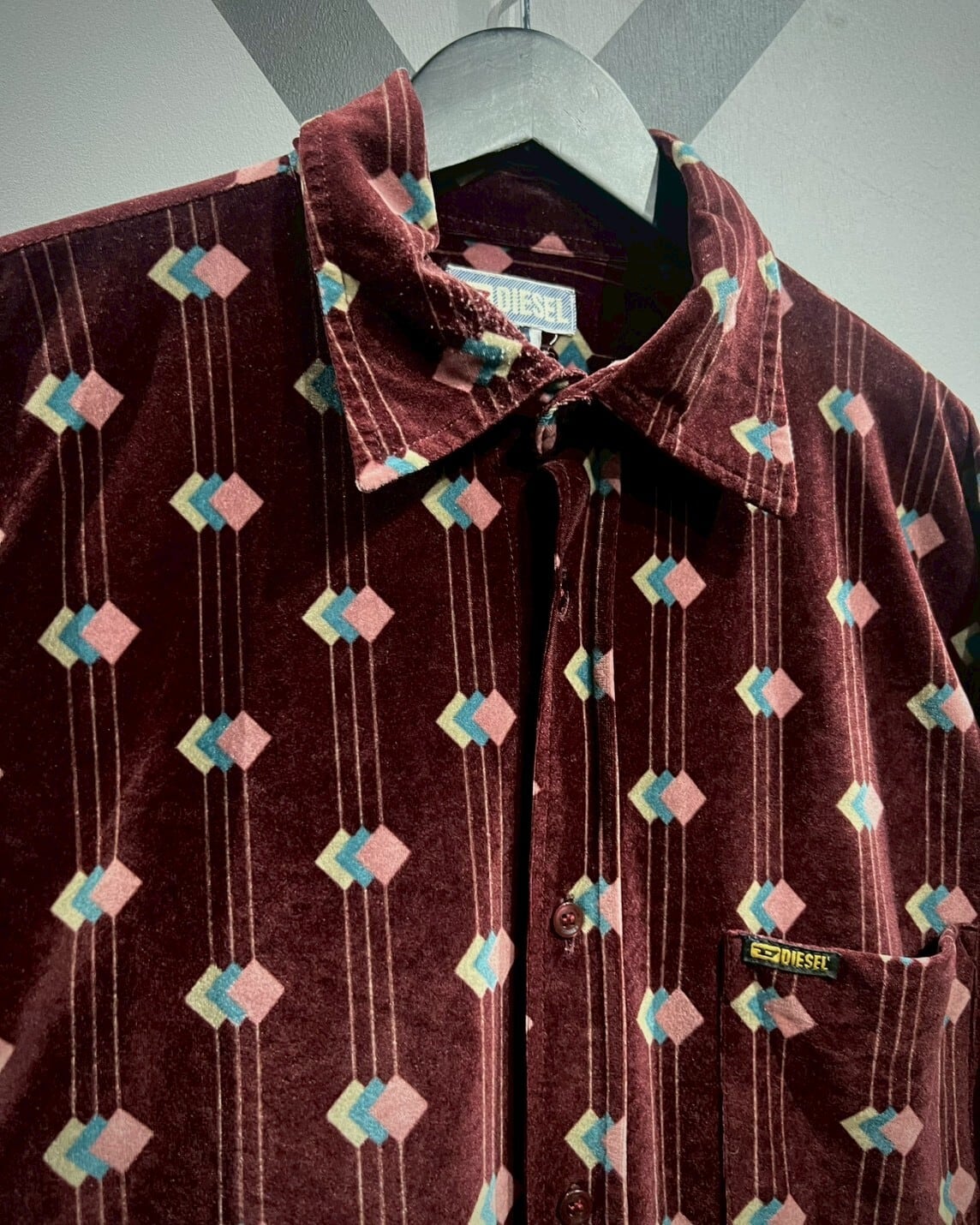 パターンはピンク、ターコイズ、ベージュを組み合わせた立体的なグラフィックで、当時のDIESELらしい遊び心とアヴァンギャルドな世界観を感じさせます。