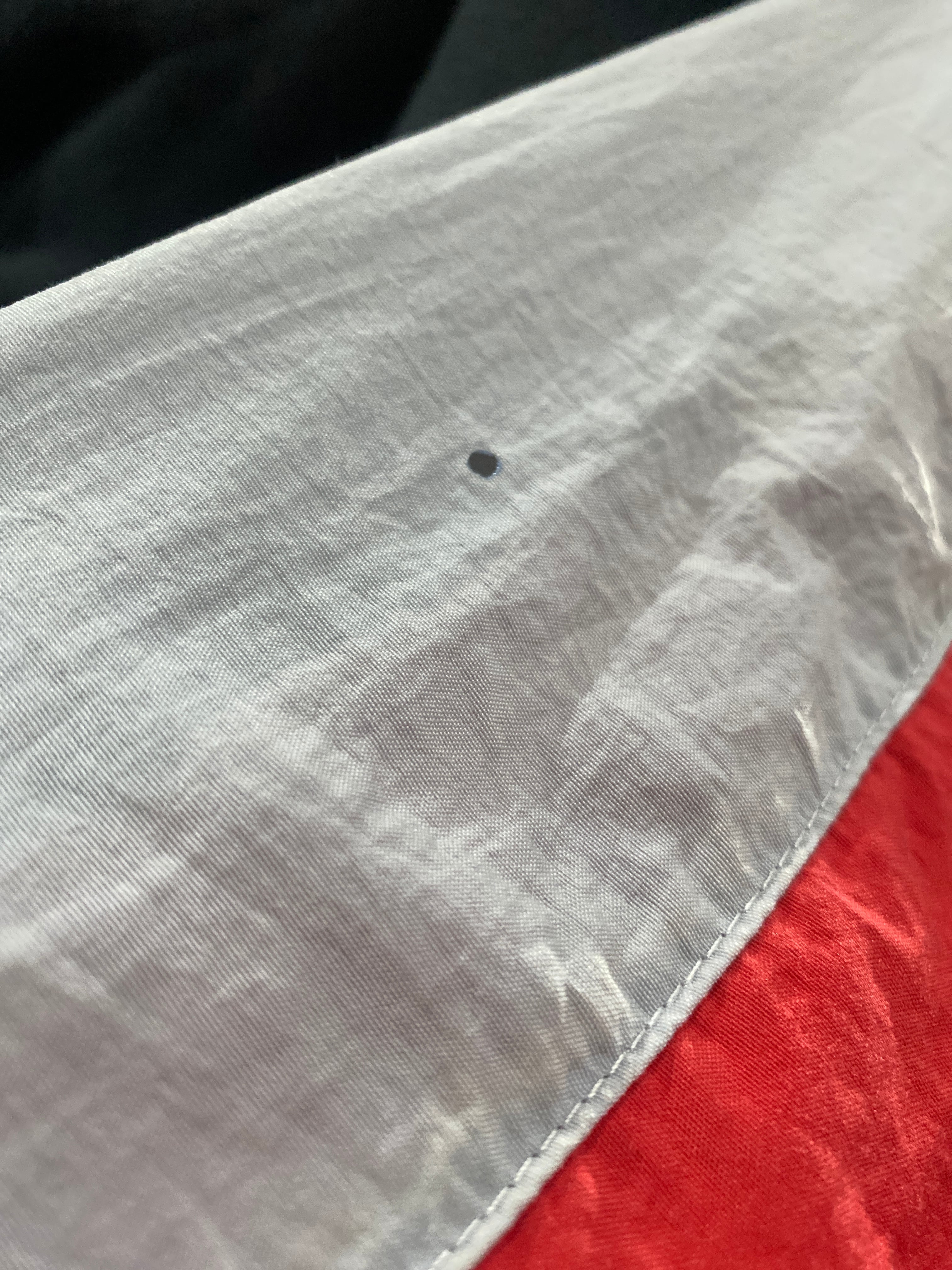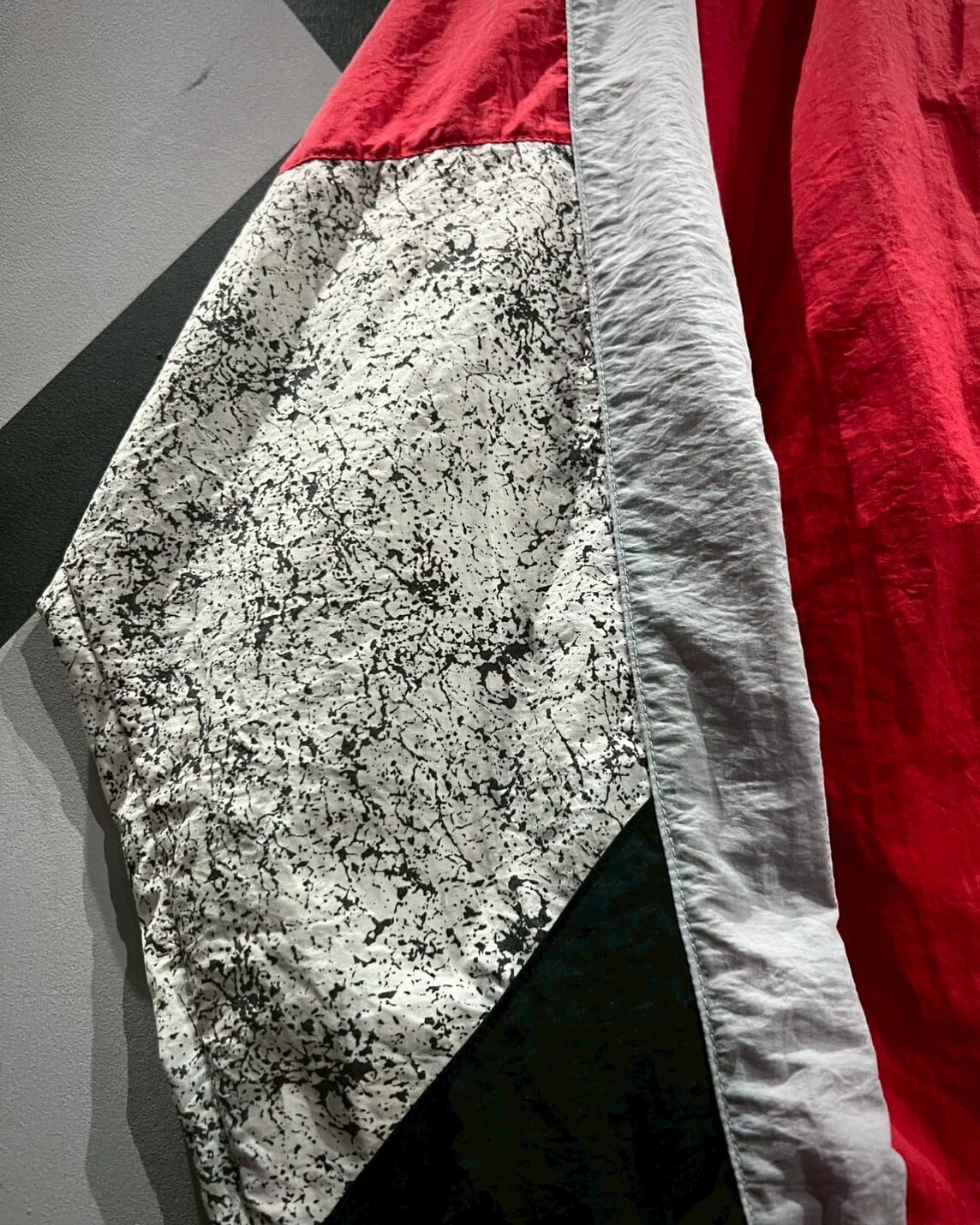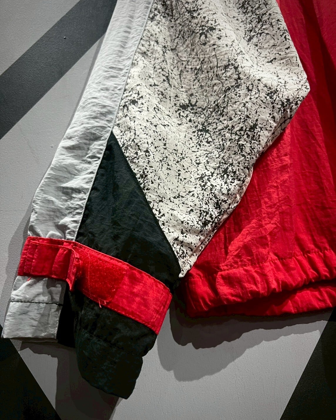 レッドをベースに、ショルダーからアームにかけて配されたライトグレーとブラックの切り替え。さらに袖にはモノトーンのマーブルパターンを施し、アイコニックかつヴィンテージならではの雰囲気を纏ったデザイン。左胸には同色のトレフォイルロゴ刺繍をさりげなく配置し、クラシックなスポーツウェアの美学を体現しています。