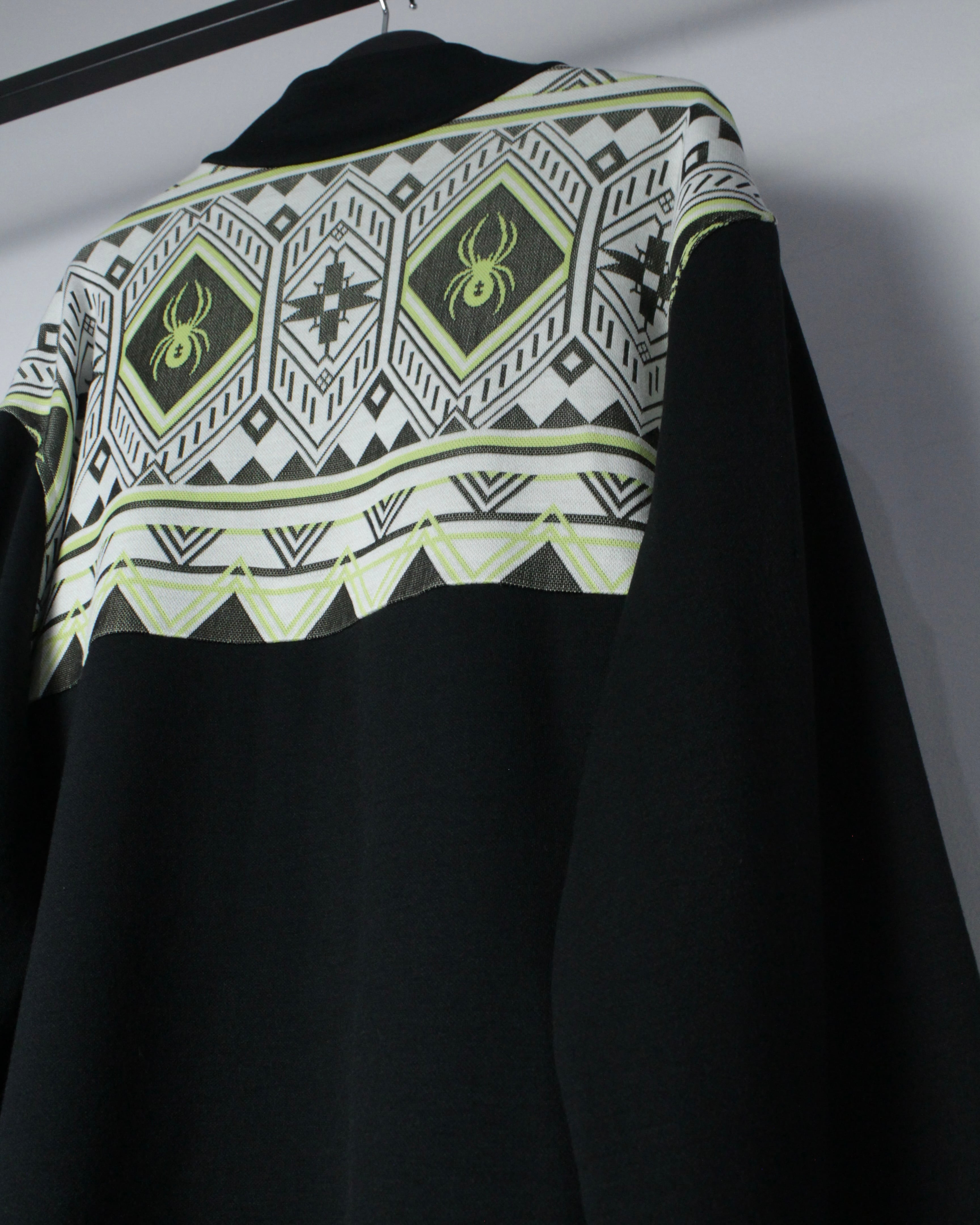フロントから背面にかけて、アイコニックなスパイダーロゴを中心に幾何学パターンを配したデザイン。ホワイト・ブラック・イエローグリーンのトリコロール調の配色が、スポーティーでありながらもモードな雰囲気を漂わせています。