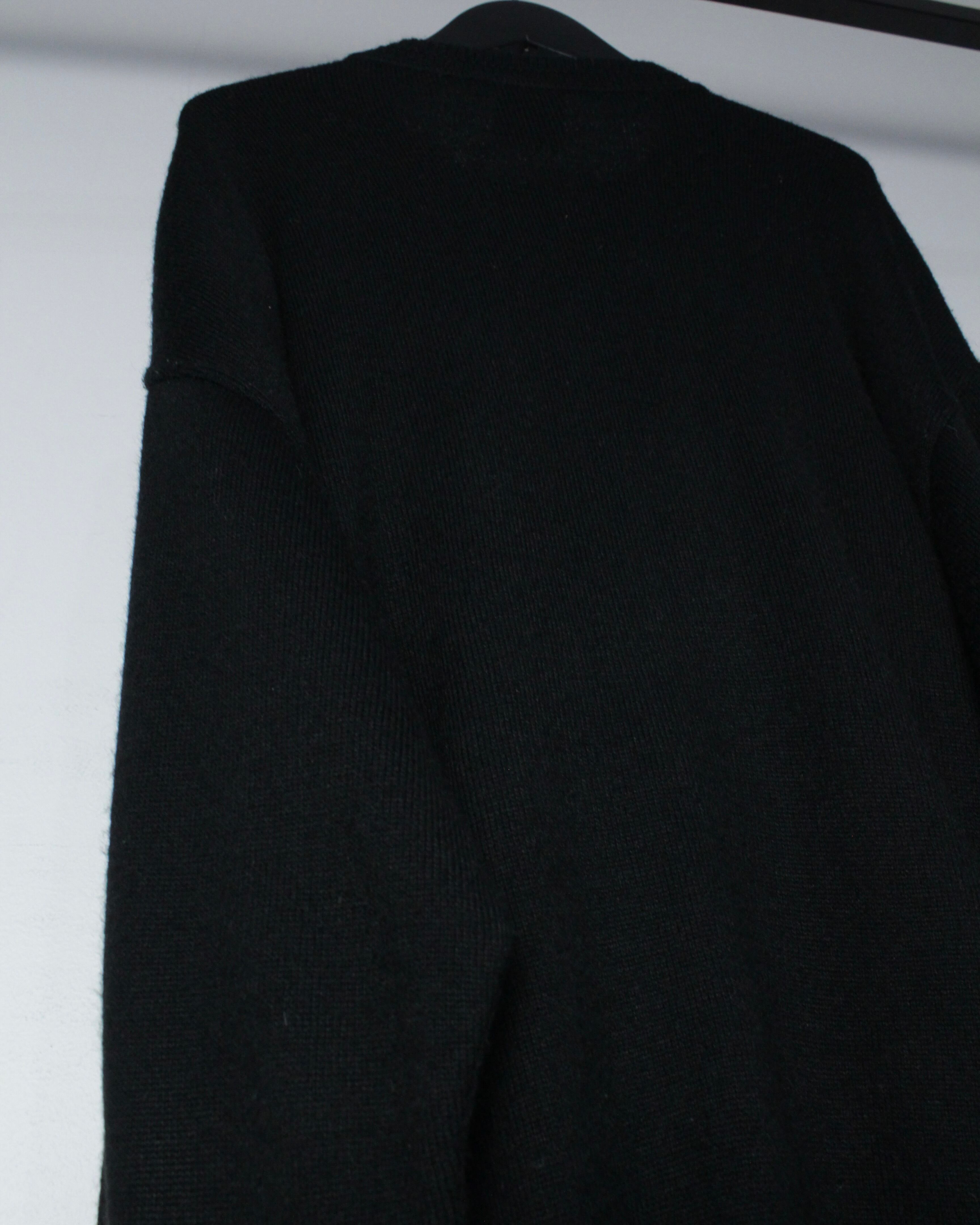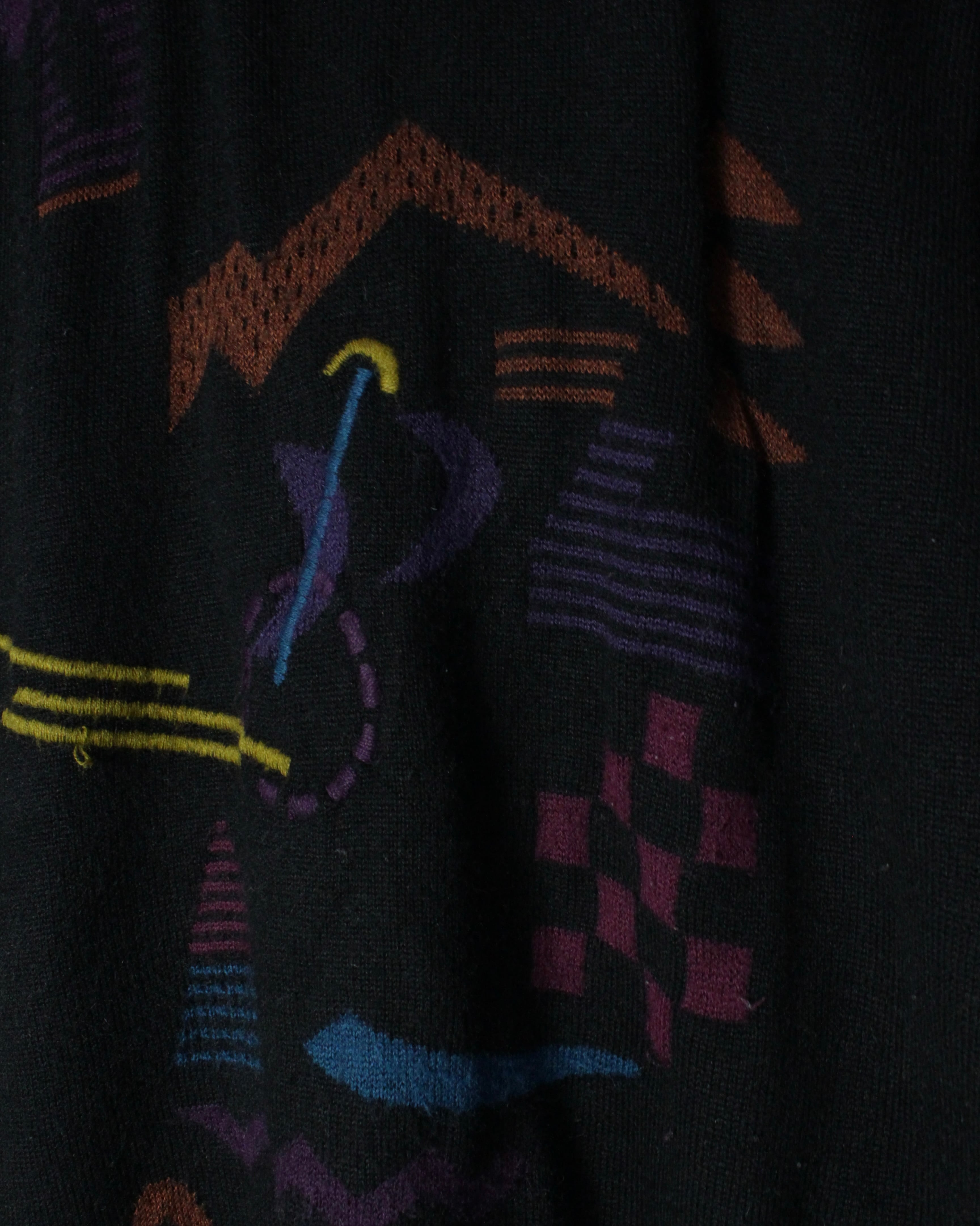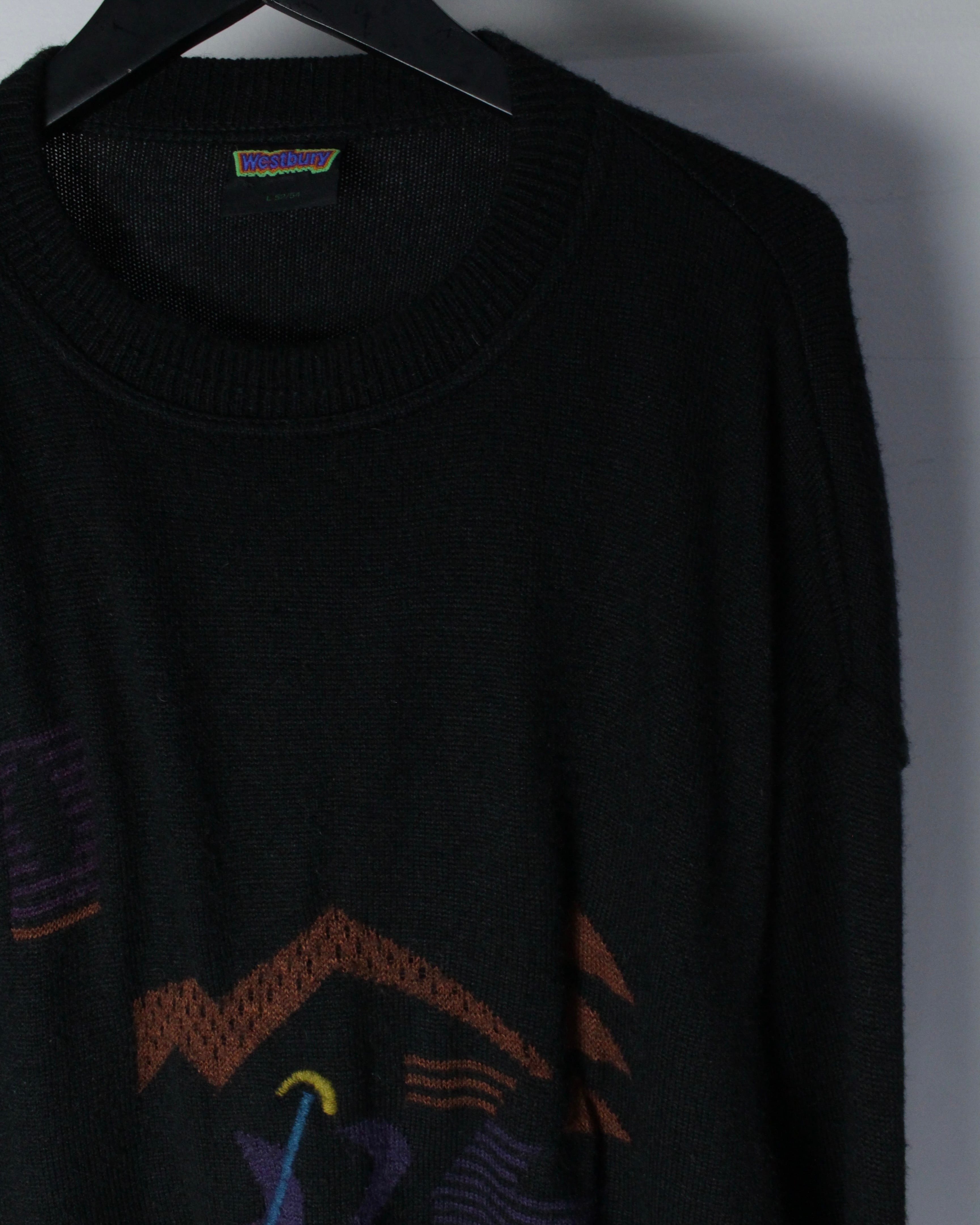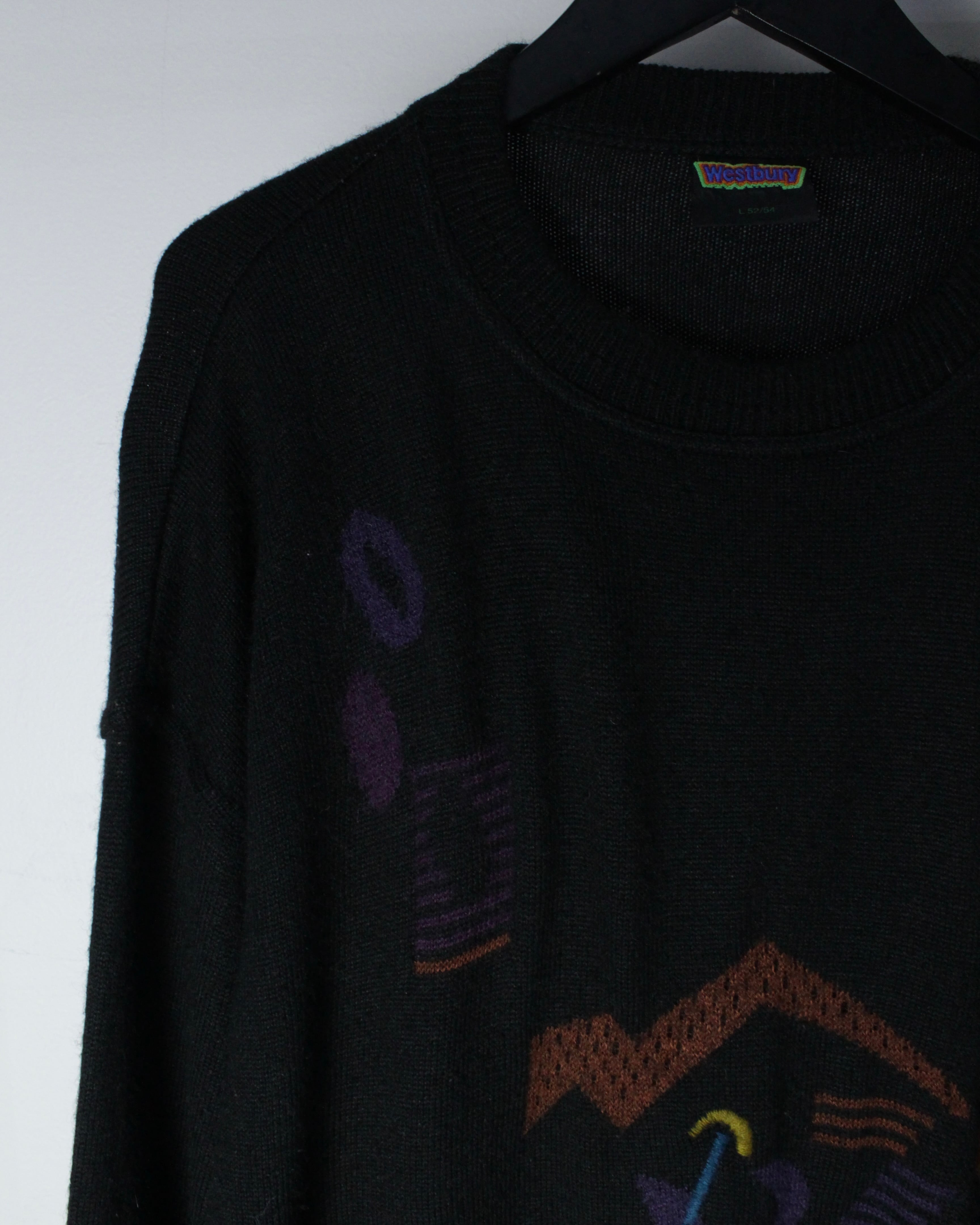 アーティスティックな感性が宿る、ブラックベースのヴィンテージニット。独創的でポップなグラフィックパターンが印象的です。