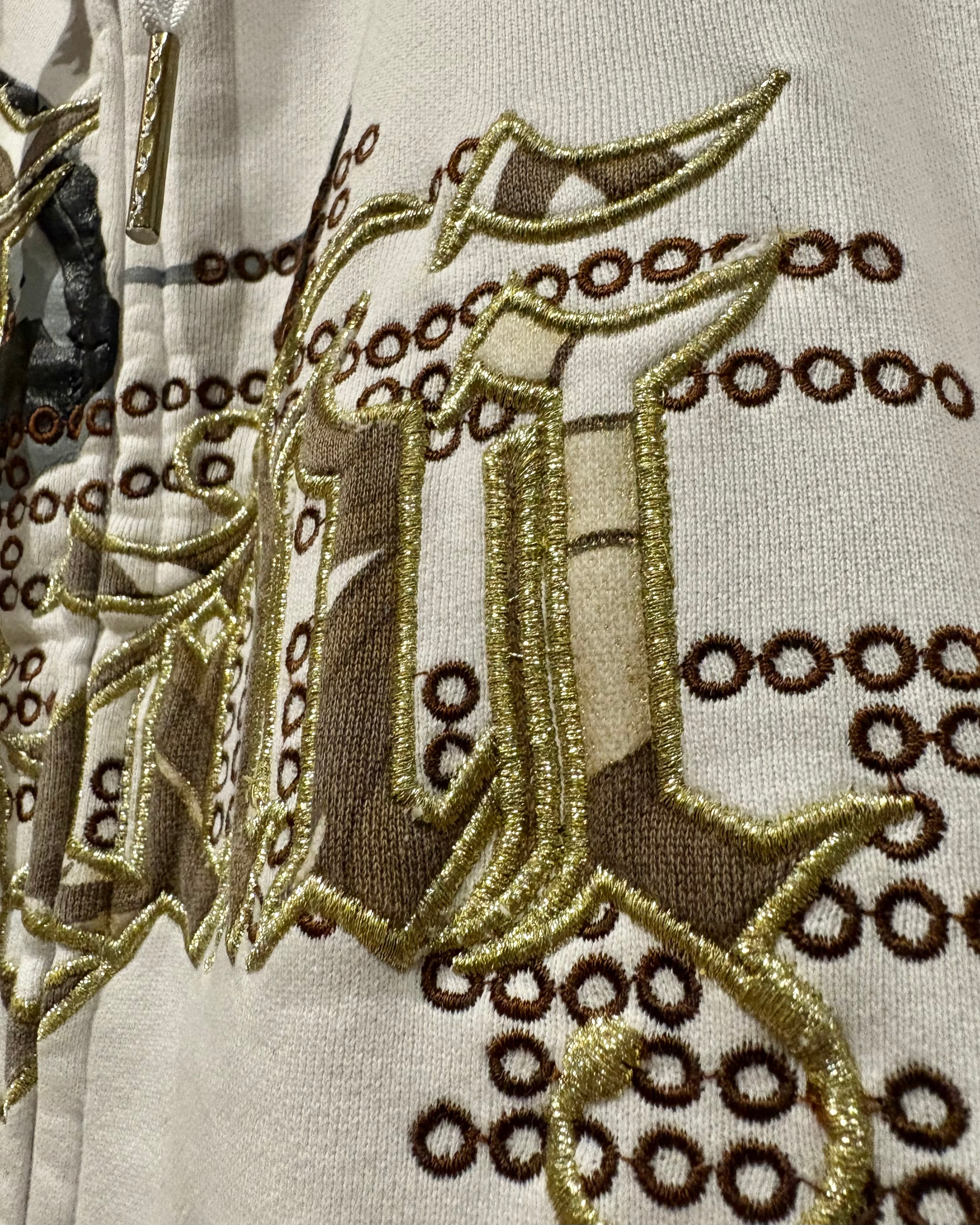 フロントにはブランドのアイコニックなロゴを、ボディとは別のテキスタイルとプリント、ゴールドステッチで立体的に構築。大胆かつラグジュアリーな装飾性が際立ち、ヒップホップカルチャー全盛期のエナジーを感じさせます。