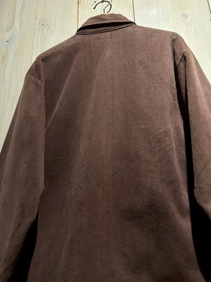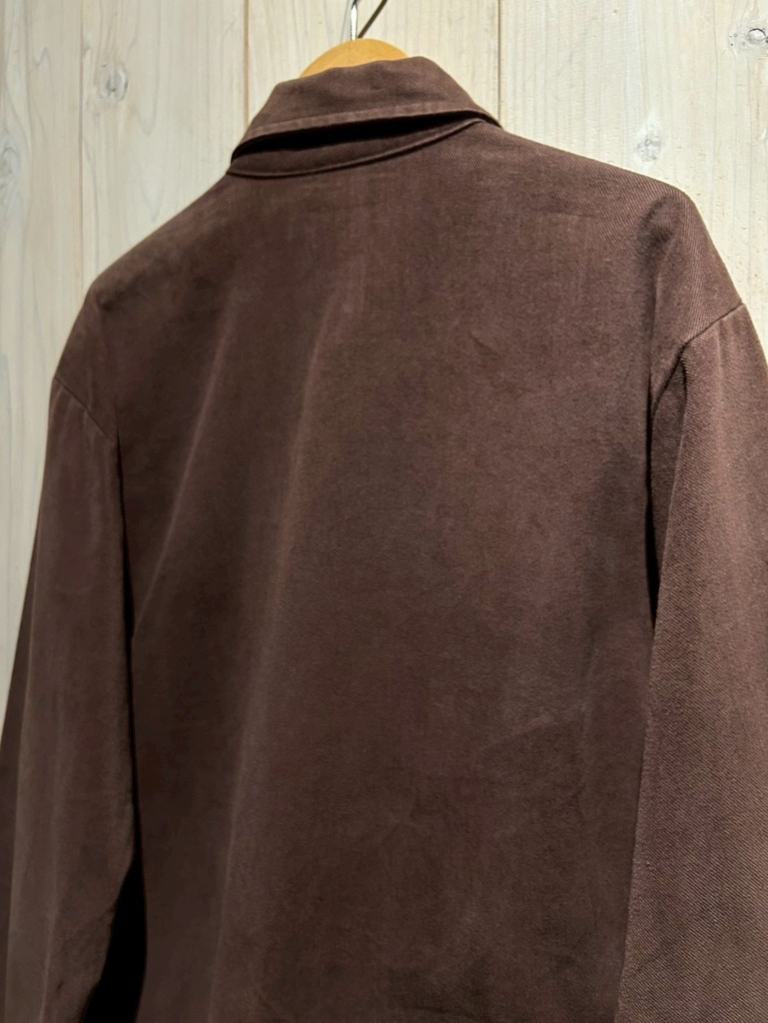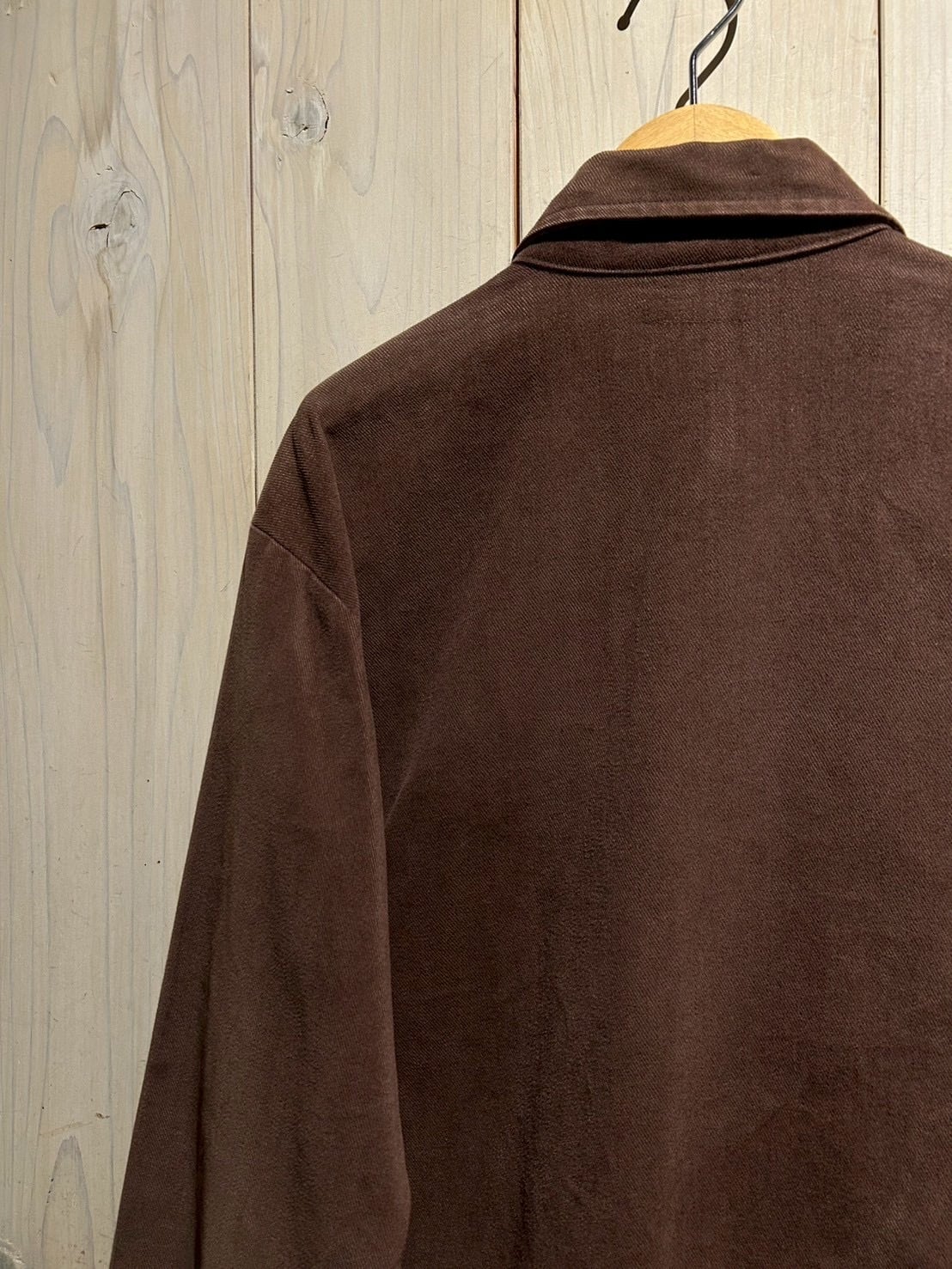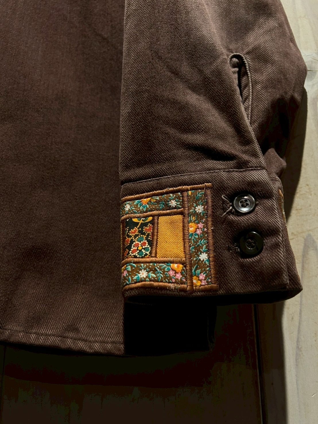 素材にはタフなコットンツイル生地を使用し、深みのあるブラウンカラーが経年によって柔らかくフェード。パッチワーク部分にはキャンバスやプリントコットンが用いられ、異素材のコンビネーションが独特の表情を生み出しています。袖口にも同様のテープ装飾が施され、細部にまで抜かりないデザインワークが◎