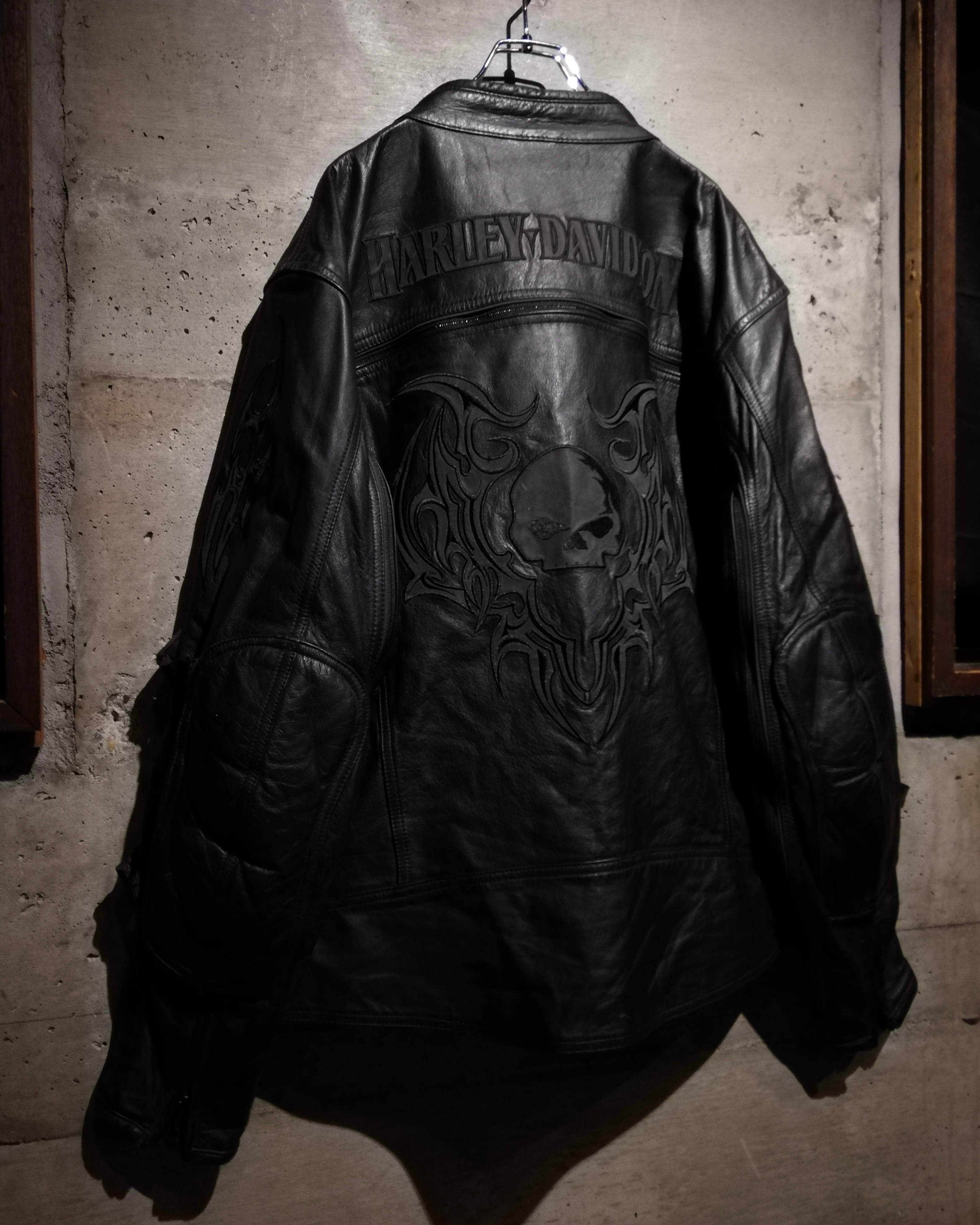 肉厚でタフなブラックレザーをメインに使用し、胸元の大胆なロゴ、袖や背面にはトライバルモチーフを重ねたスカルデザインの刺繍が抜群の迫力を見せる1着。