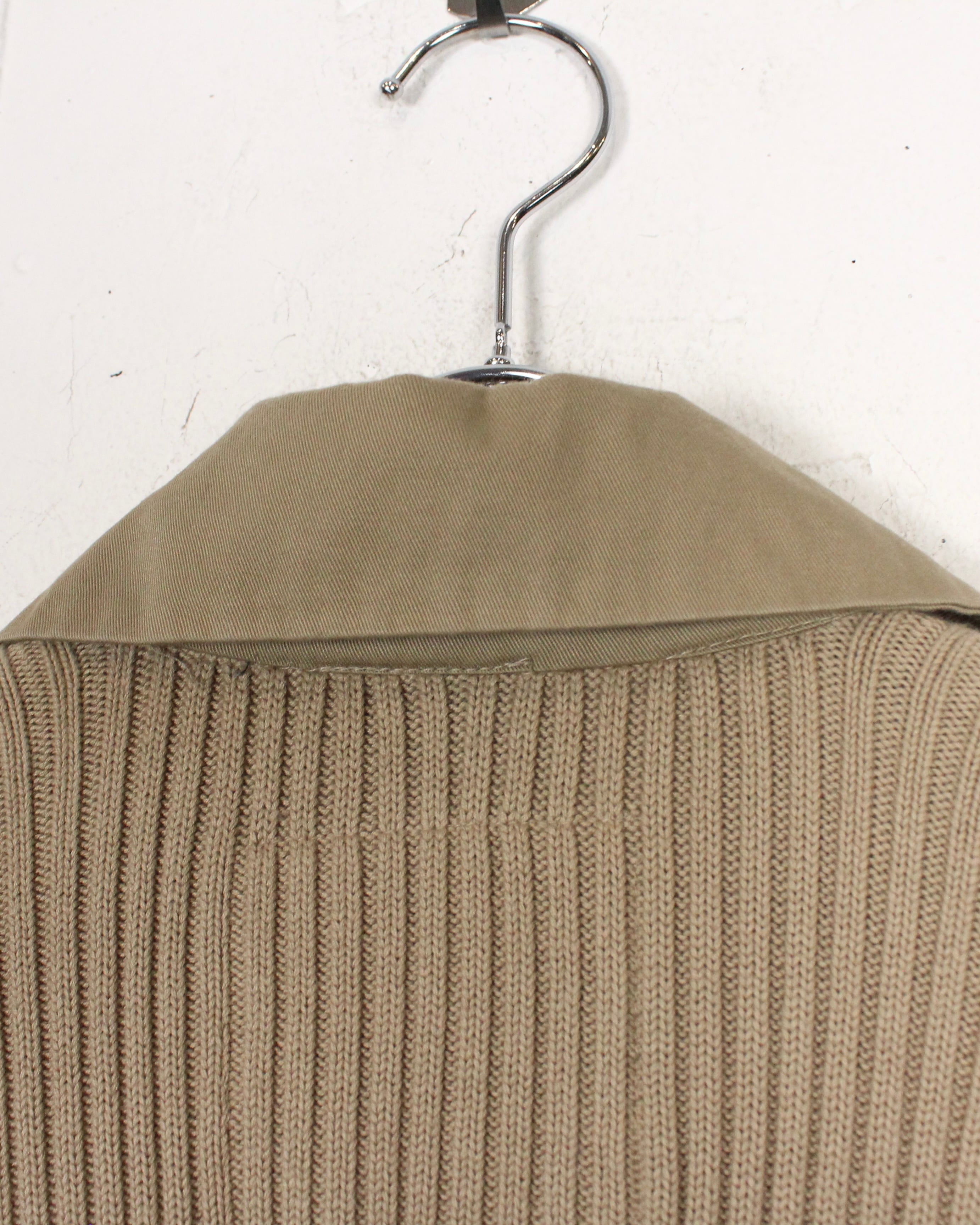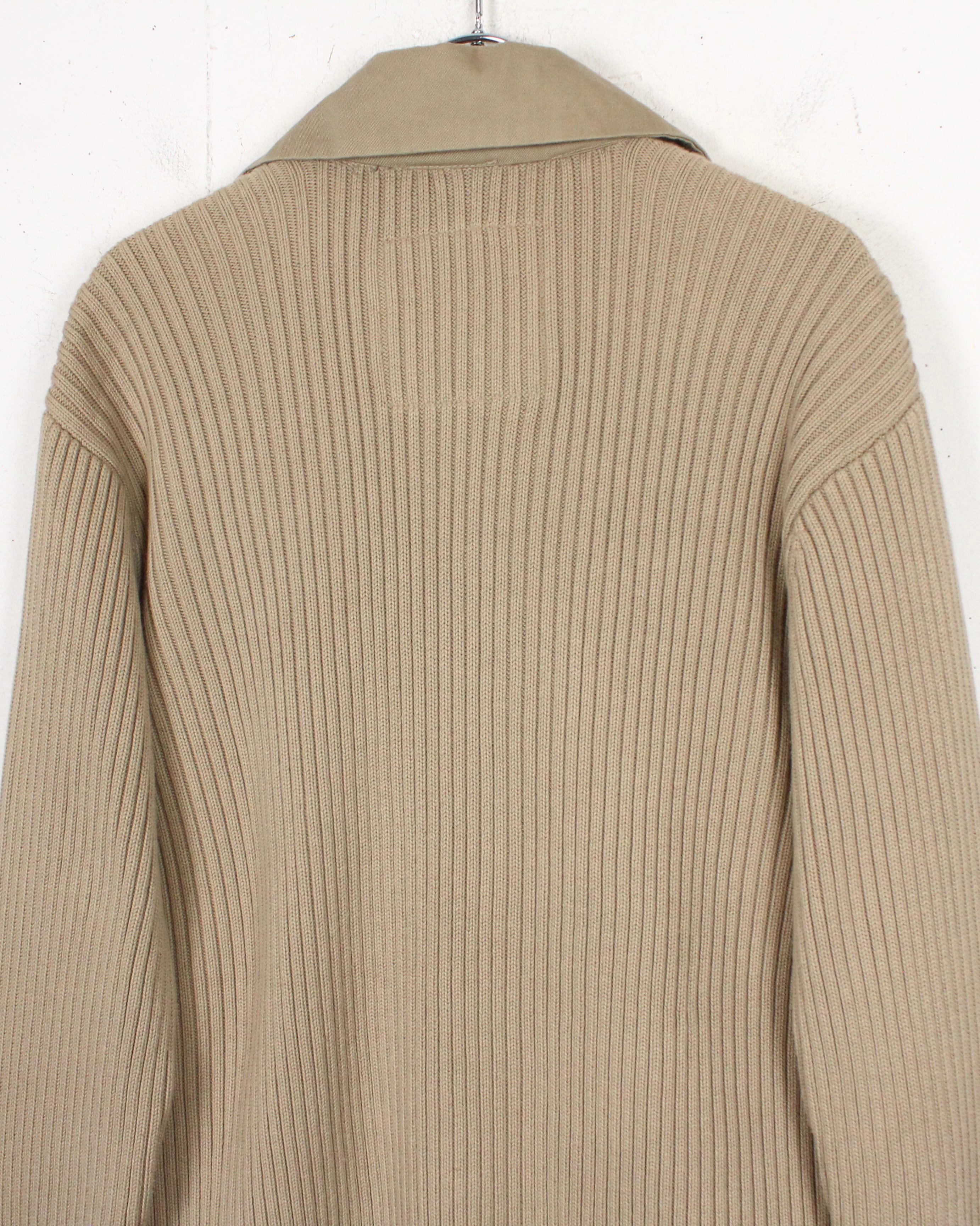 ミドルゲージのリブニットを採用し、しなやかで適度な厚みを持ちながら柔らかく身体に馴染むフィット感を実現。襟元にはハリのあるコットンツイルを切り替え、構築的な首周りを演出しています。