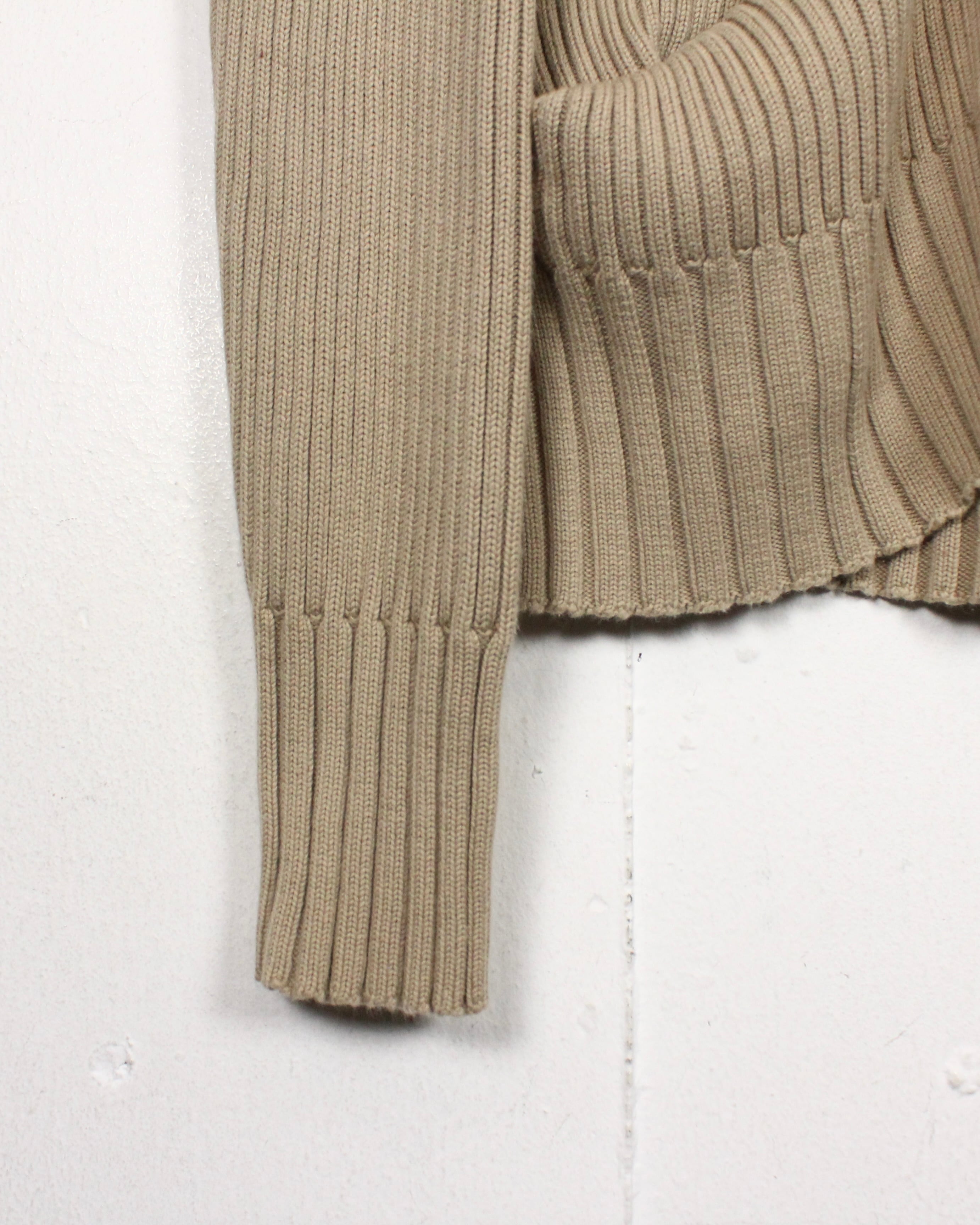 サンドベージュのワントーンでまとめながら、立体的な編みと素材の表情で深みを持たせた仕上がり。インナーにシャツを挟んでも、アウターライクに羽織るのもおすすめです。