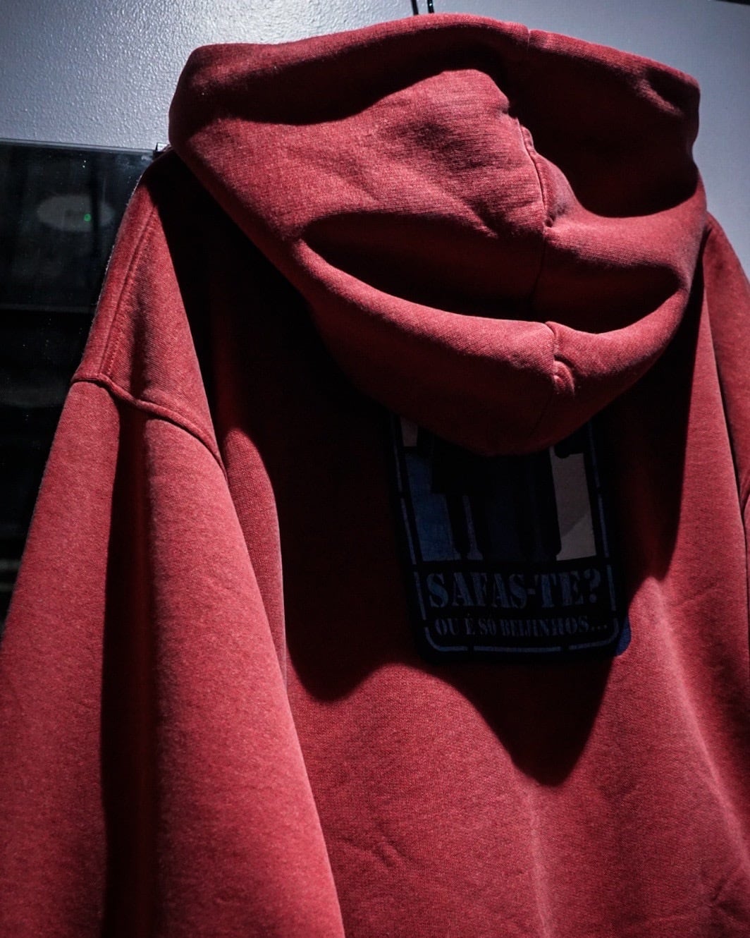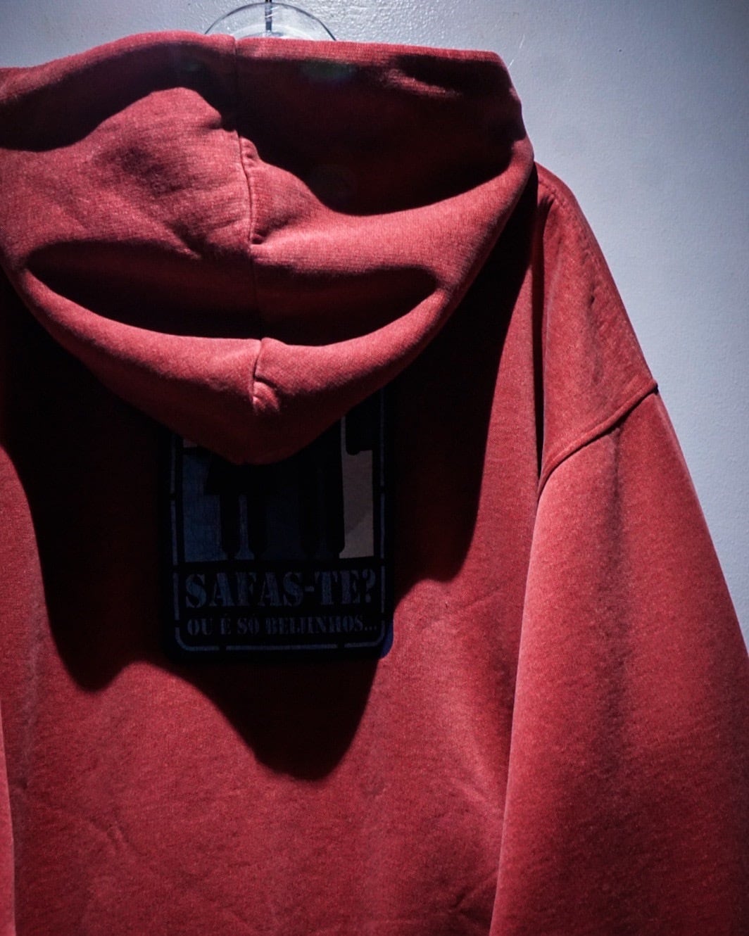 ピクトグラムのデザイン性と、レッドボディが醸し出す温度感。その対比が印象的な、当店らしいグラフィックフーディの逸品です。