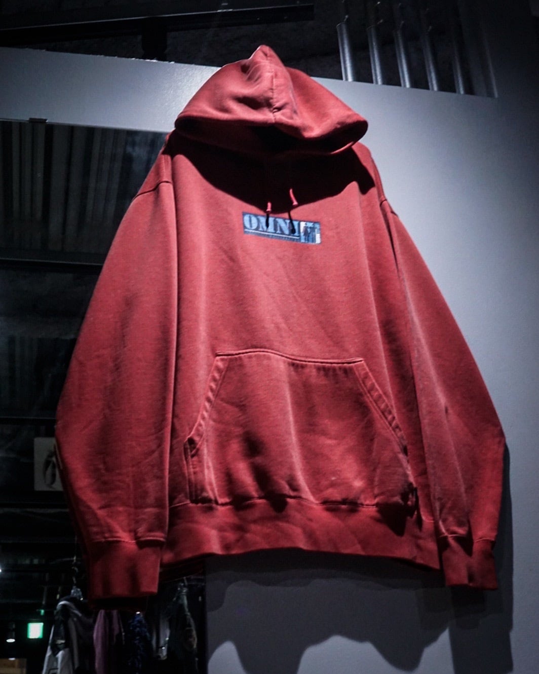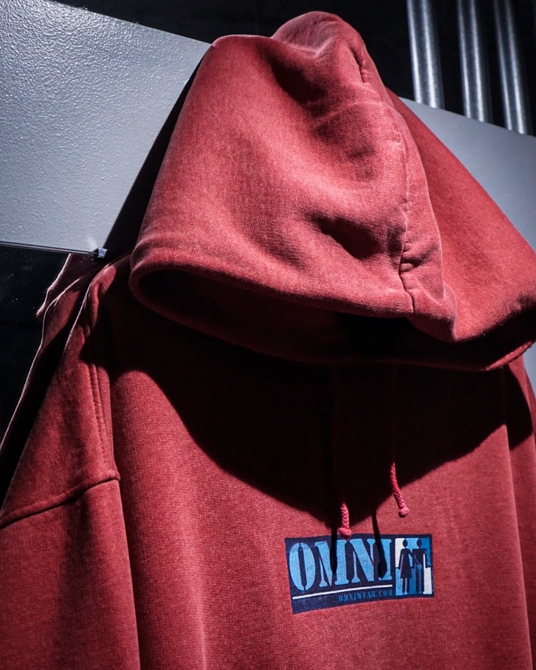 深みのあるレッドボディに、さりげないユーモアを入れたピクトグラム調ロゴデザインを配した“OMNI”のプルオーバーフーディ。