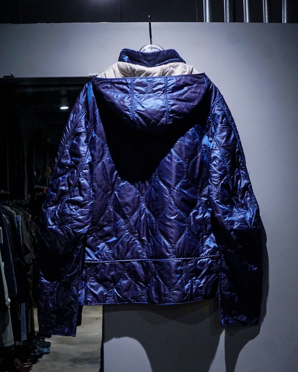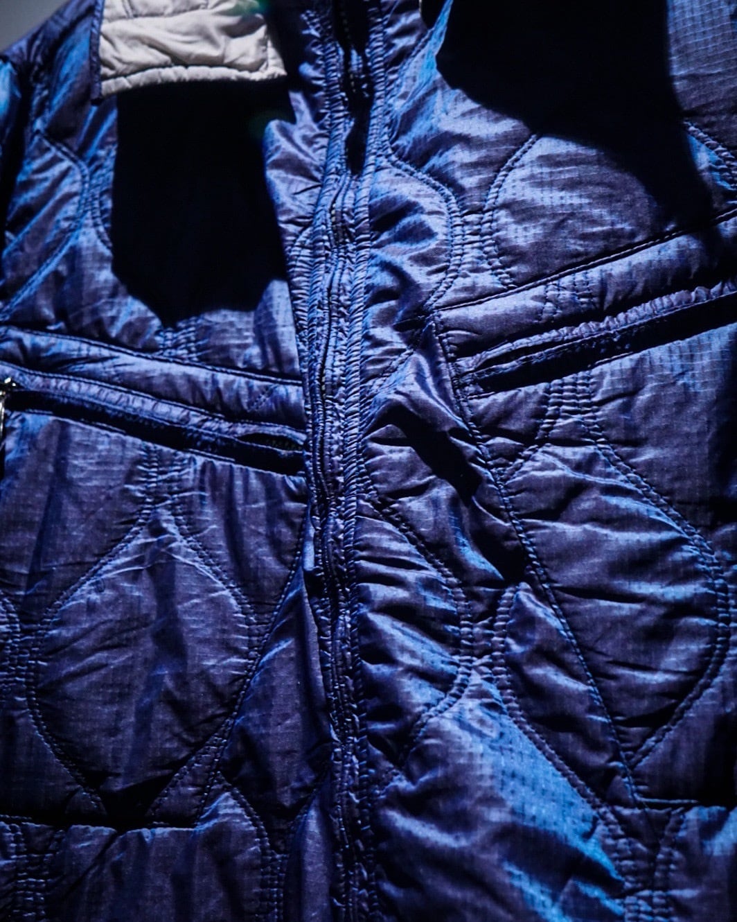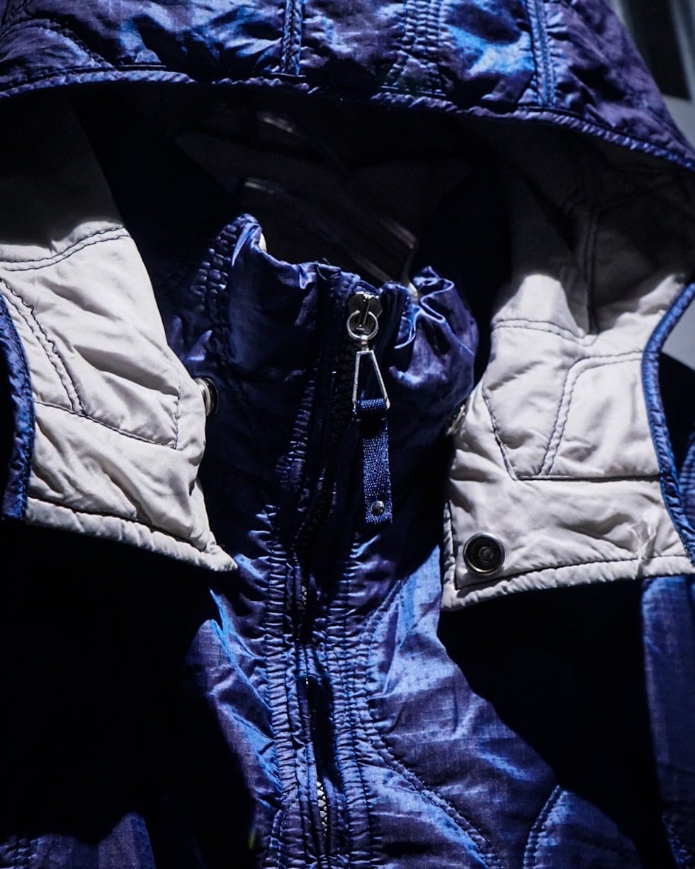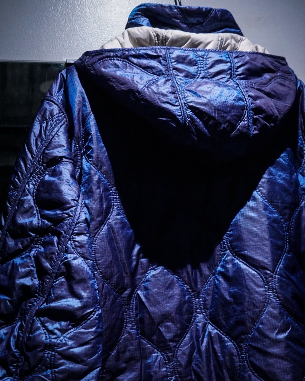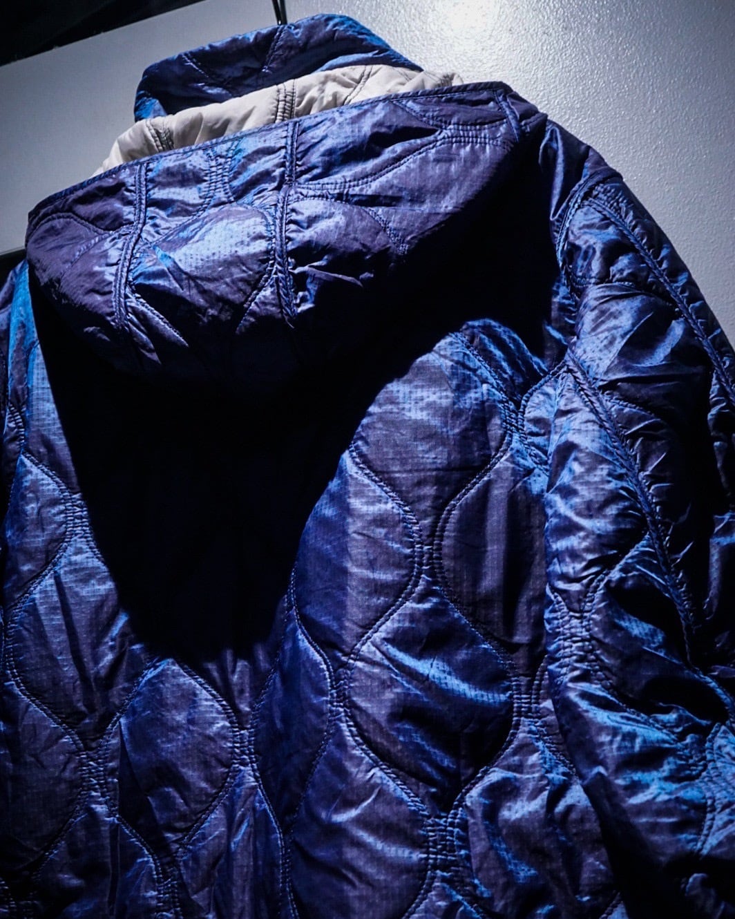 ボディ全体のキルトステッチが立体的な陰影を生み出し、ボリューム感を程よく抑えながらも存在感のあるシルエットを形成。フロントにはジップポケットを斜めに配置し、さらに、フード部分はジップによる着脱が可能で、スタンドカラーとしても着用できる2WAY仕様となっています。