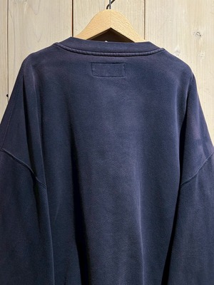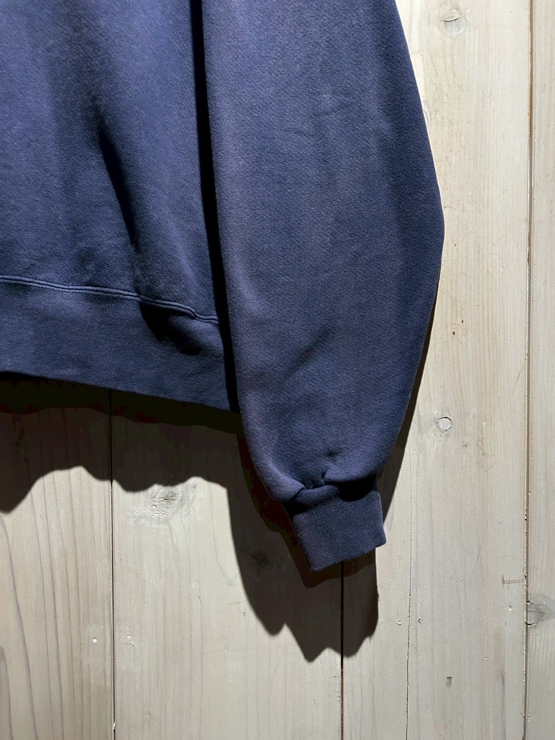 ボディはコットン×ポリエステルの肉厚なスウェット地。経年によりフェードした深みのあるパープルが、サンフェード特有のムードを漂わせています。