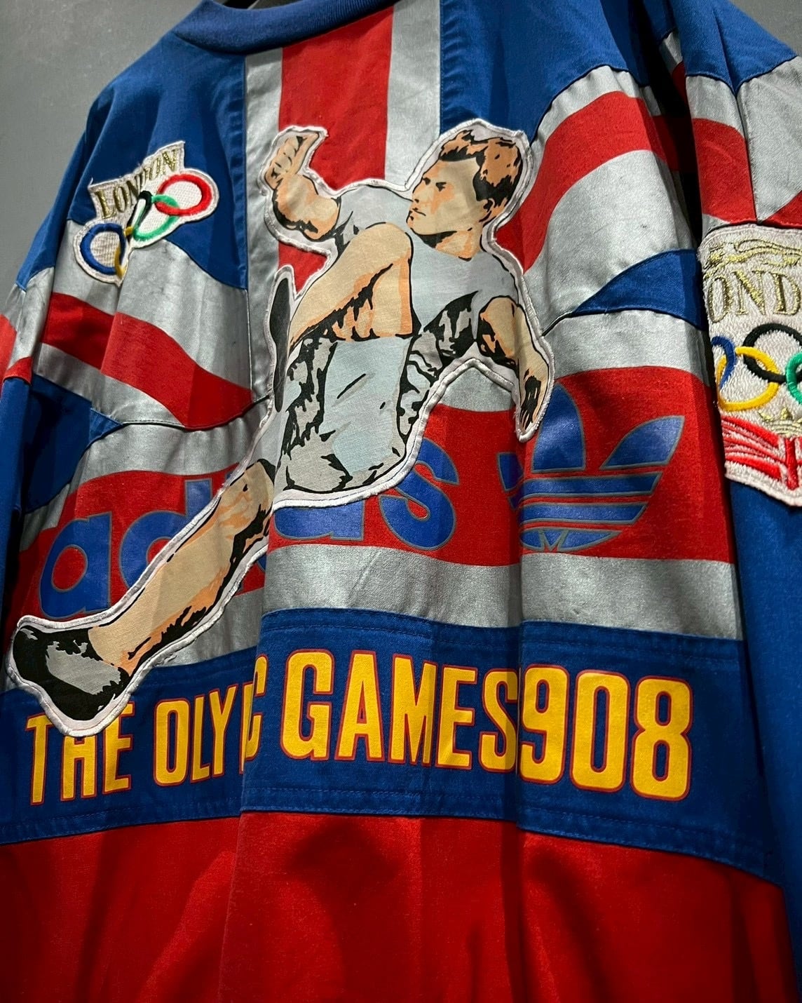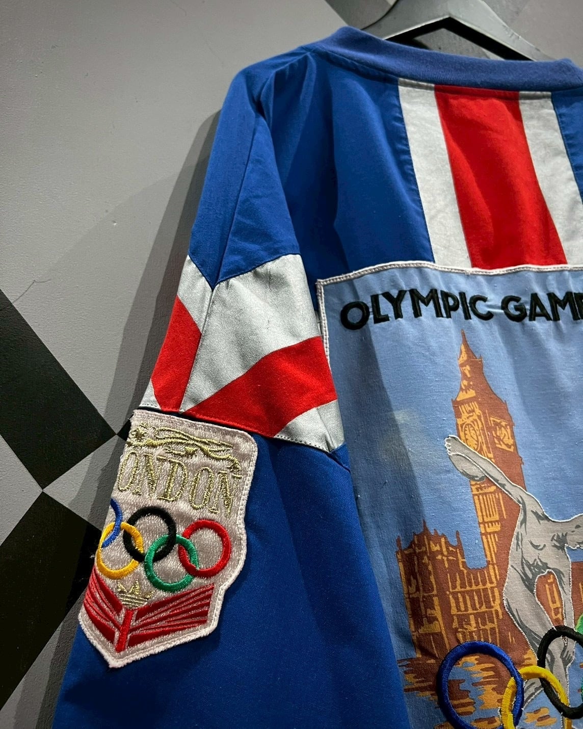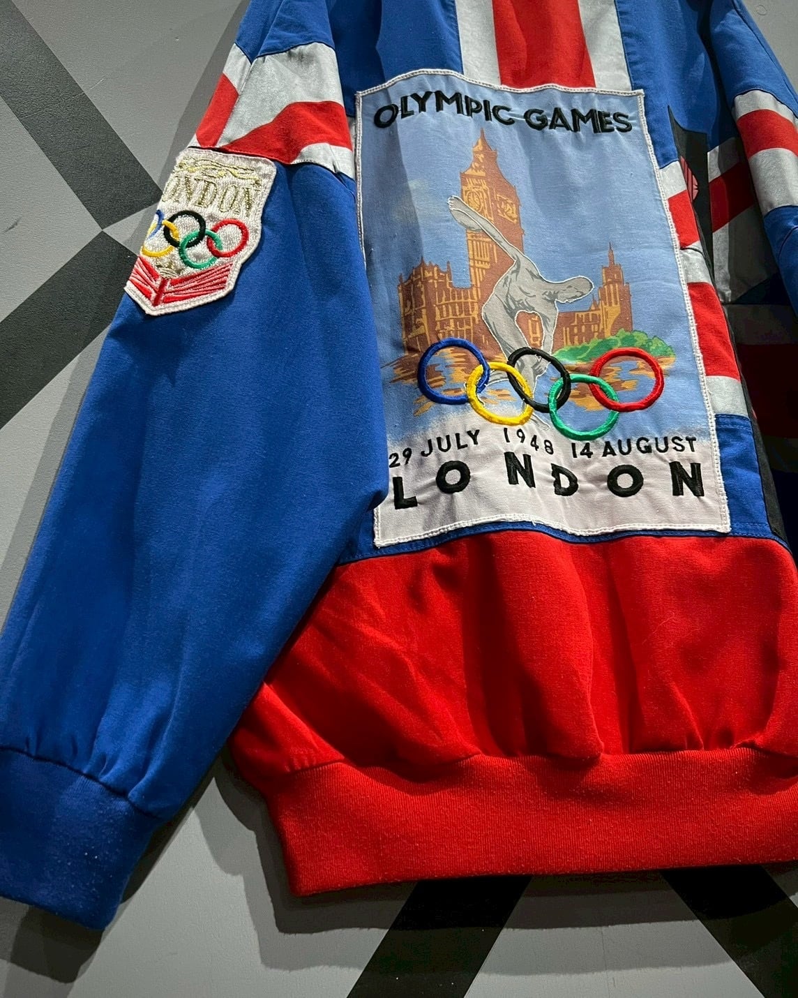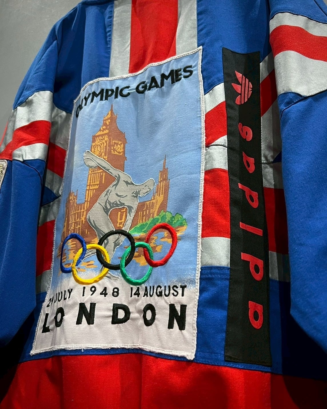 ボディ全体にはユニオンジャックを大胆に配し、中央にはアスリートの躍動を描いたパッチを配置。背面には1948年ロンドン大会の記念グラフィックパッチ、両袖や背面には五輪と“LONDON”刺繍ワッペンが施され、存在感を余すところなく表現しています。