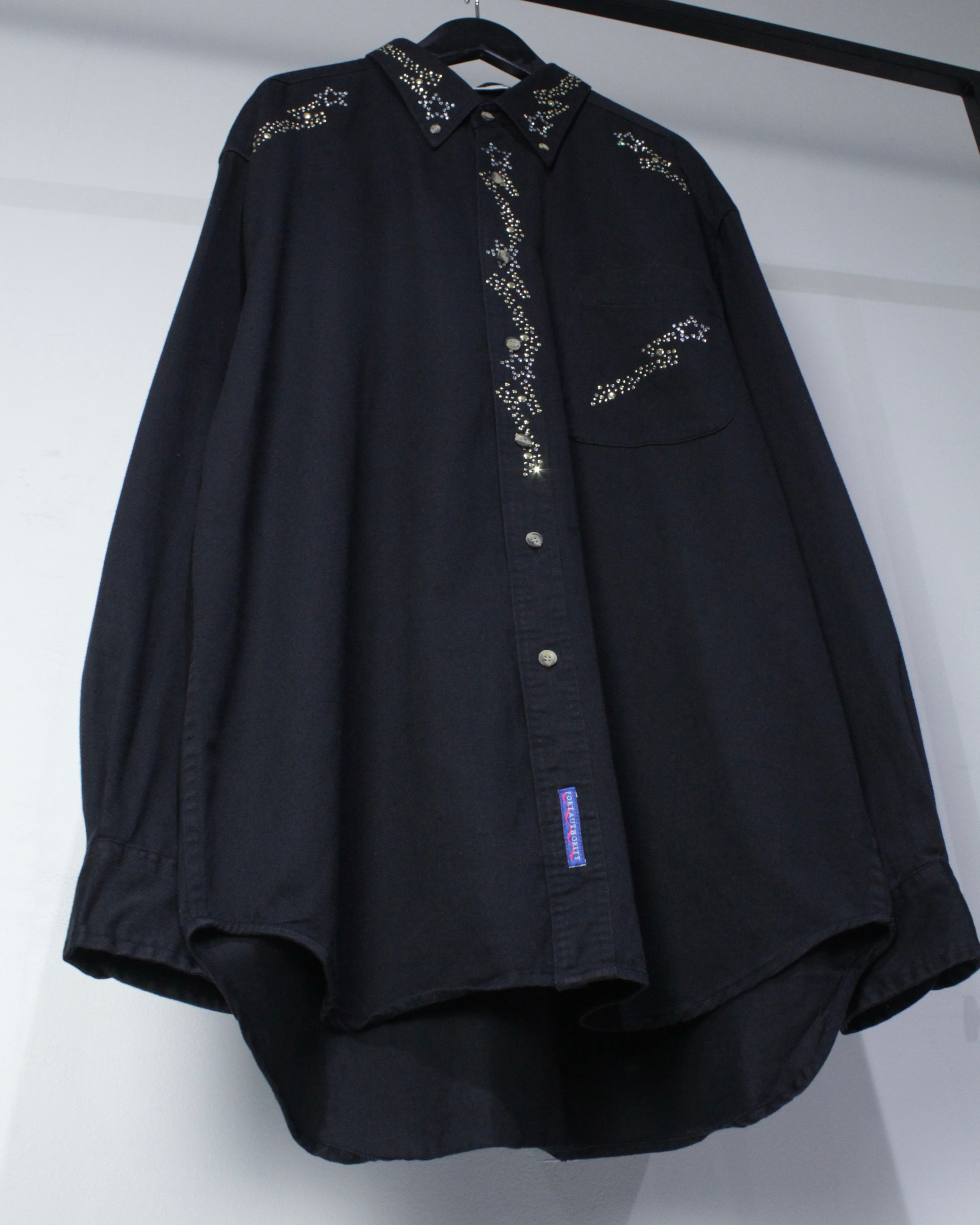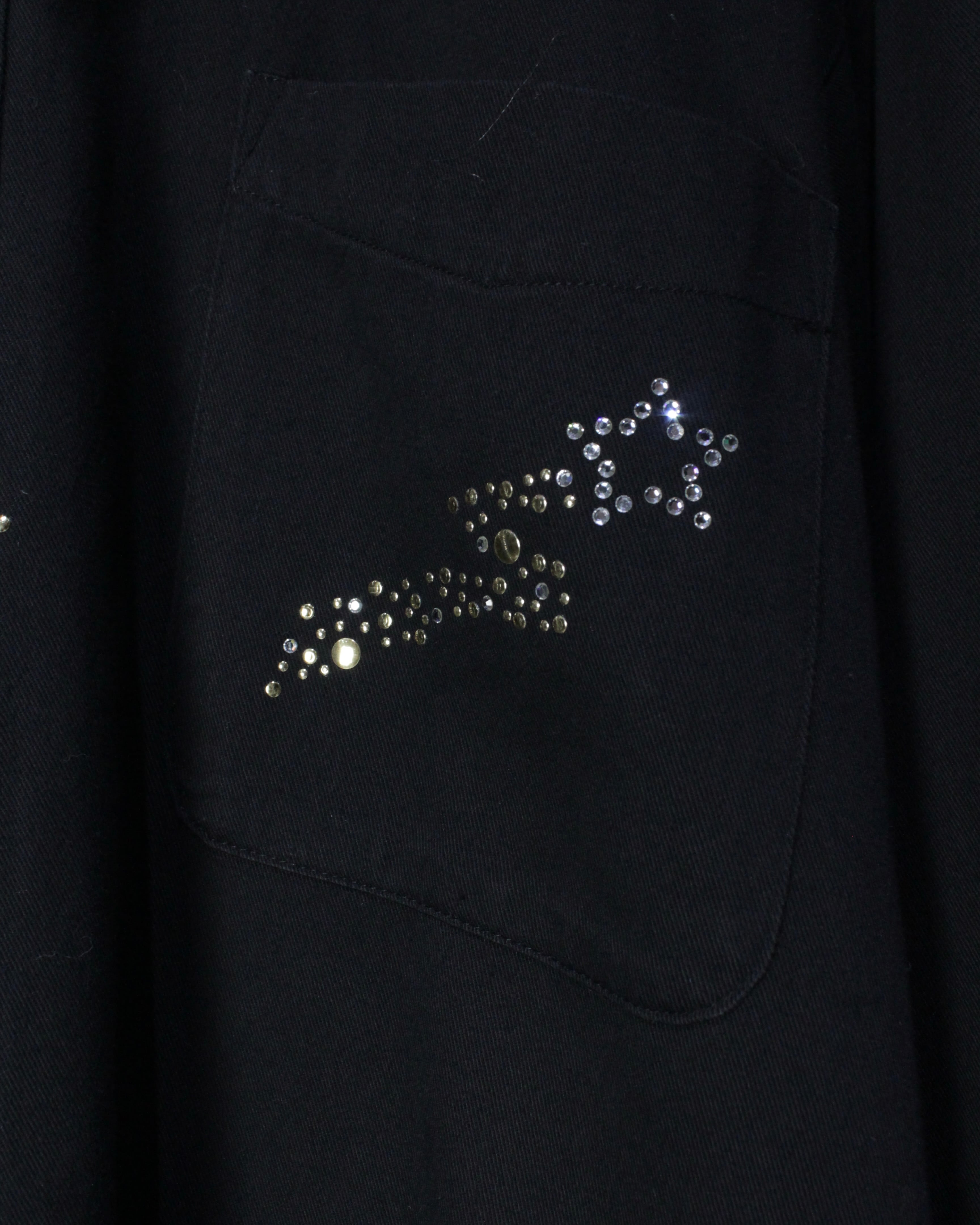 マットなブラックボディに、ゴールドとクリアのラインストーンを星が流れるようにカスタムした、アート性の高いデザインシャツ。