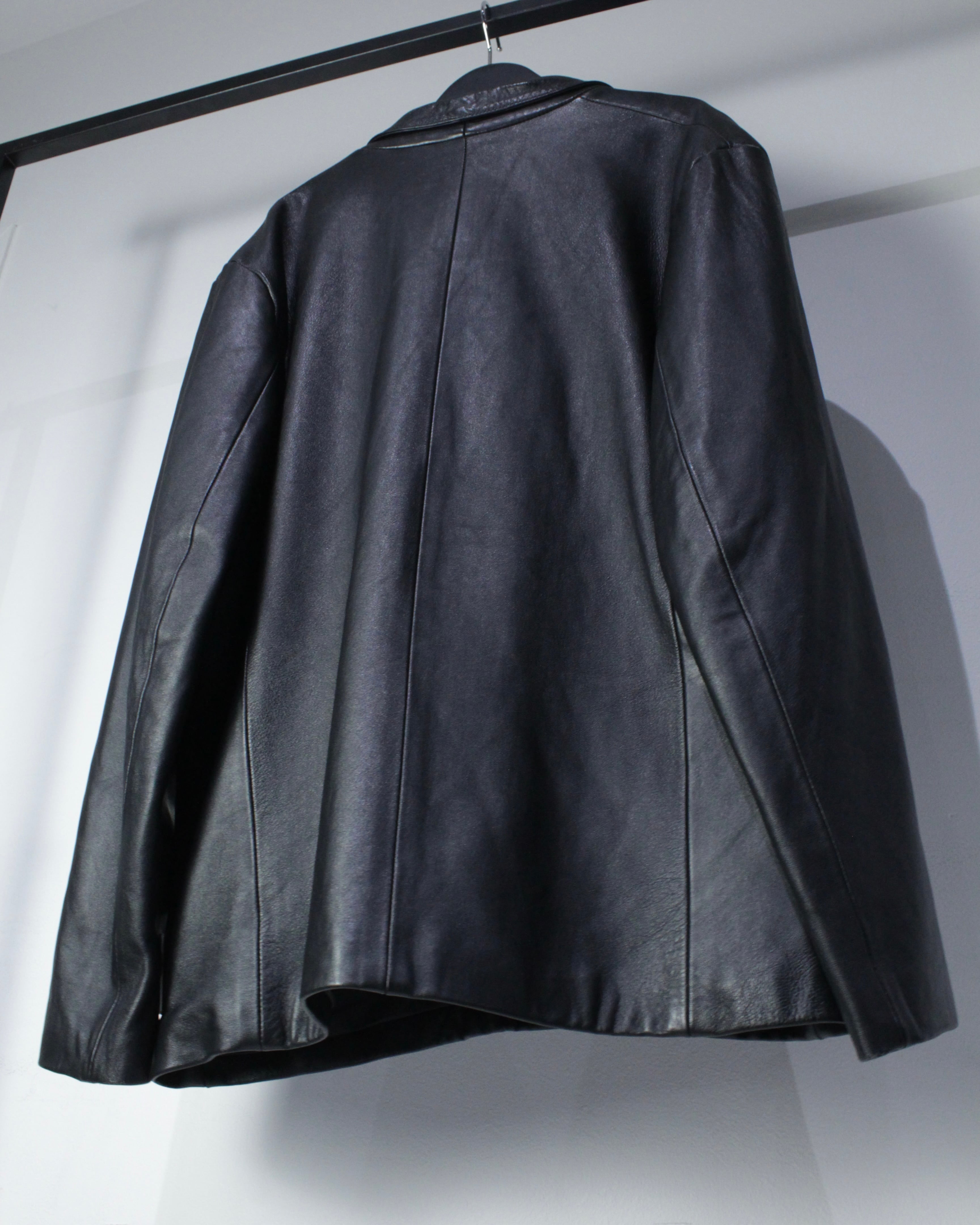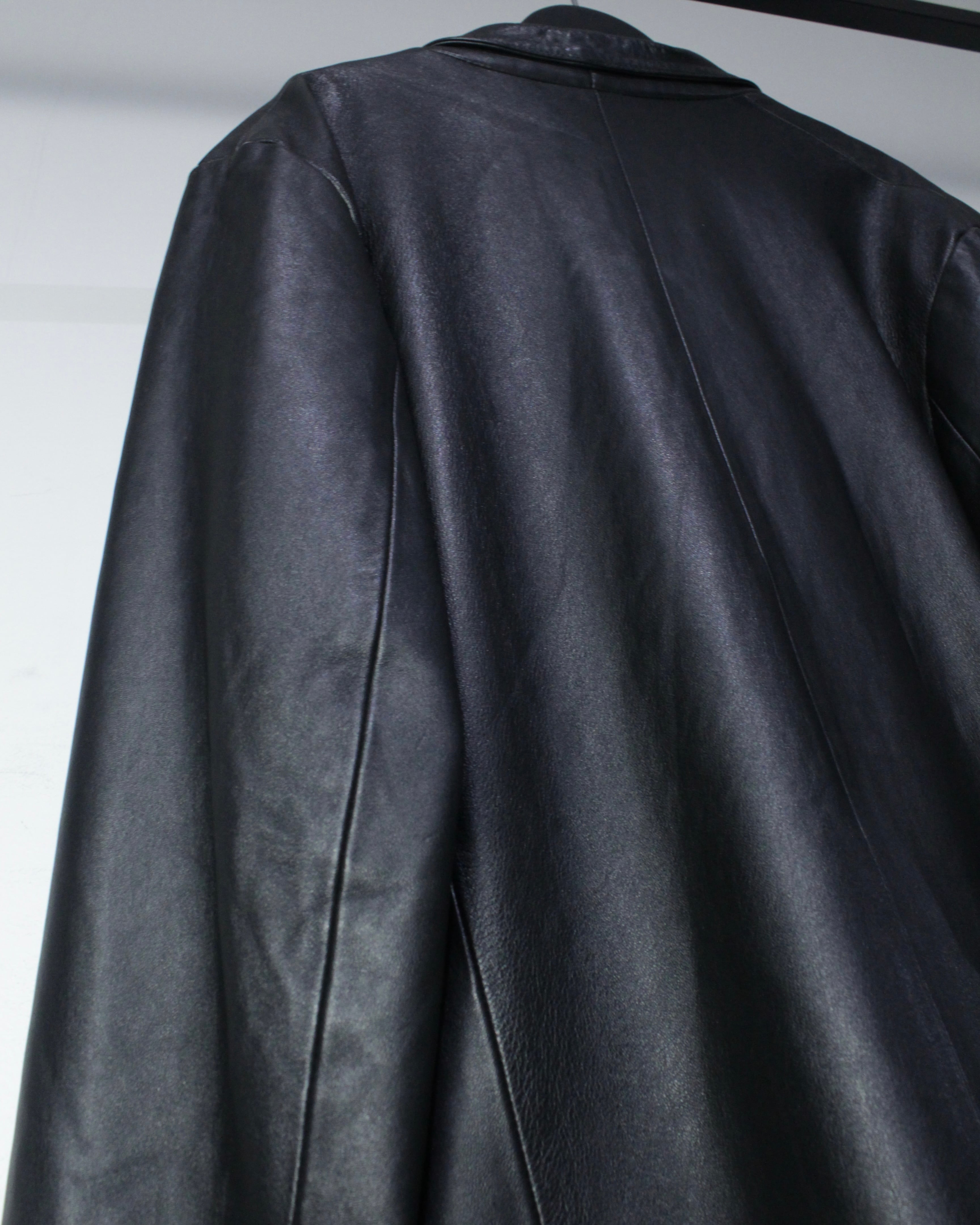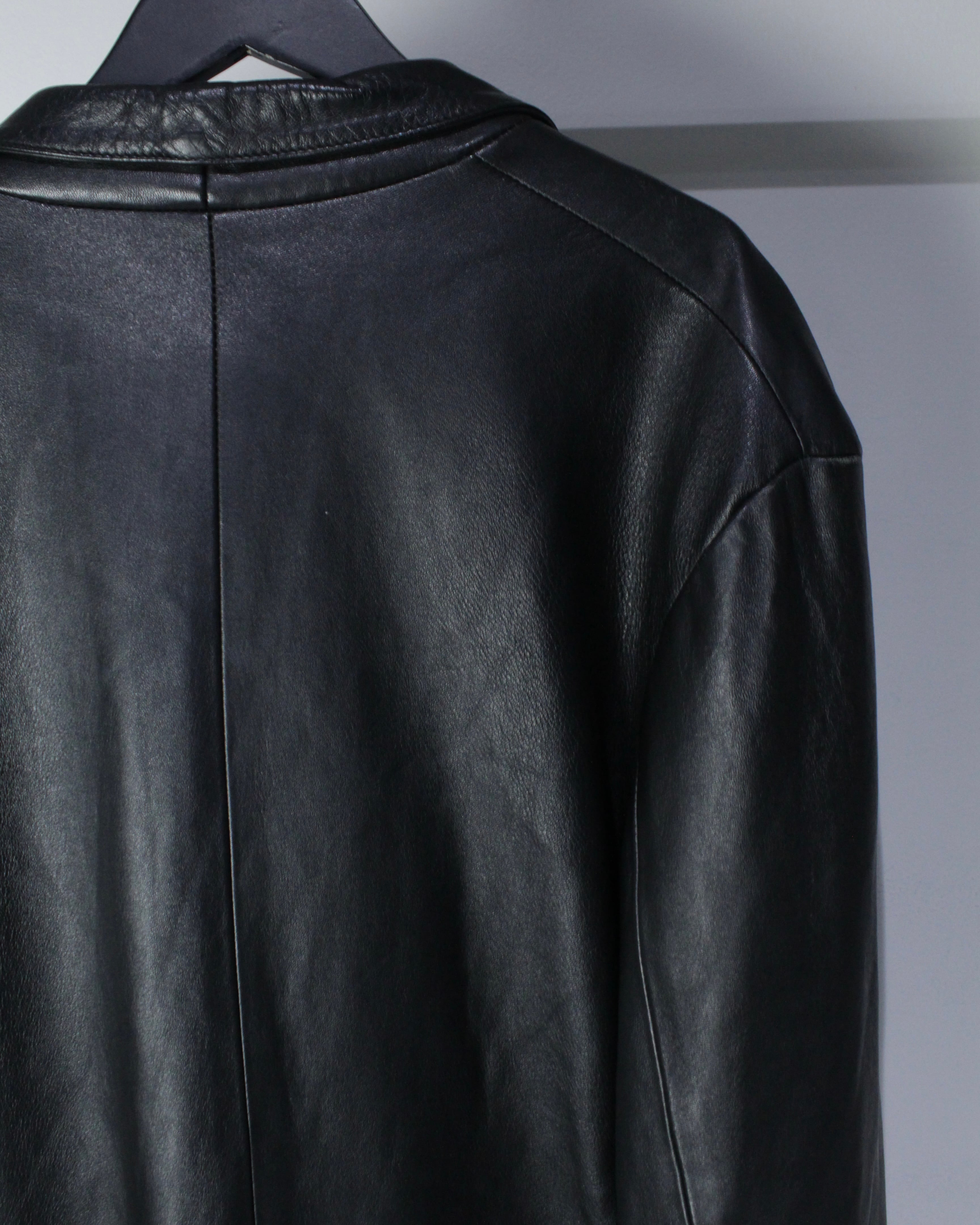 しっとりとした艶を放つ極上のブラックレザーを贅沢に使用した、モードとクラシックな雰囲気を併せ持ったレザーテーラードジャケット。