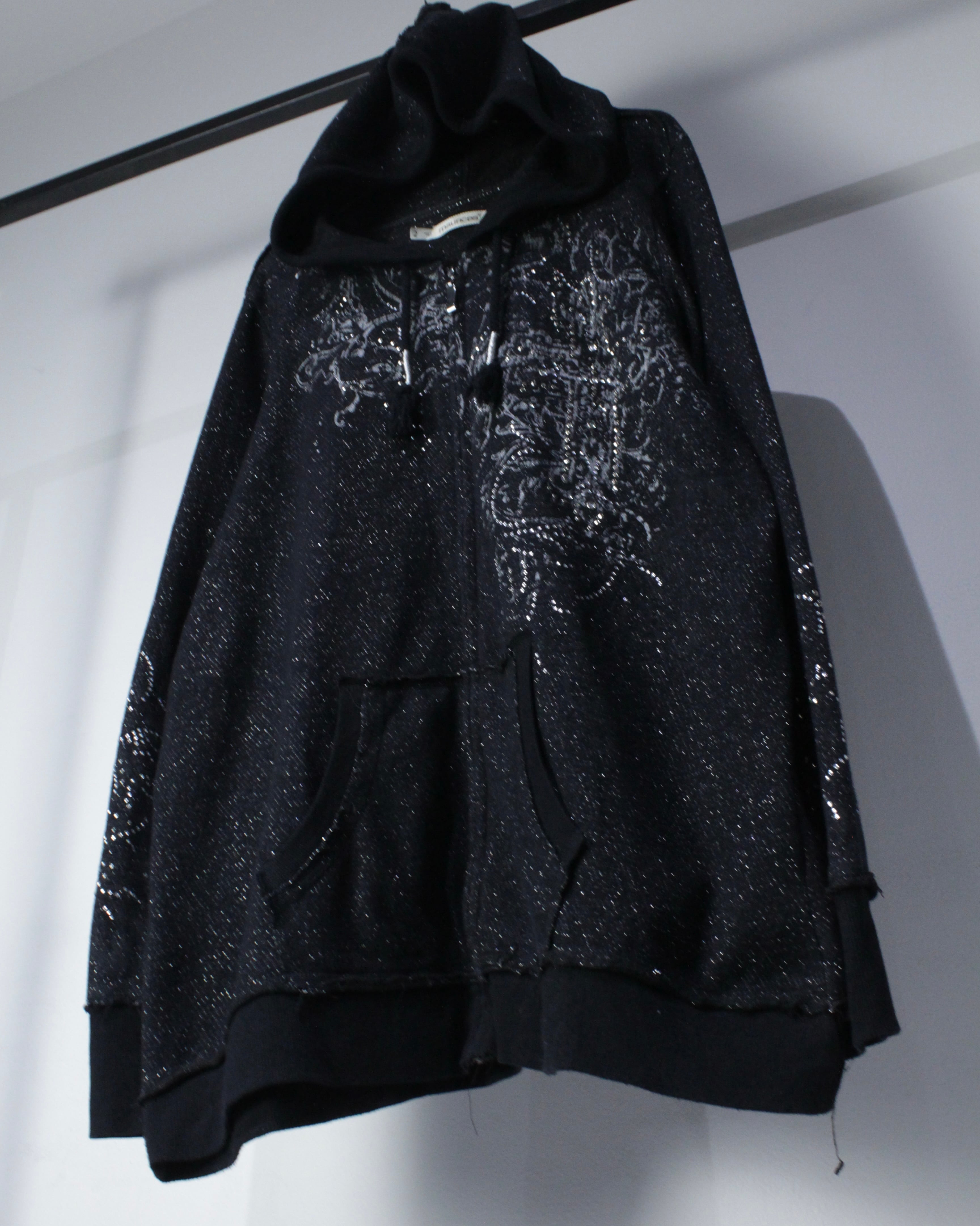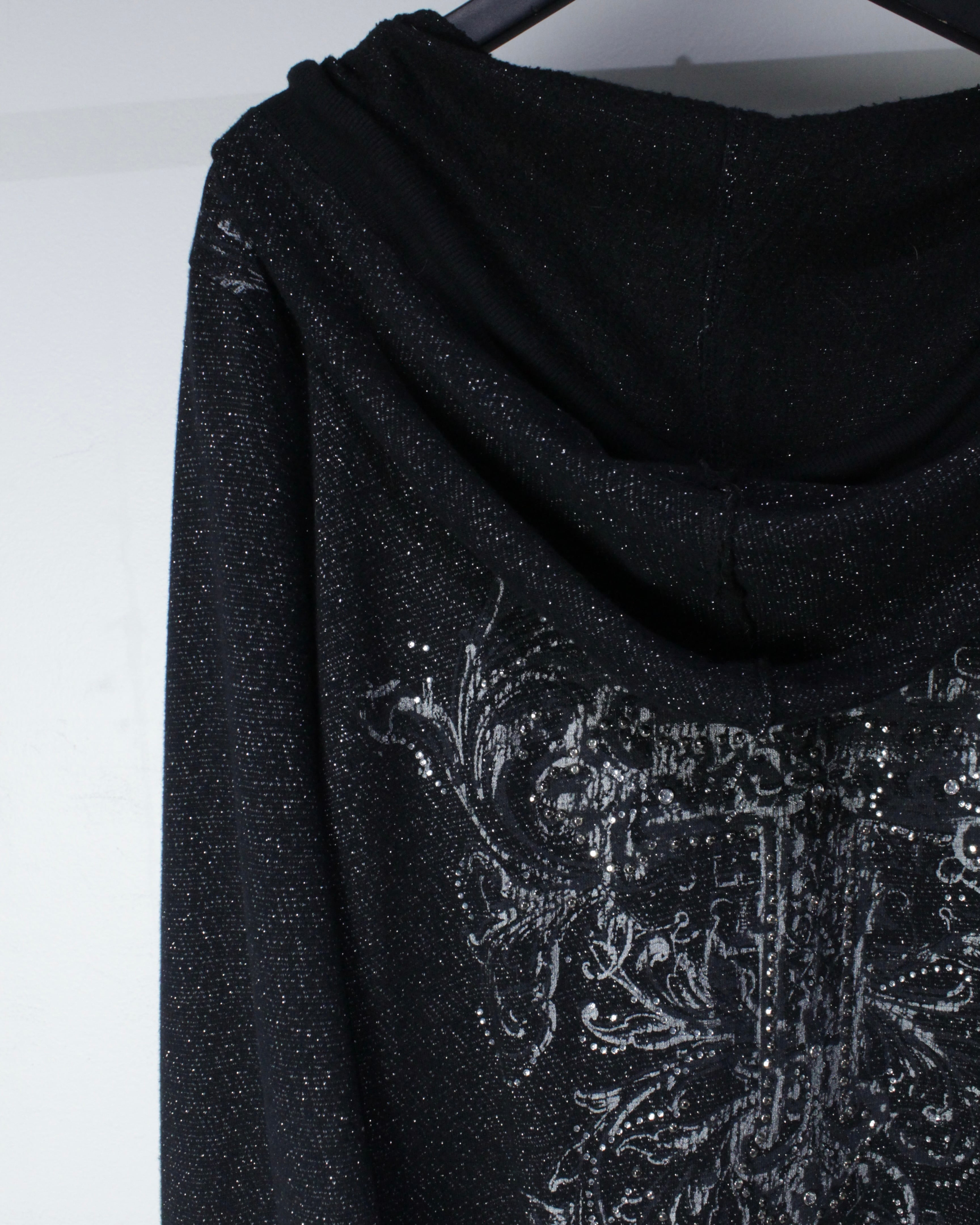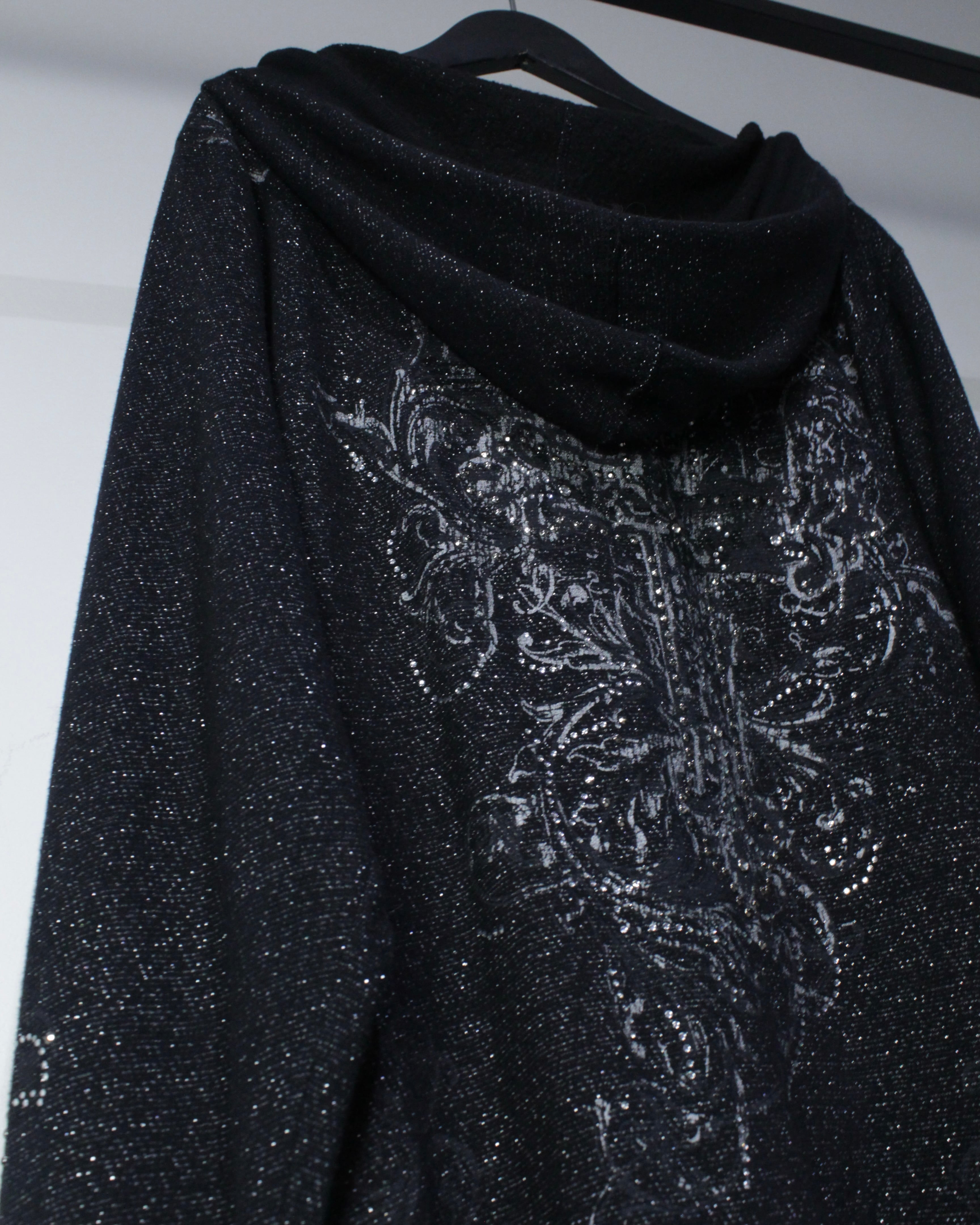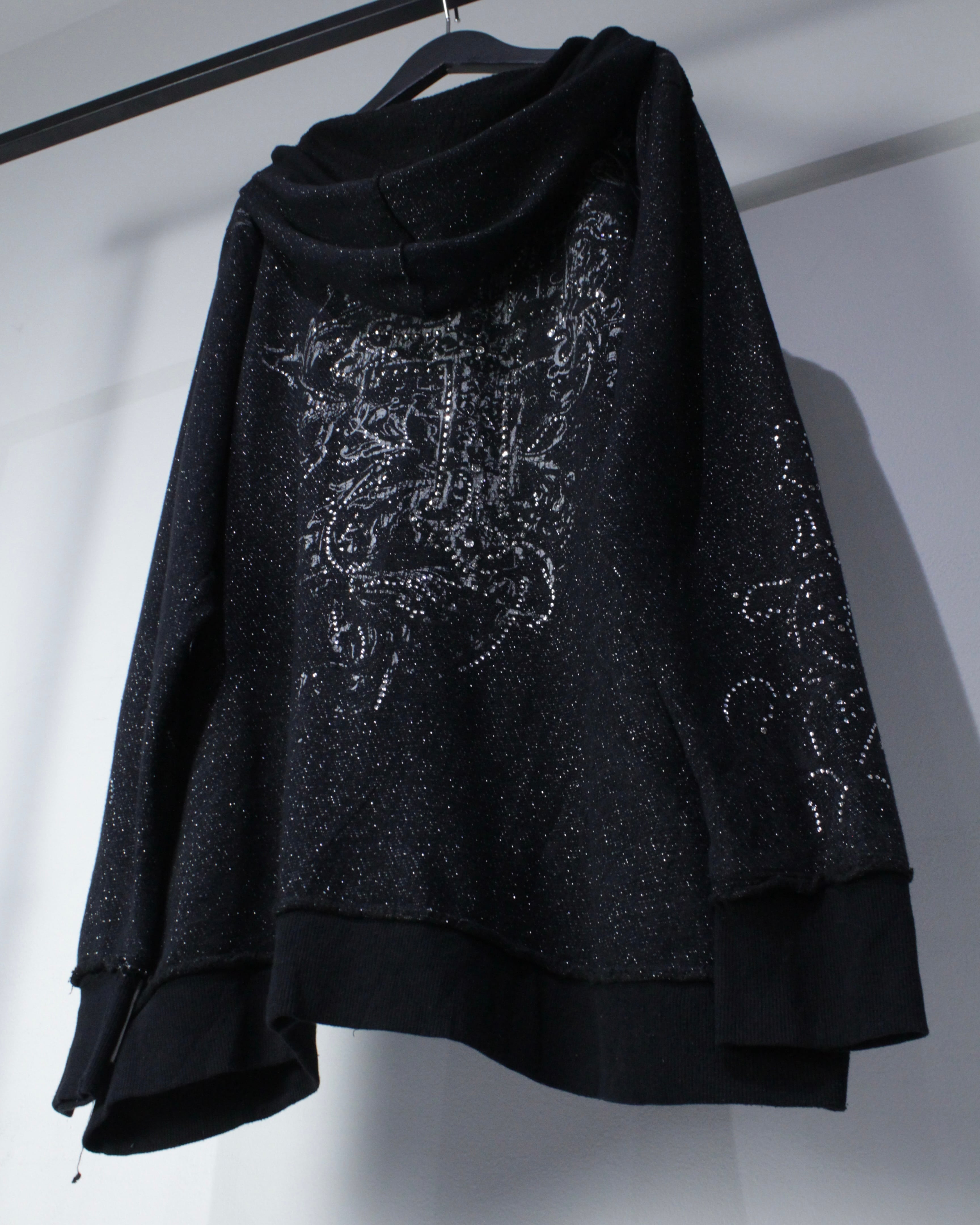 全体にラメ糸を織り込んだブラックボディに、クロスモチーフを中心としたゴシック調グラフィックとラインストーン装飾を散りばめたジップアップフーディ。