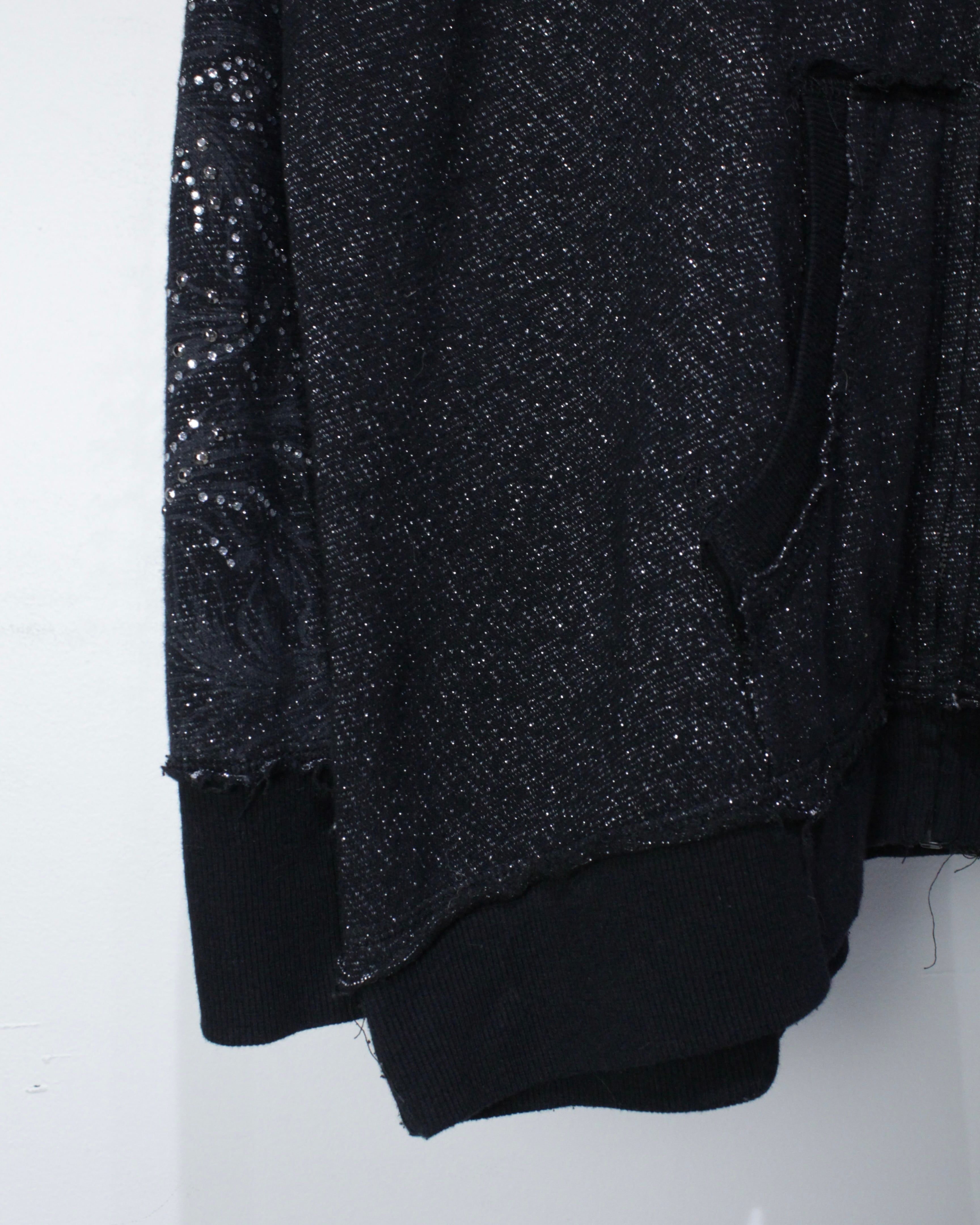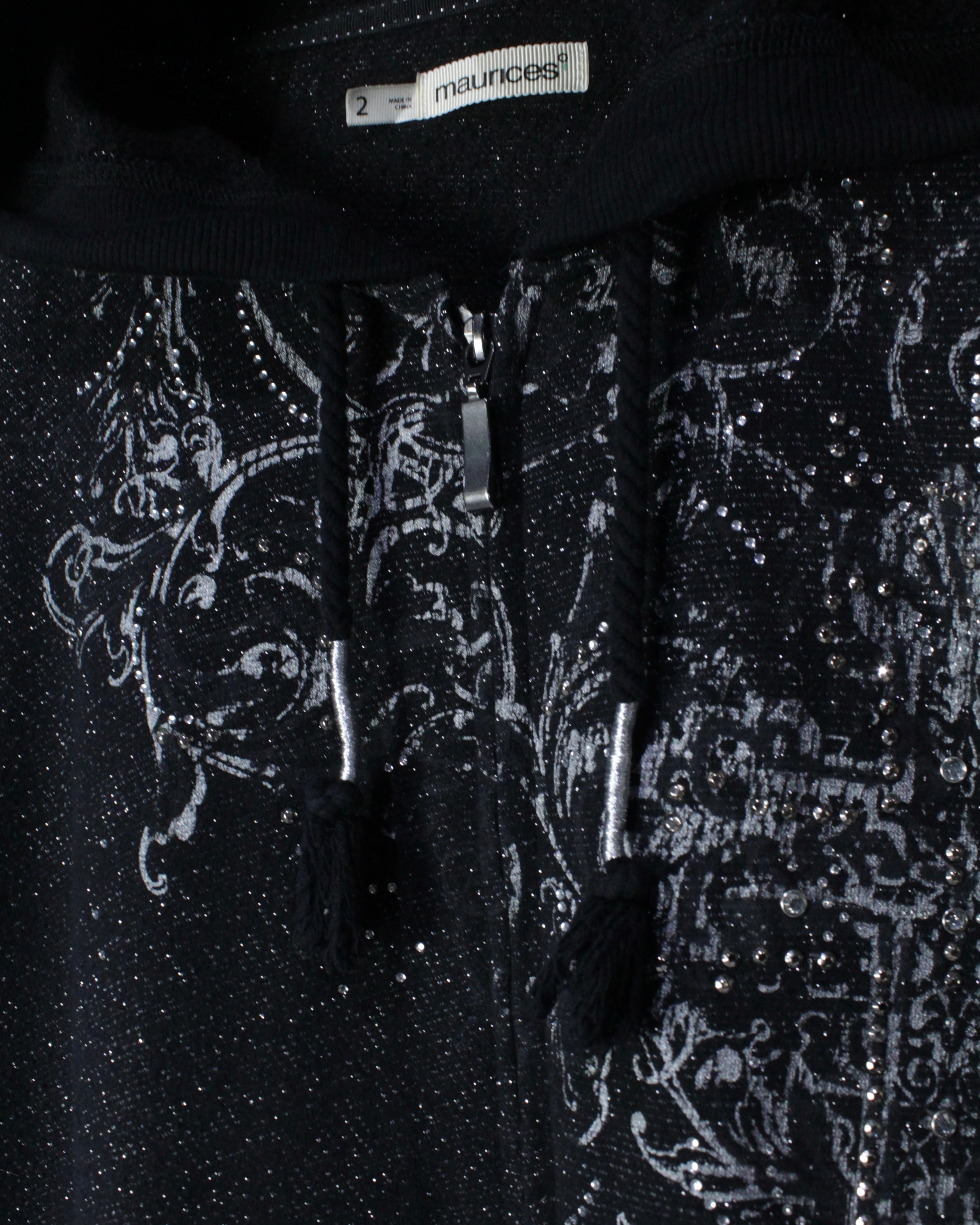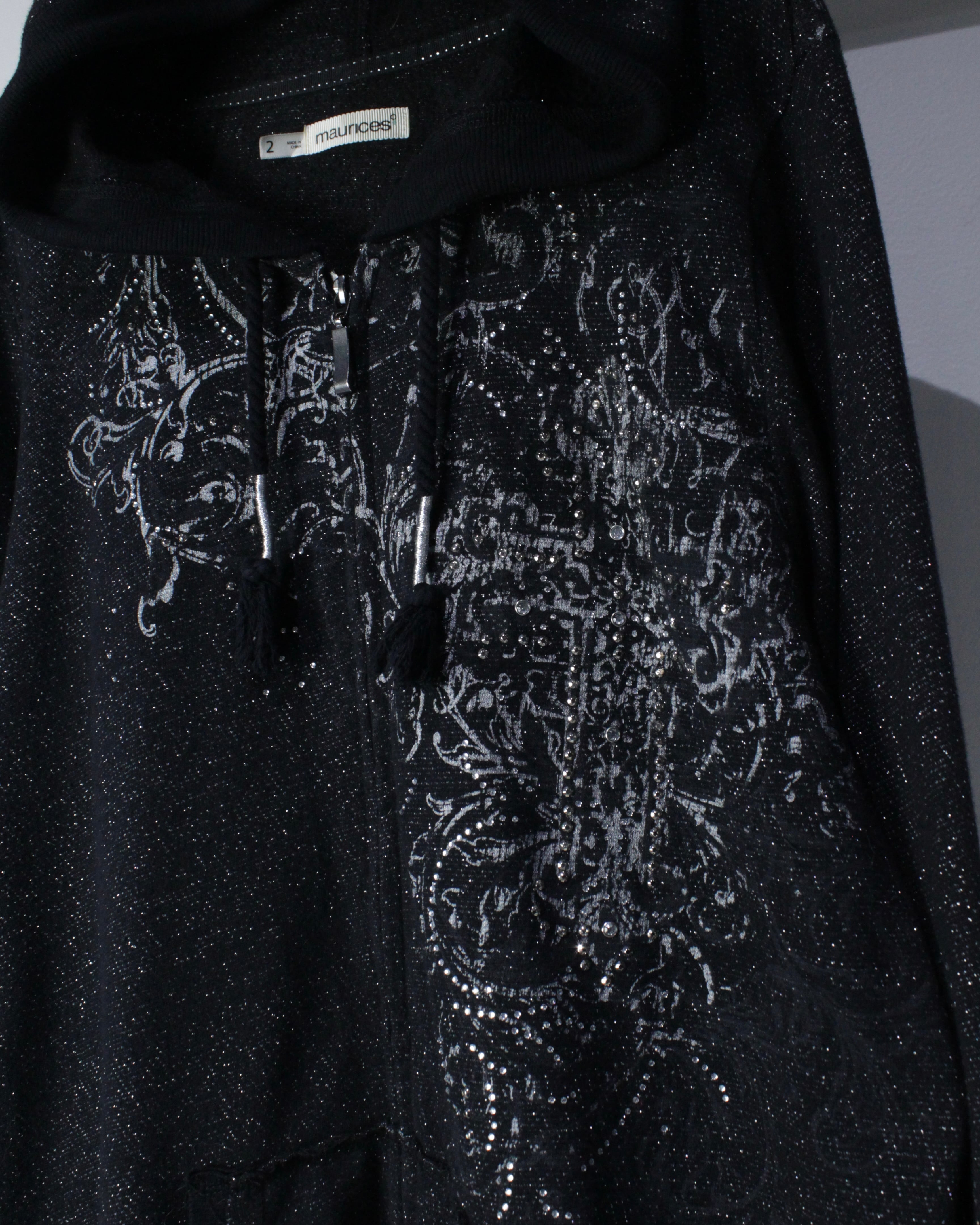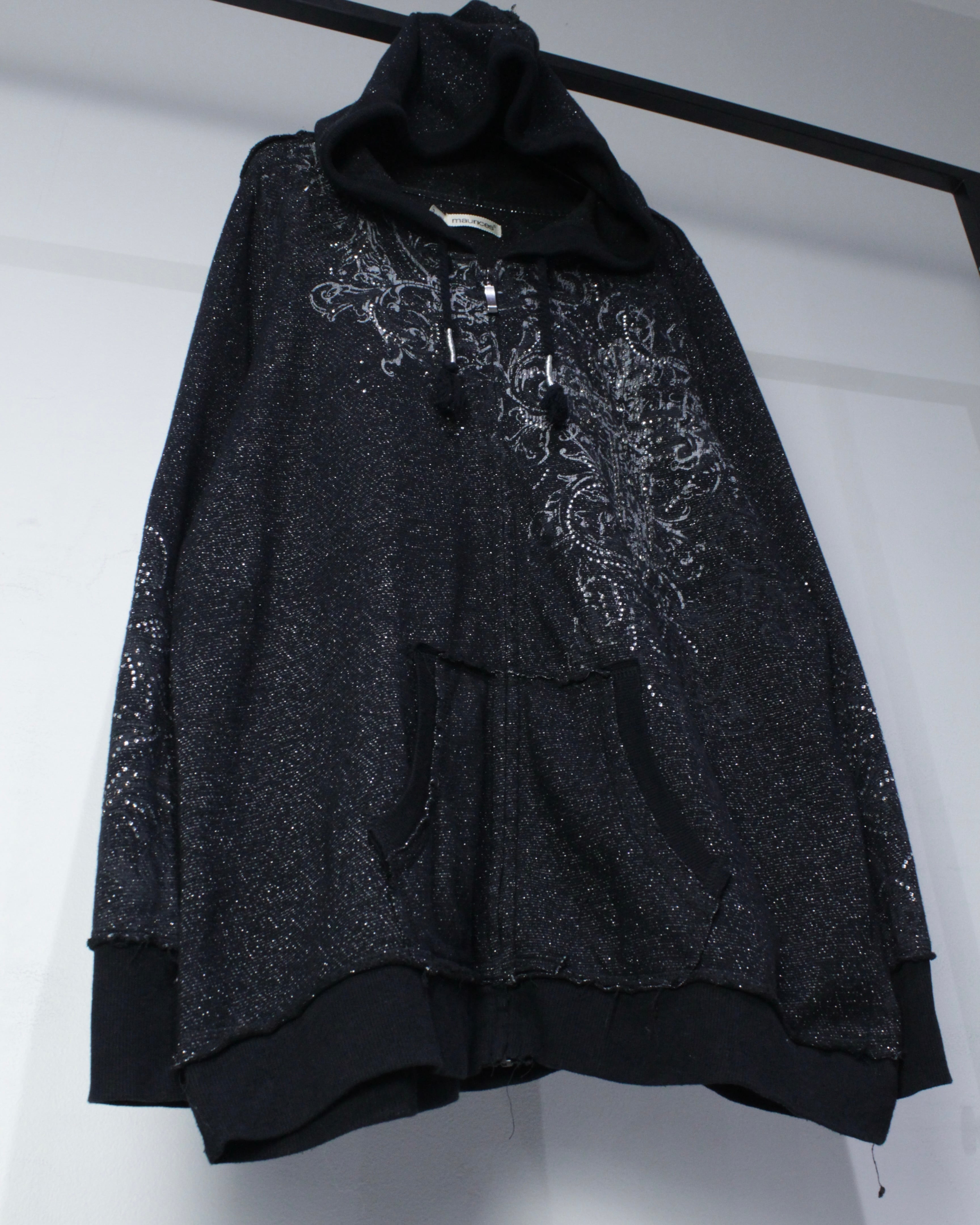 全体にラメ糸を織り込んだブラックボディに、クロスモチーフを中心としたゴシック調グラフィックとラインストーン装飾を散りばめたジップアップフーディ。