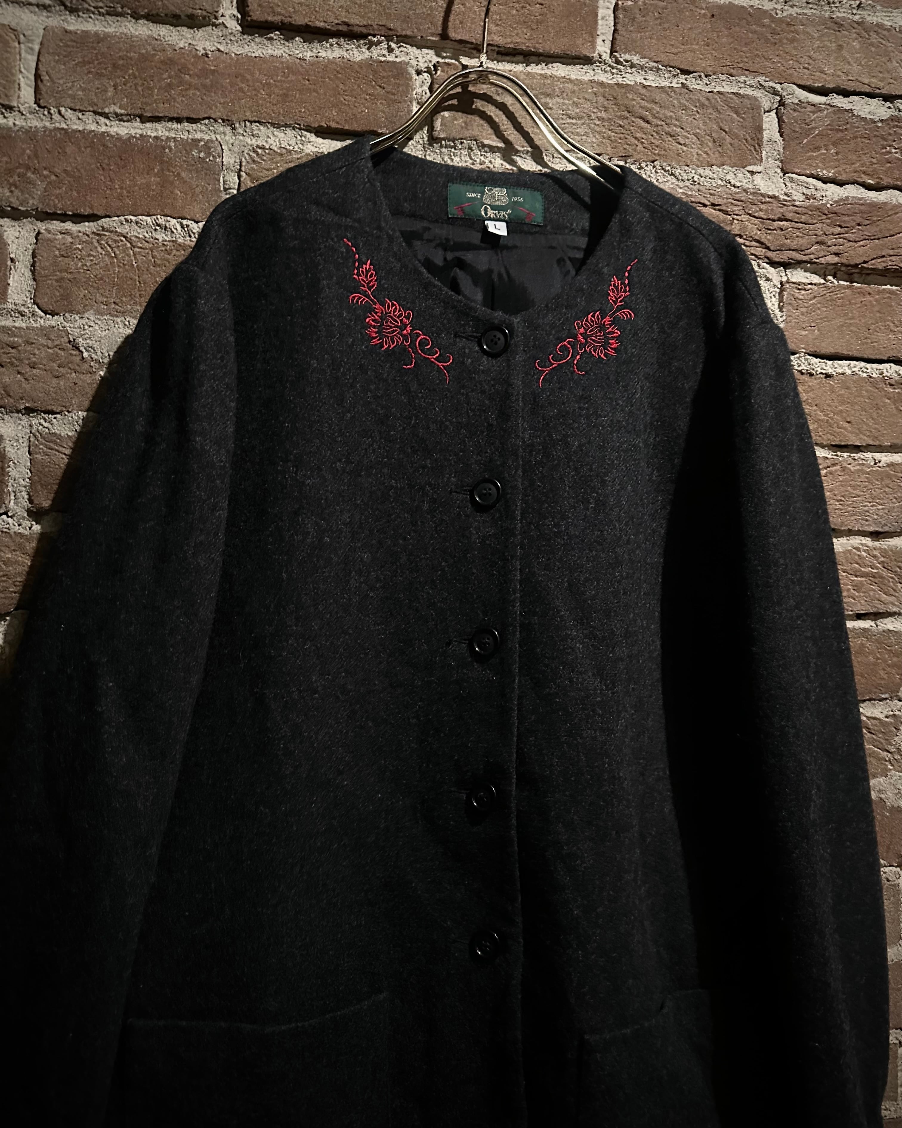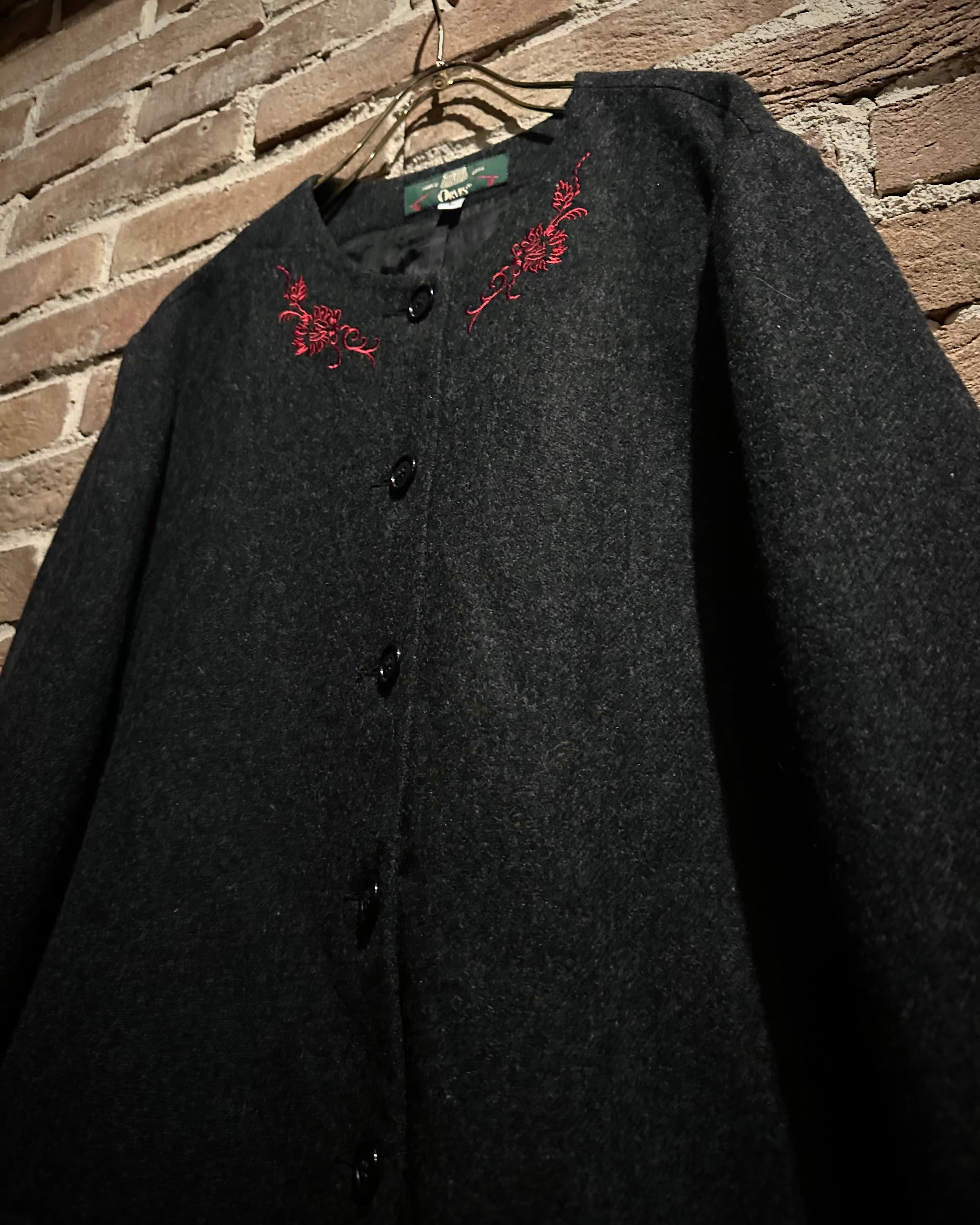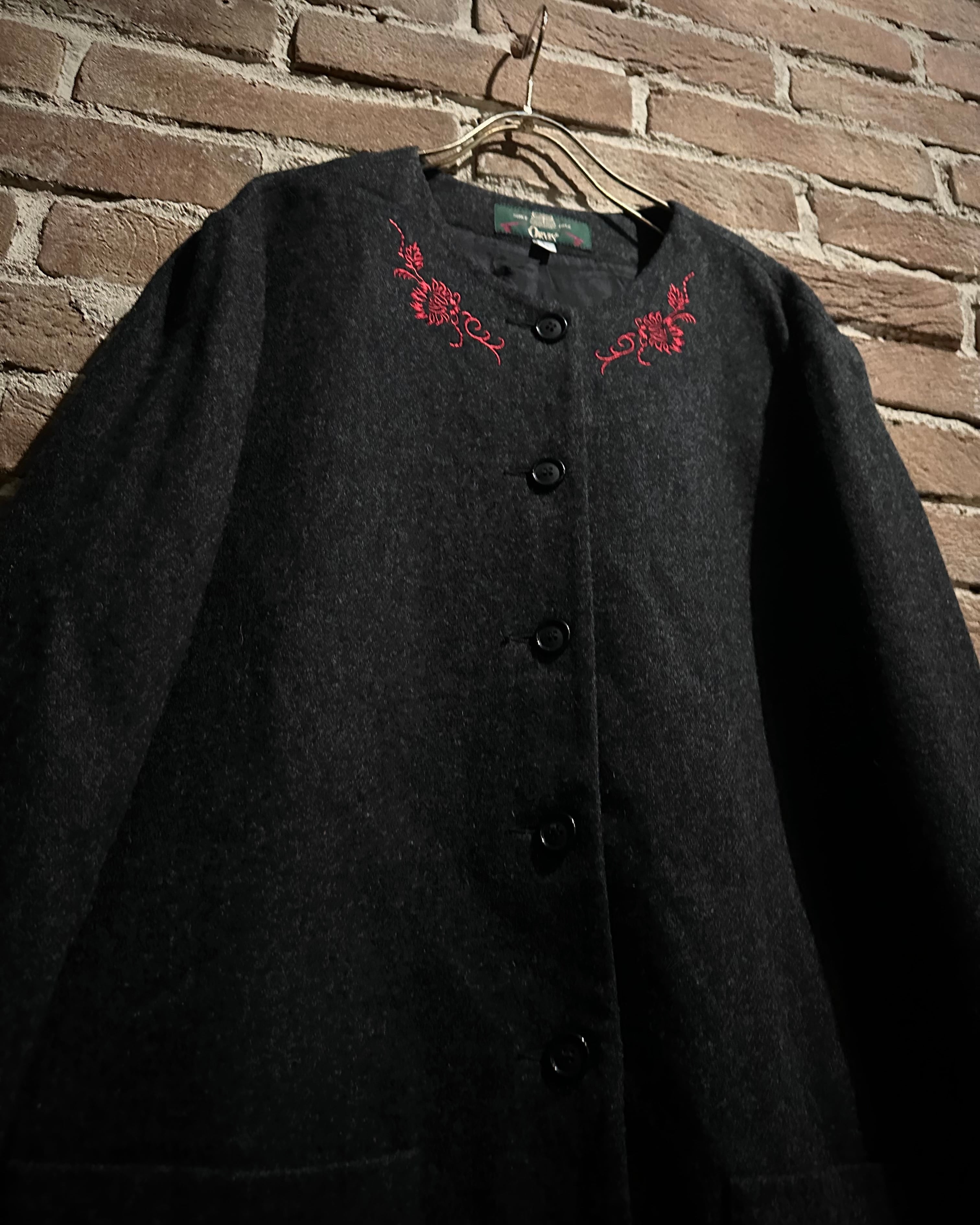 深みのあるチャコールグレーのボディは、柔らかく起毛したウールを使用。ネックラインには赤のボタニカル柄刺繍が施され、シンプルな構成の中に優美なアクセントを添えています。