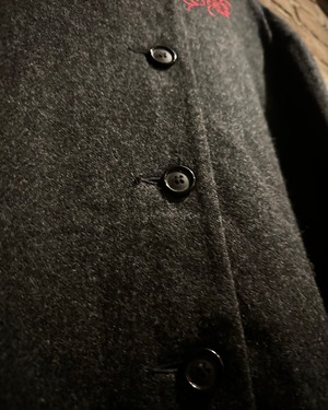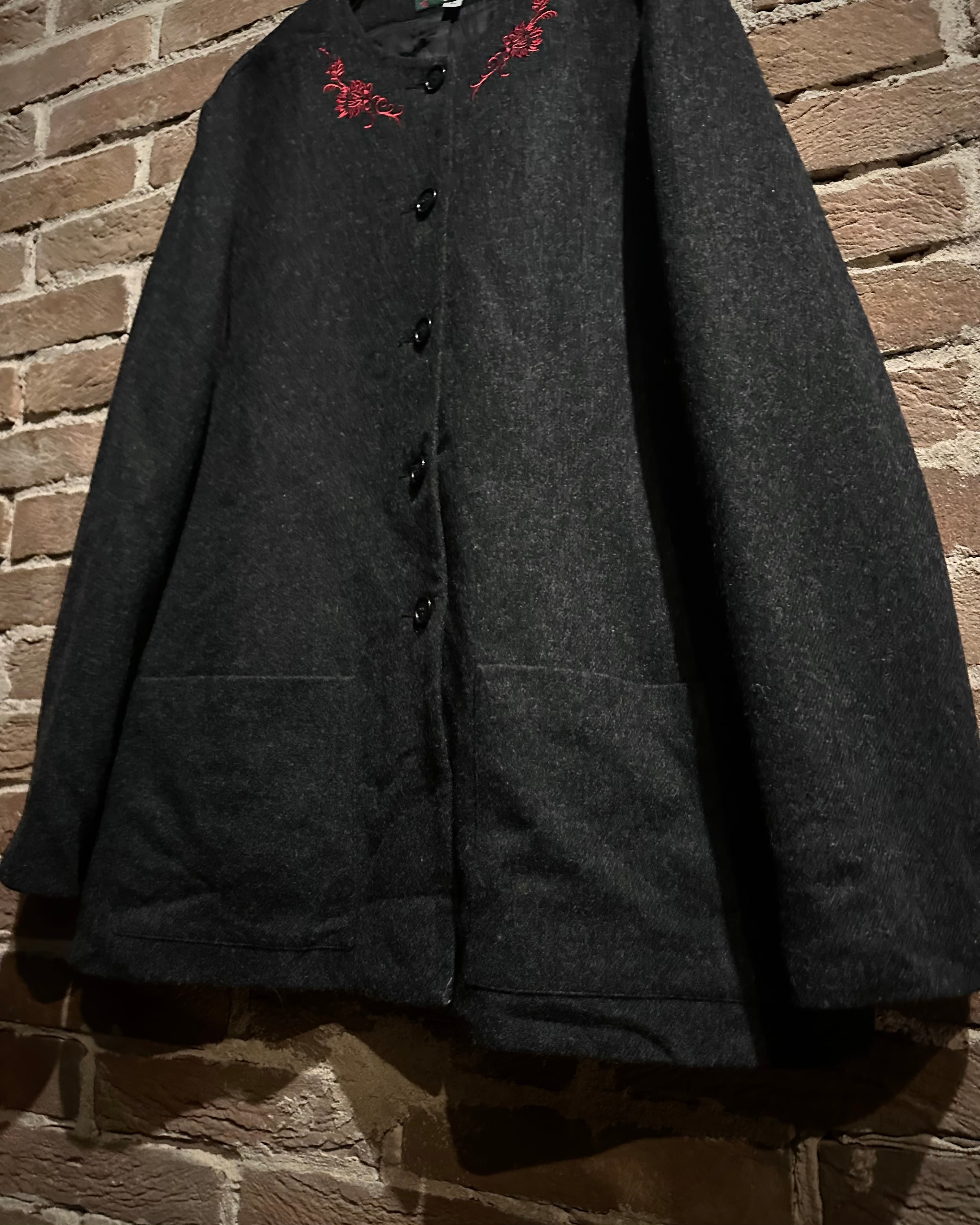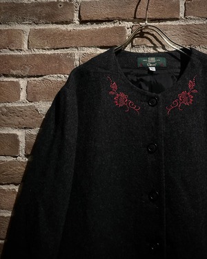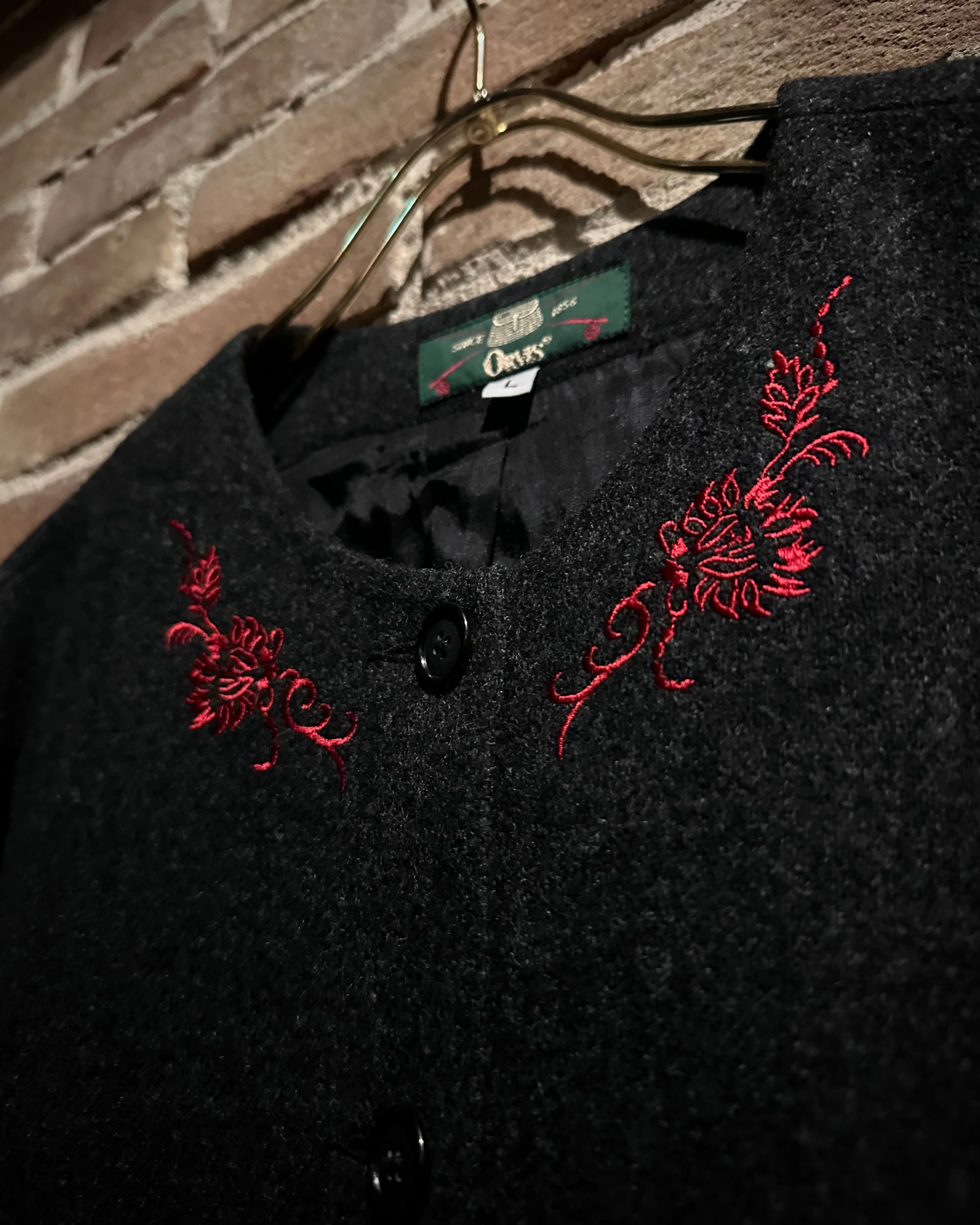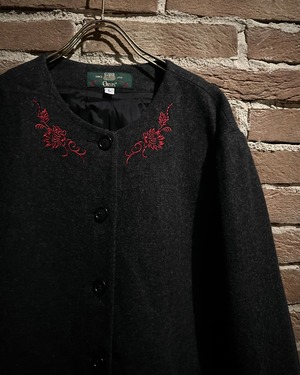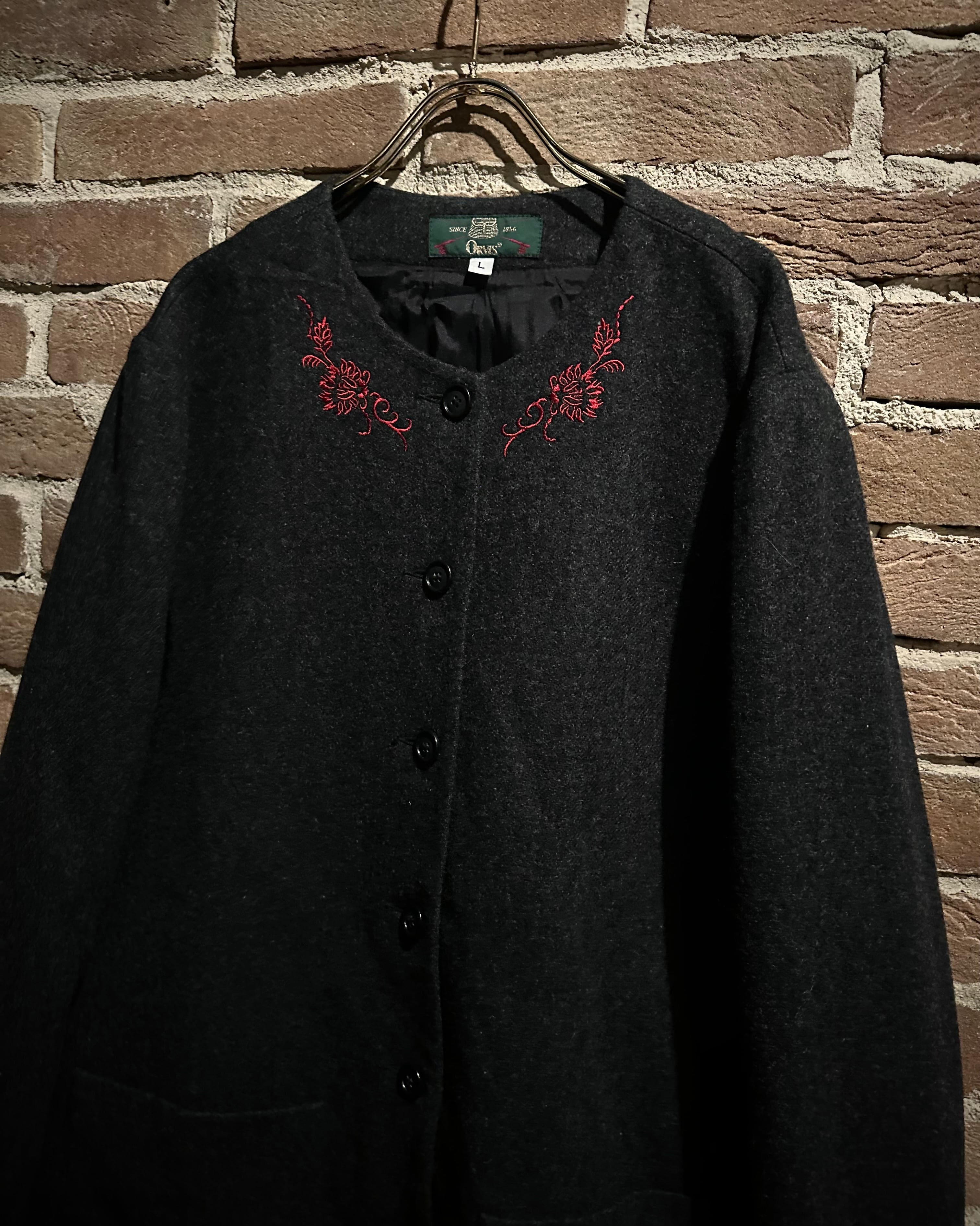深みのあるチャコールグレーのボディは、柔らかく起毛したウールを使用。ネックラインには赤のボタニカル柄刺繍が施され、シンプルな構成の中に優美なアクセントを添えています。