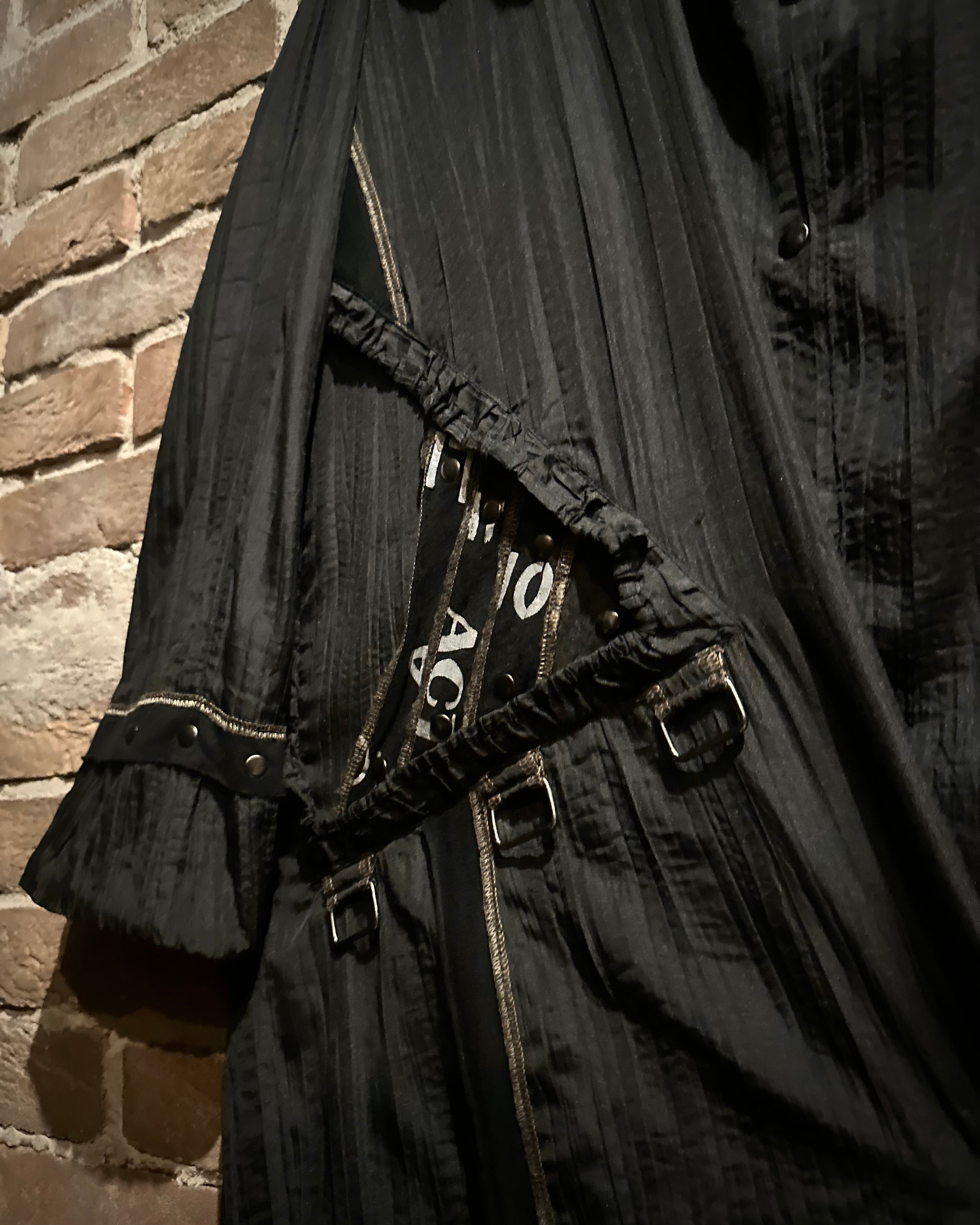 プリーツ加工を施したテキスタイルを用いて、フロントから背面にかけて配されたストラップベルトや菅、スタッズ、そしてリングパーツなど、随所に施されたギミックがアーティスティックかつモードな雰囲気を強調。胸元のリングにはタッセルが垂れ、動きに合わせて揺らめくことで独特の存在感を放ちます。