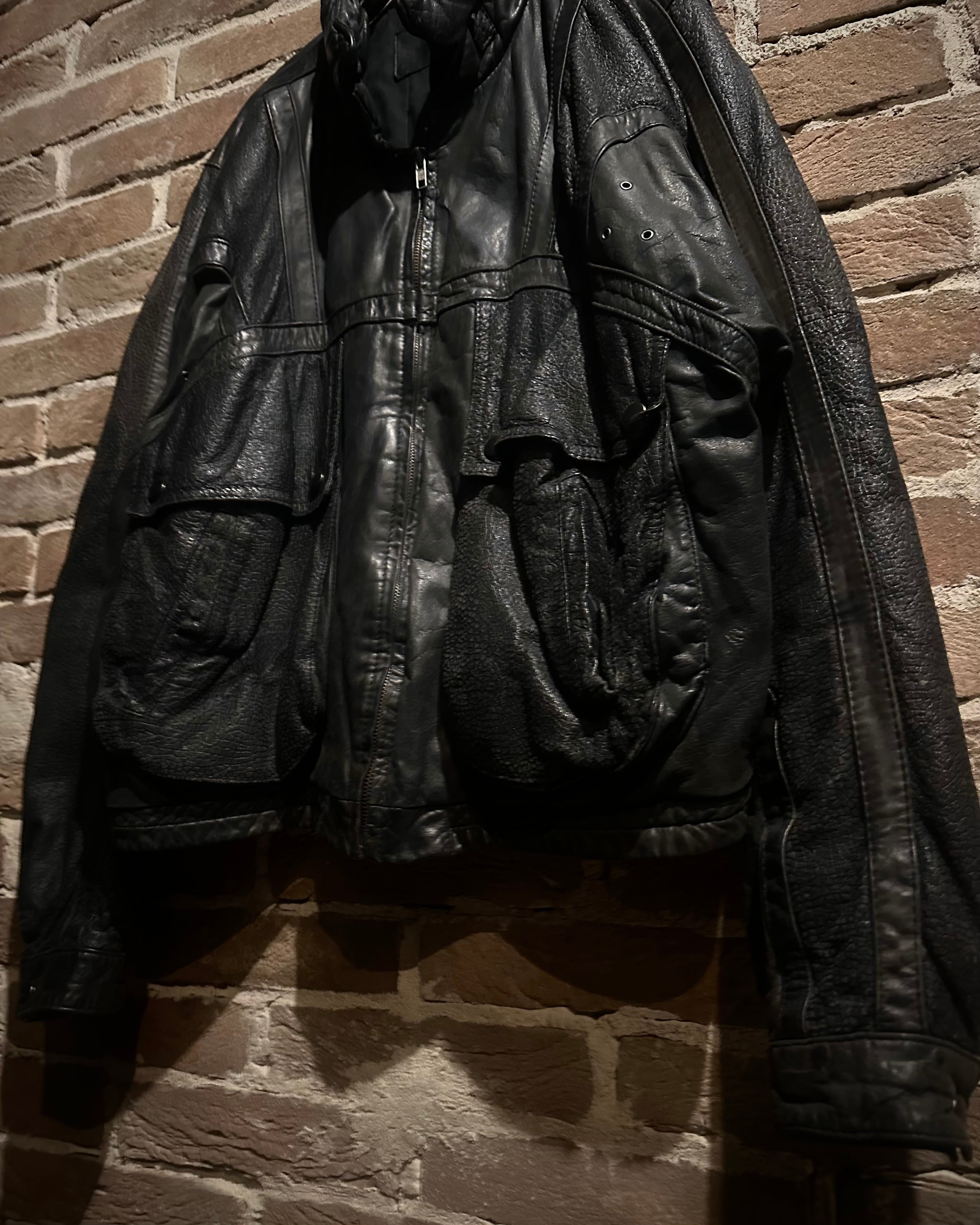 フロントには大ぶりのフラップポケットを配置し、無骨なワーク要素とデザイン性を両立。肩、スリーブにかけての切り替え構成は計算され尽くしており、レザーの重厚さを活かしながらも動きを妨げない構造になっています。