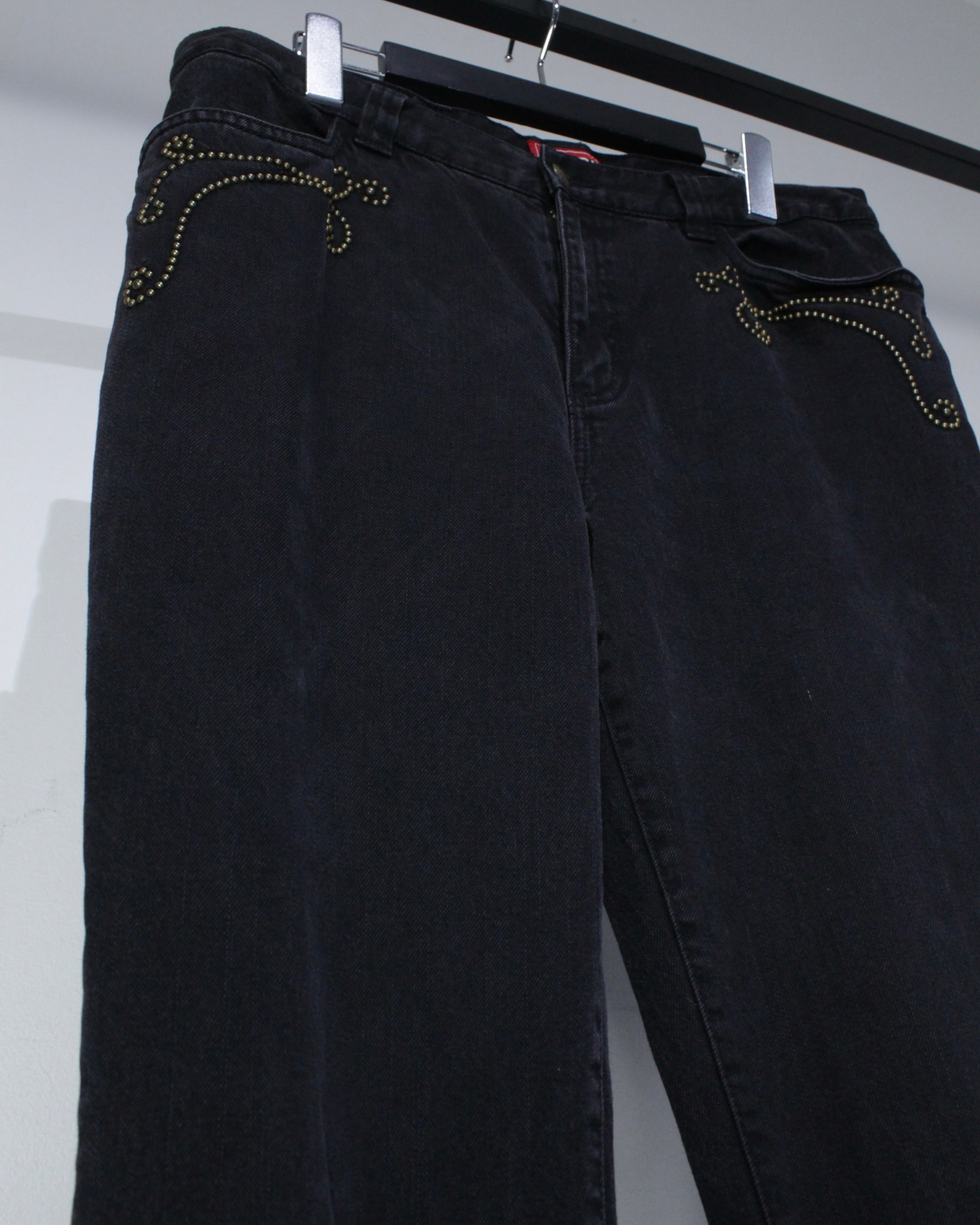 程よい厚みとストレッチ性を持つコットンデニム素材を採用し、タフさと快適さを両立。バックポケットを含めたミニマルな構成が、スタッズ装飾の存在感をより際立たせています。