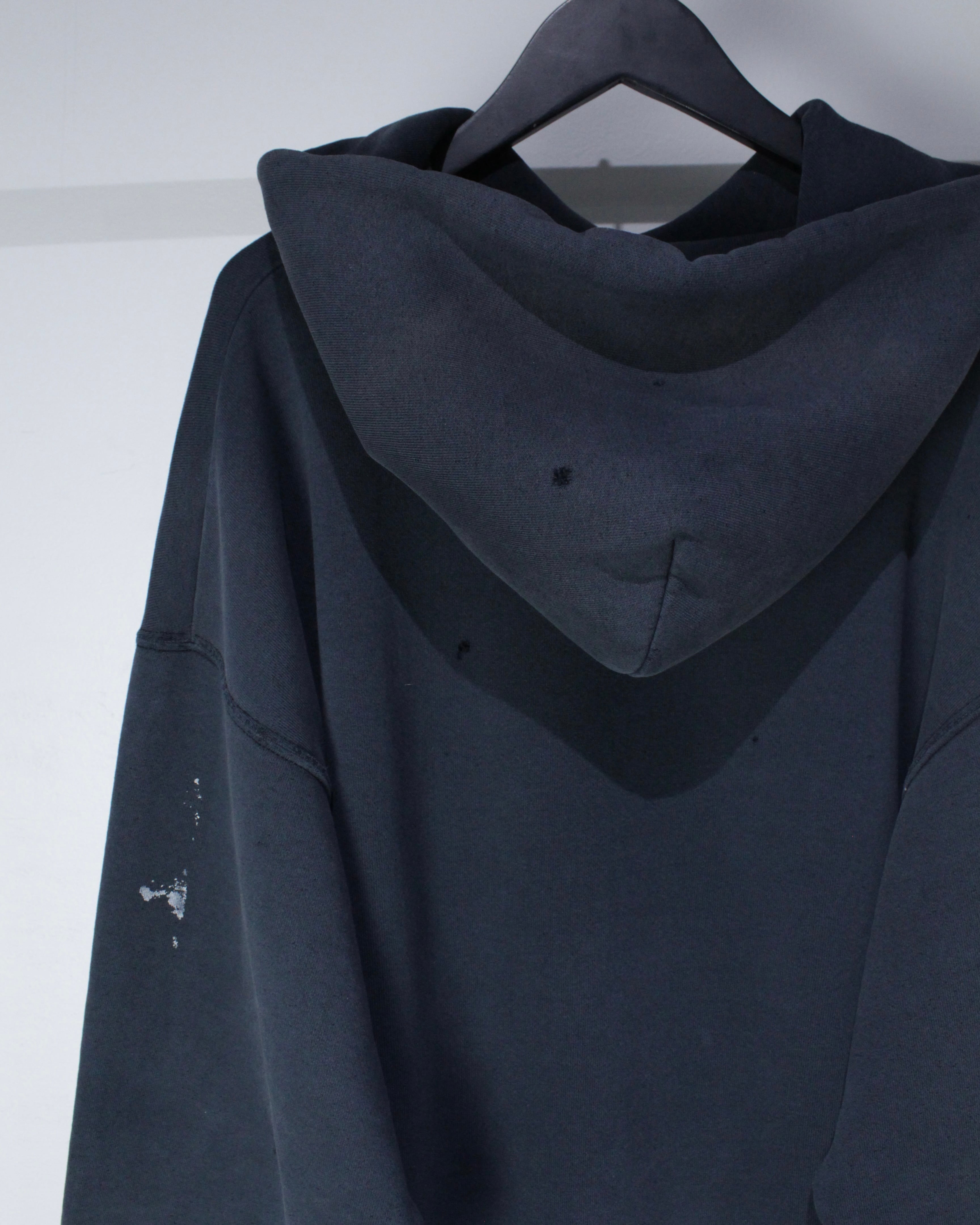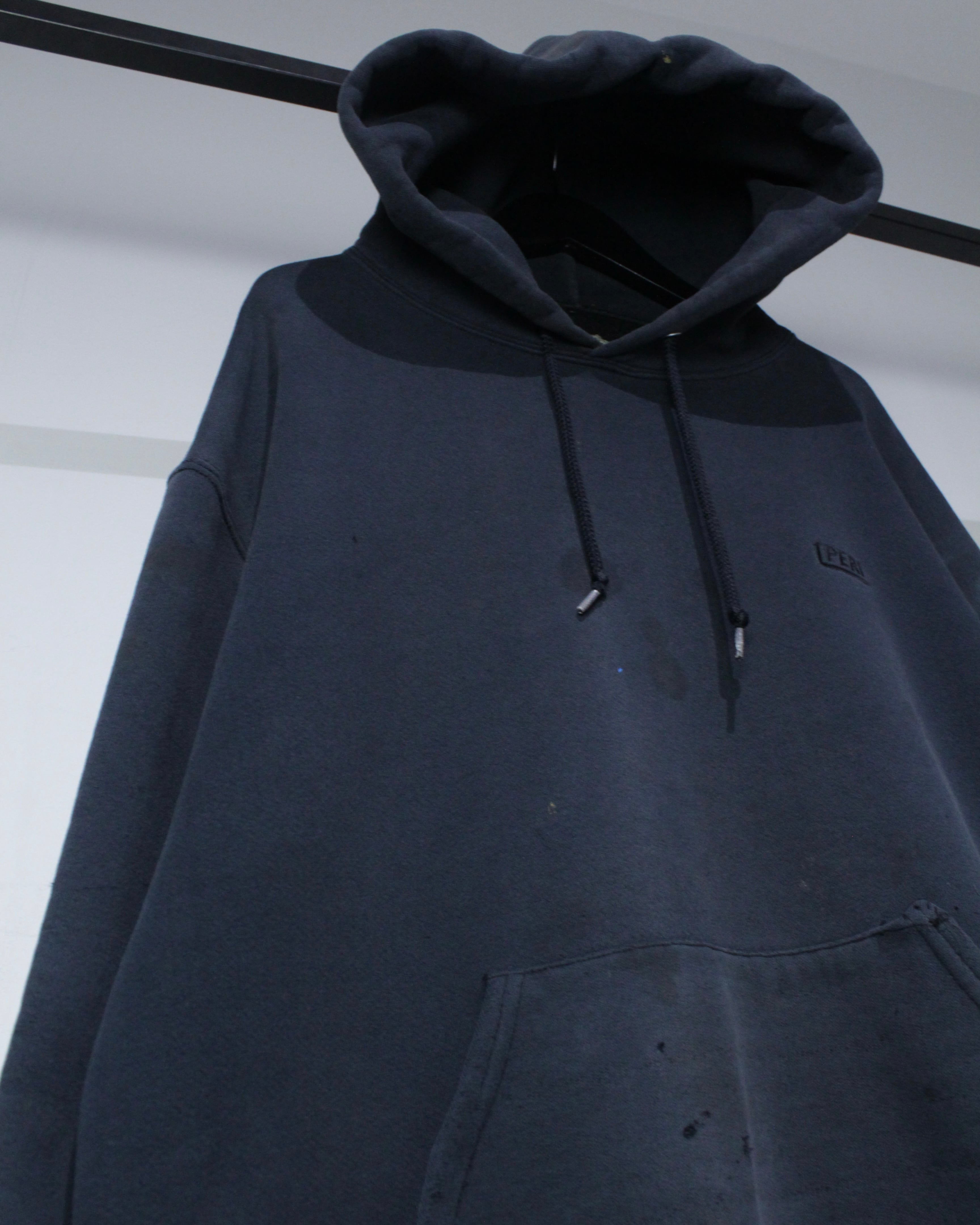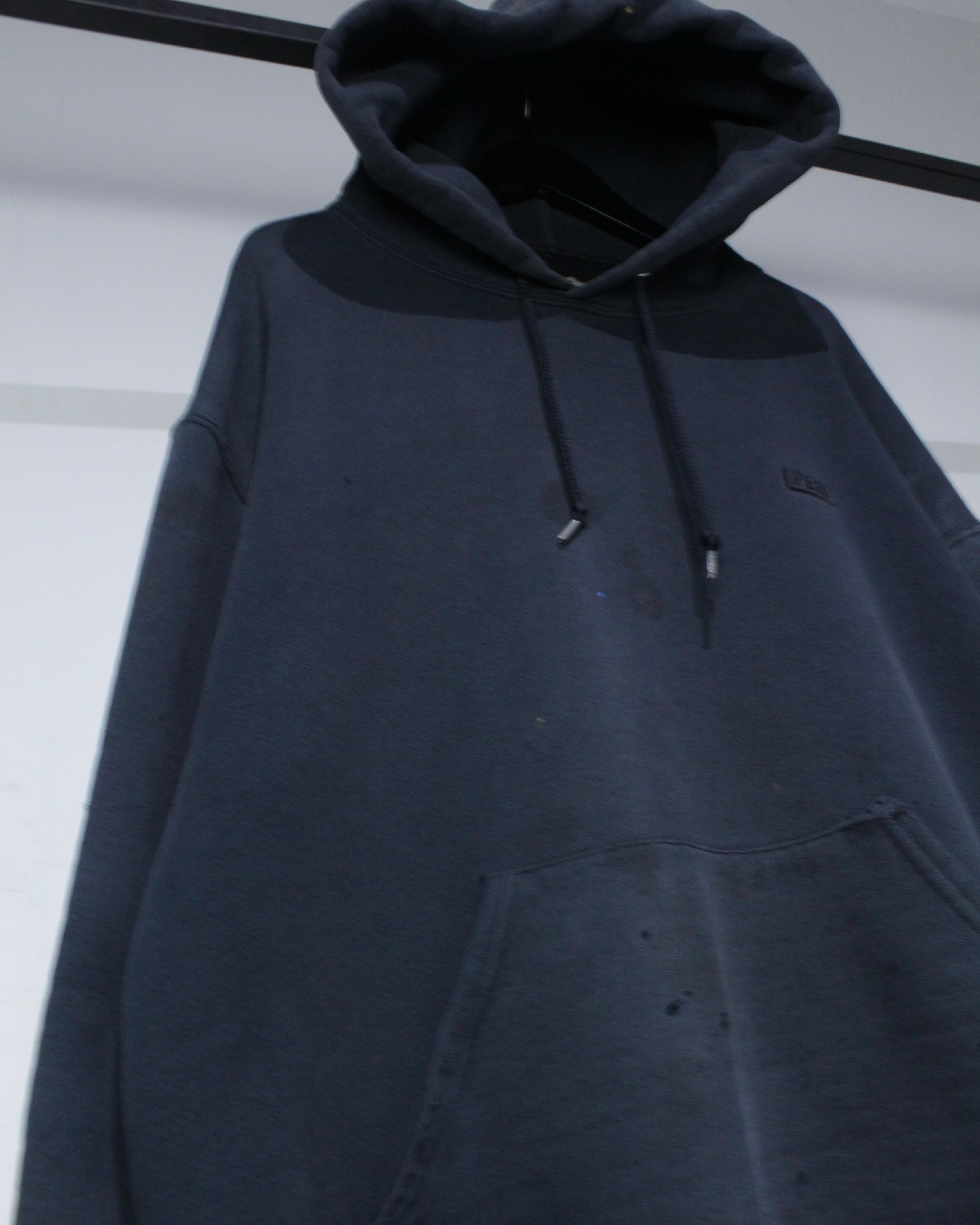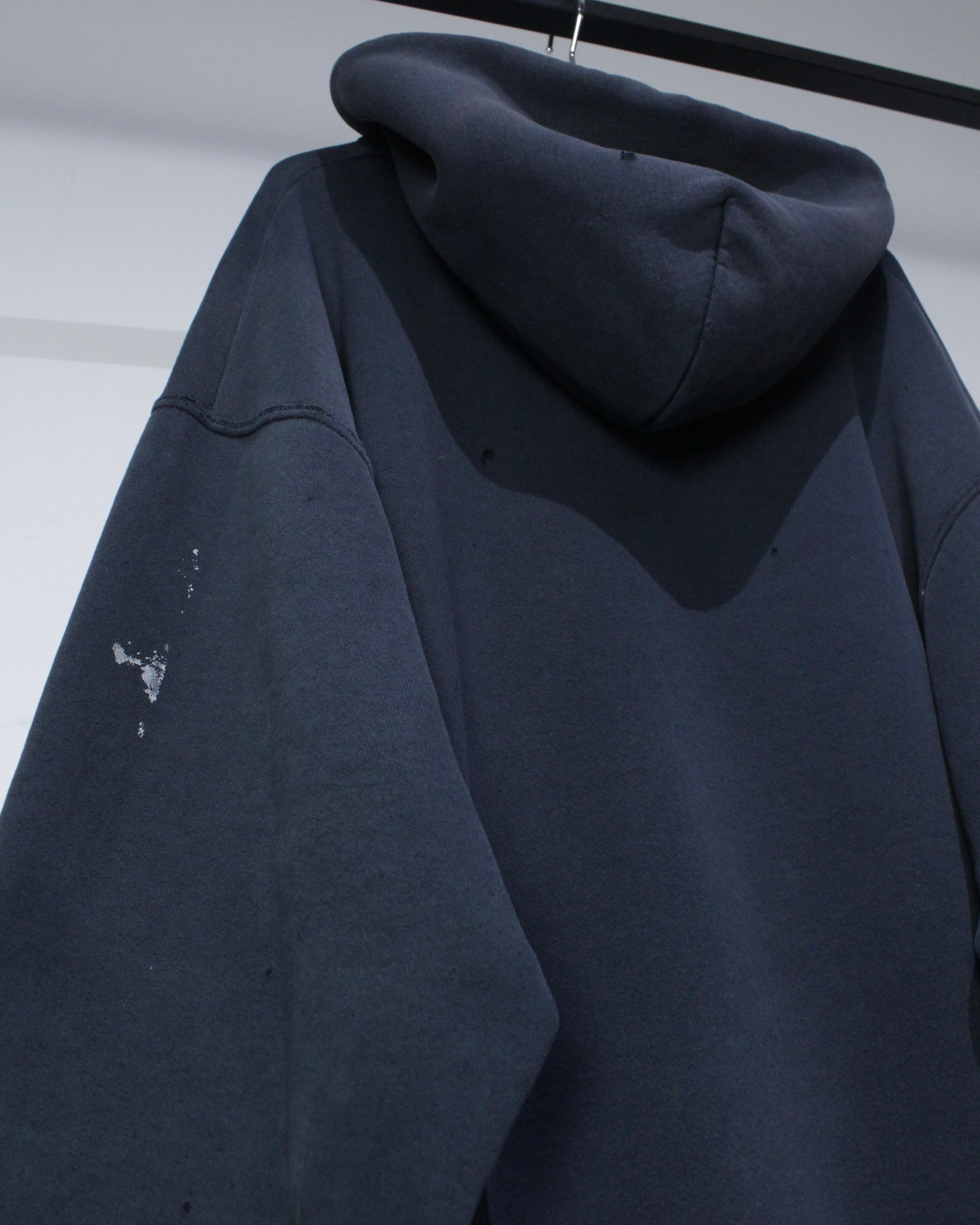 厚手のコットンポリ裏起毛ボディは、長年着込まれた柔らかさとドライな質感が特徴。袖やポケット周りに散見されるピンホールや擦れは、自然な経年によるもので、無骨ながらもヴィンテージ特有の良い雰囲気を感じさせます。