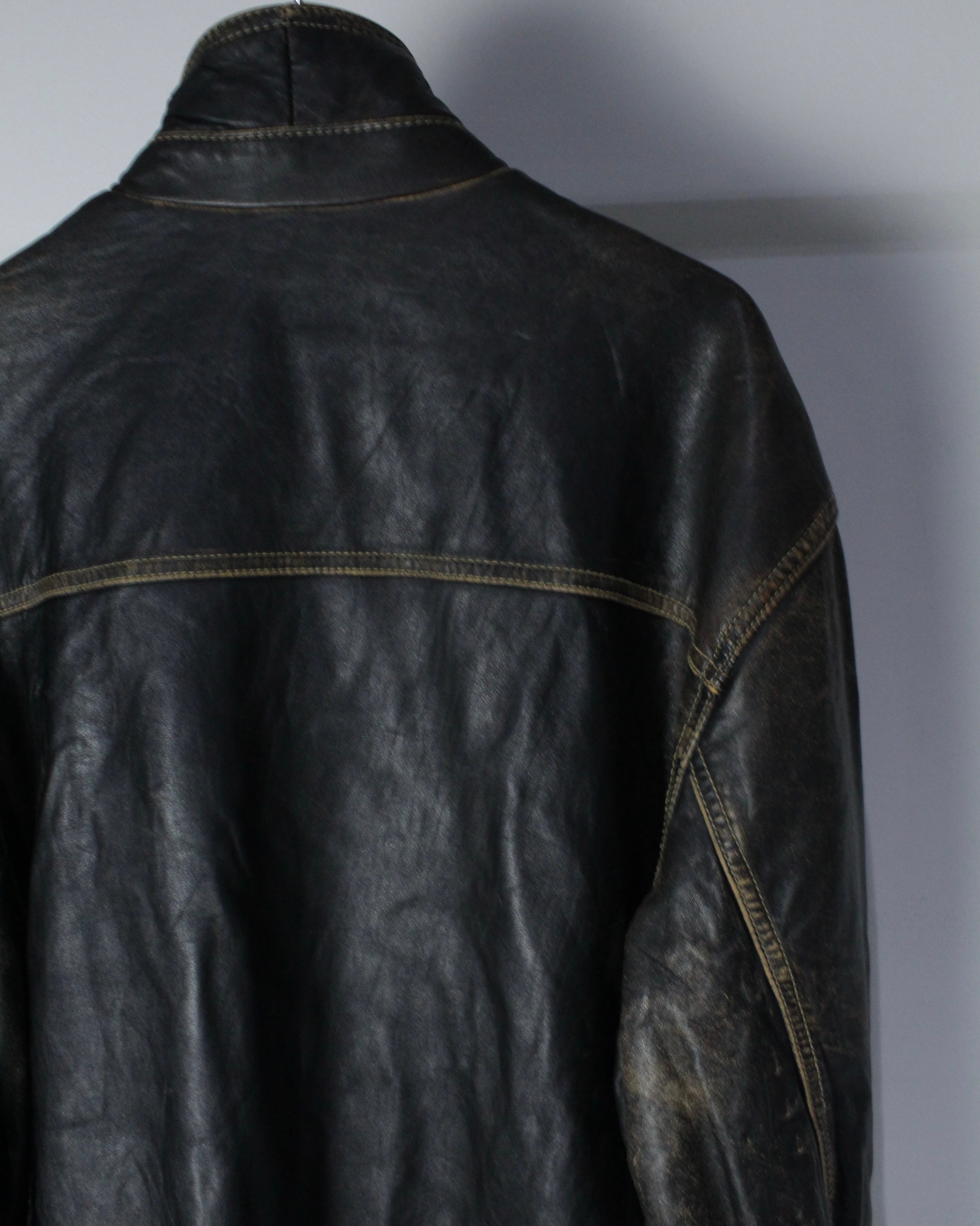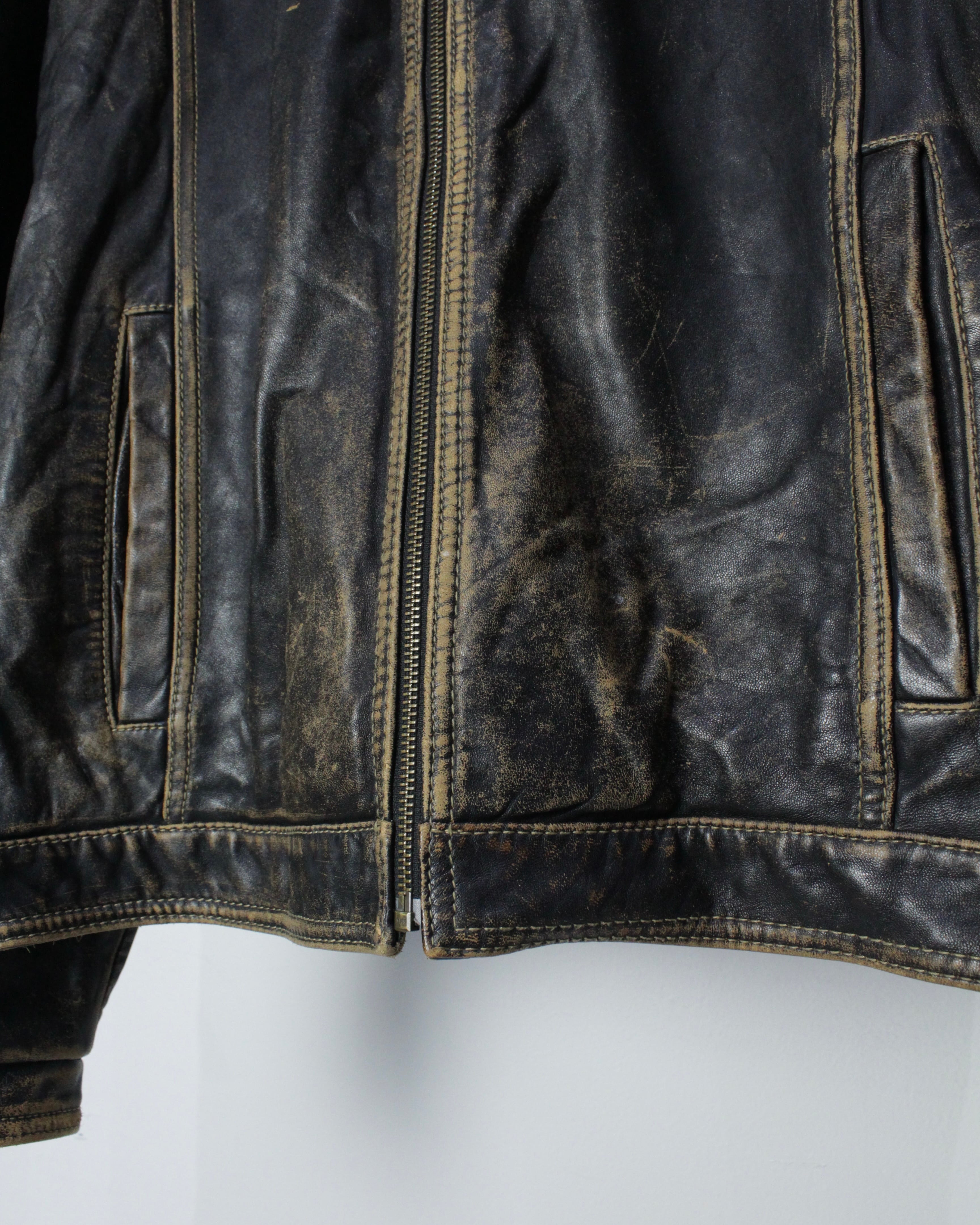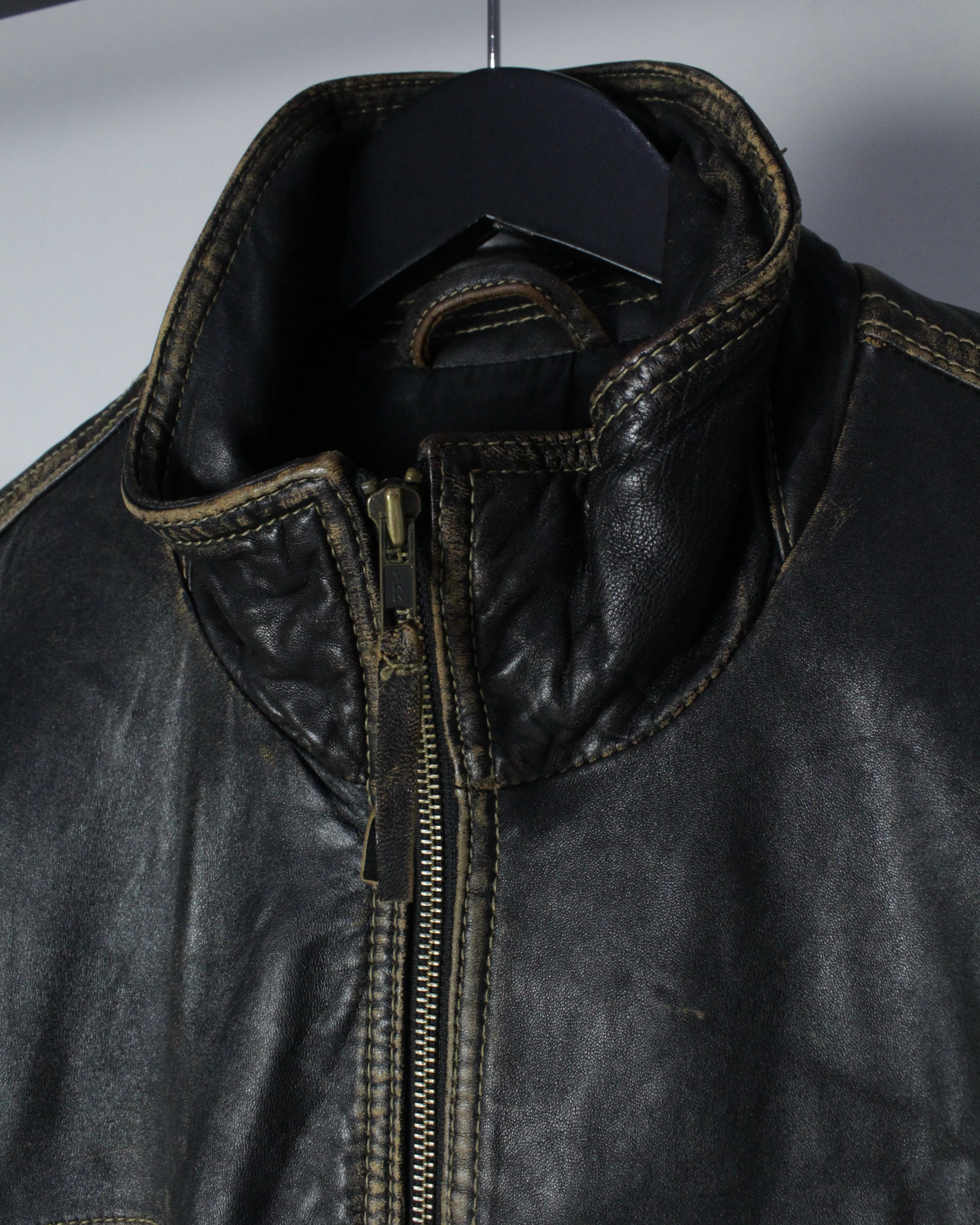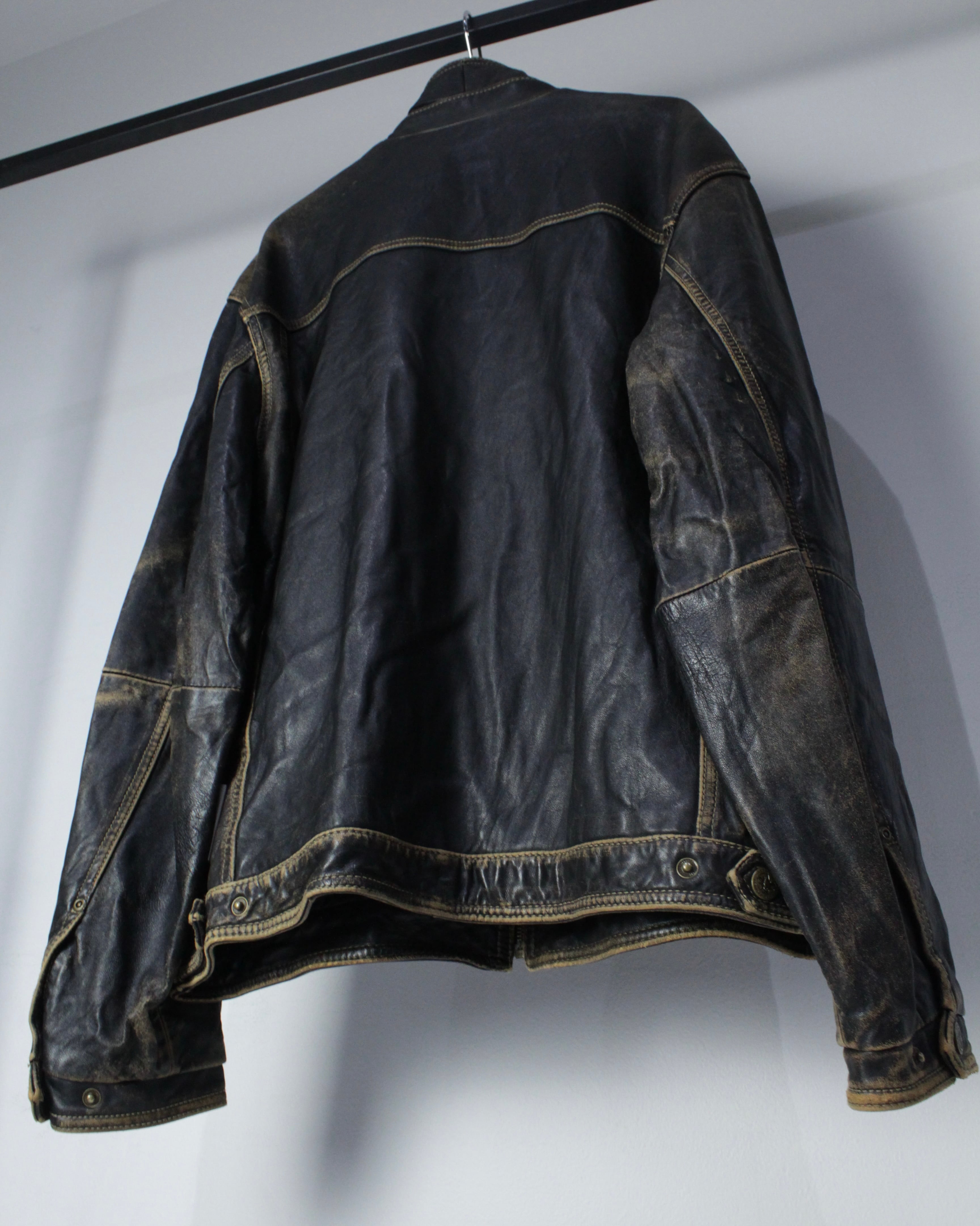 縫い目やエッジ部分のブラウンの色抜けが絶妙で、長年着込まれたリアルなエイジングにグッときます。レザー特有の艶と柔らかさをしっかりと残しており、着用を重ねるごとにさらに深みが増していくのも醍醐味。