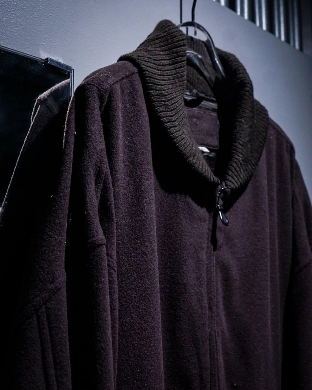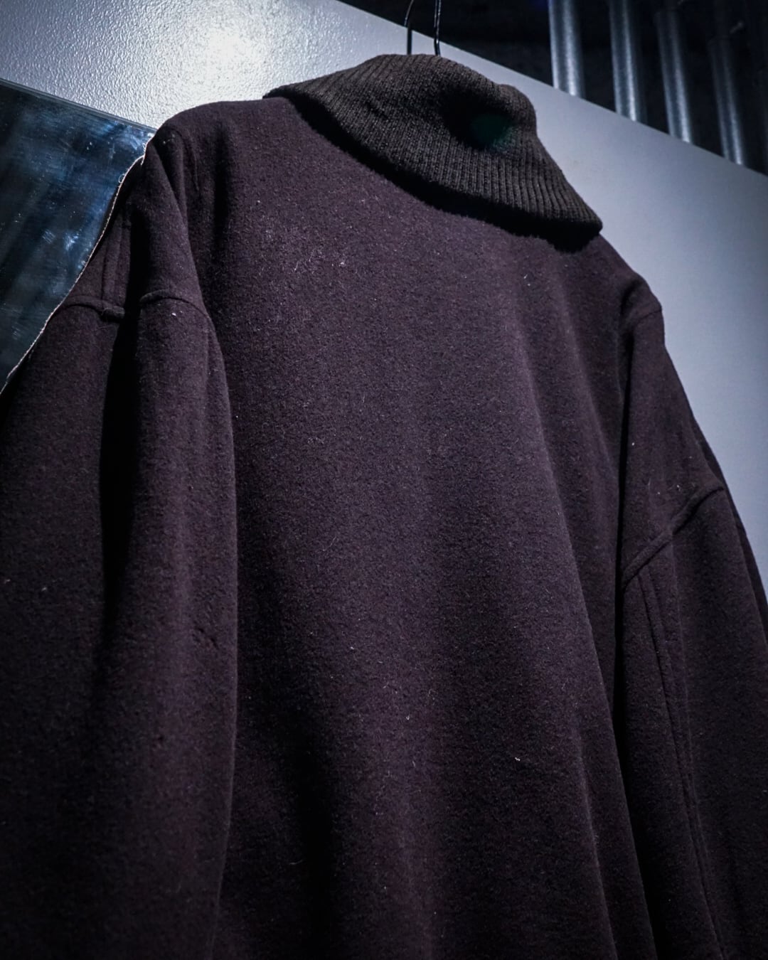 目を引くのは首元全体を包み込むようなショールカラー。首元にボリュームをもたせながらも、立ちすぎず柔らかく落ちるフォルムがエレガントな印象を与えます。