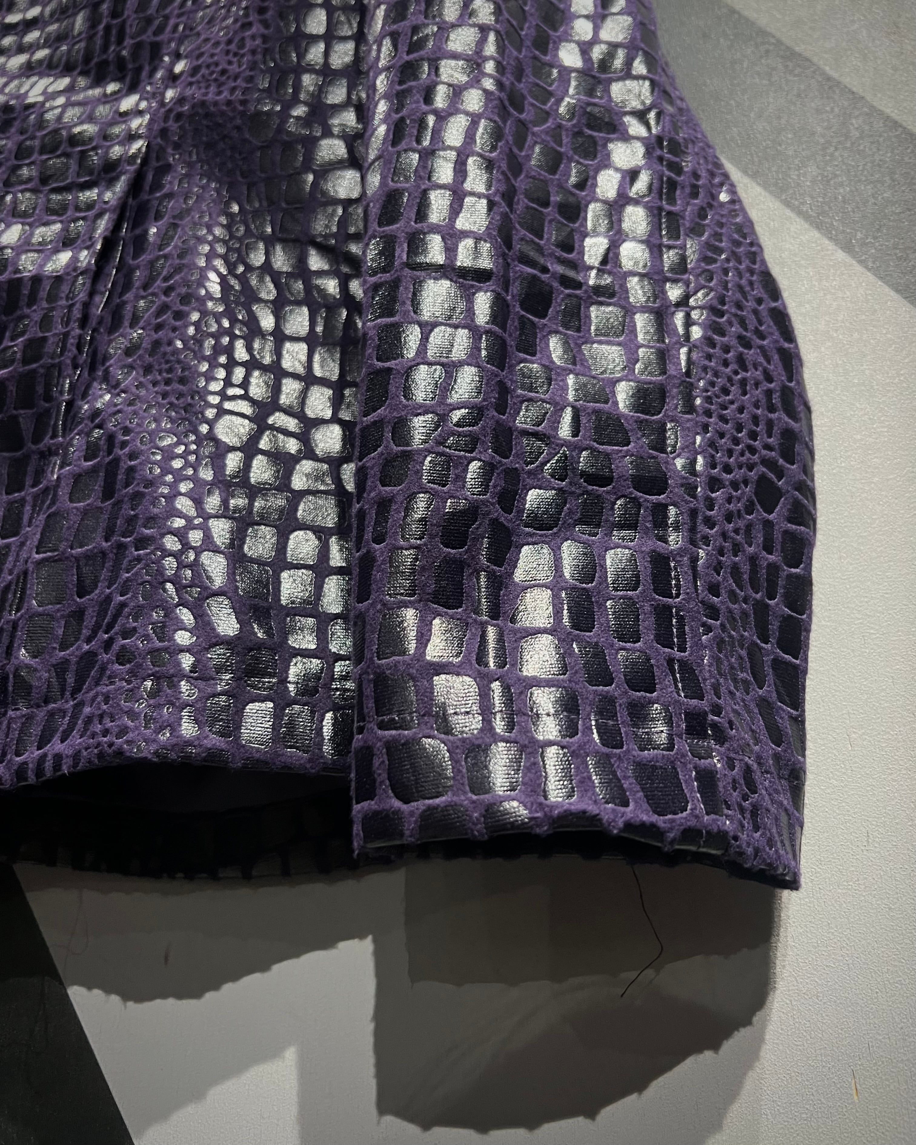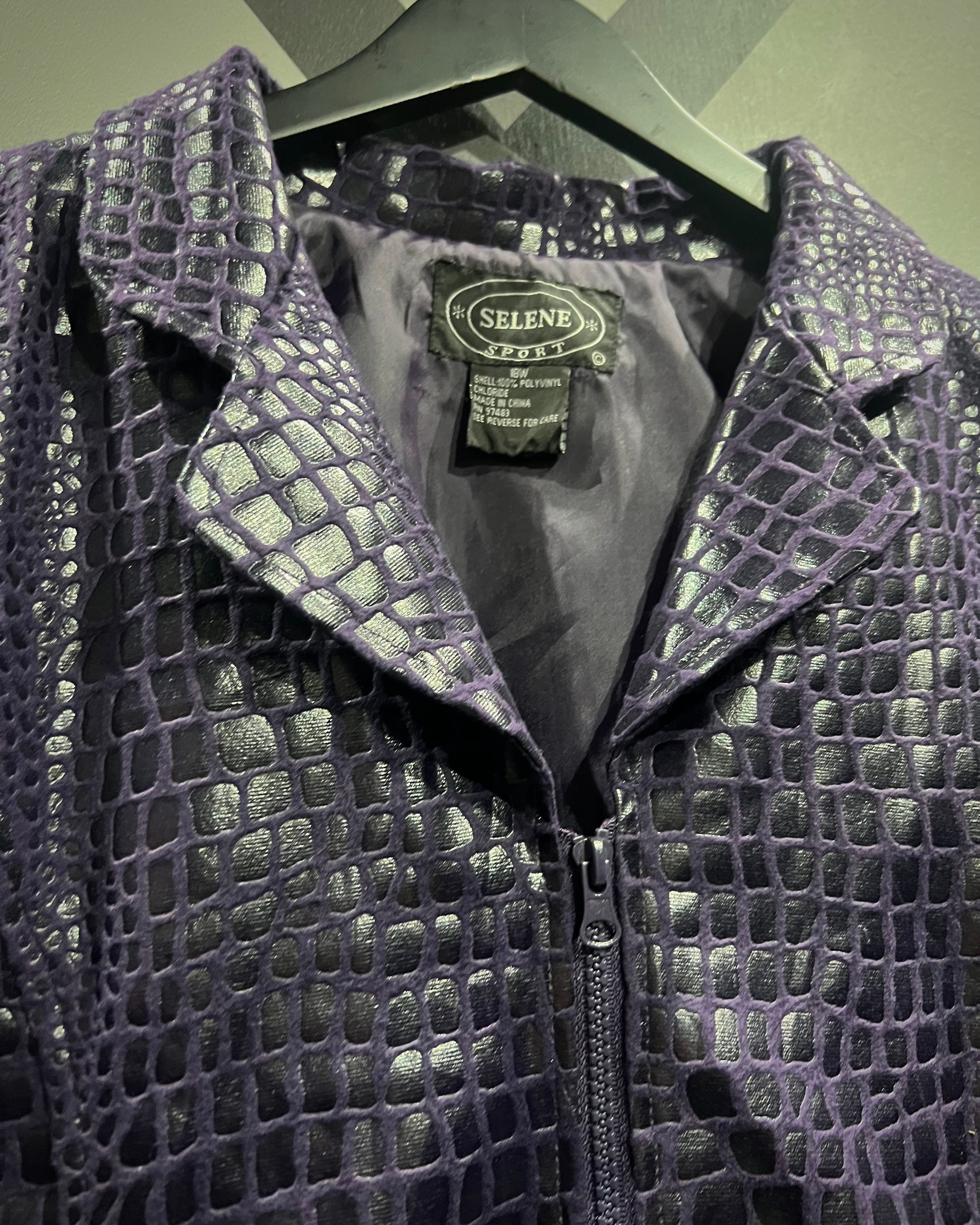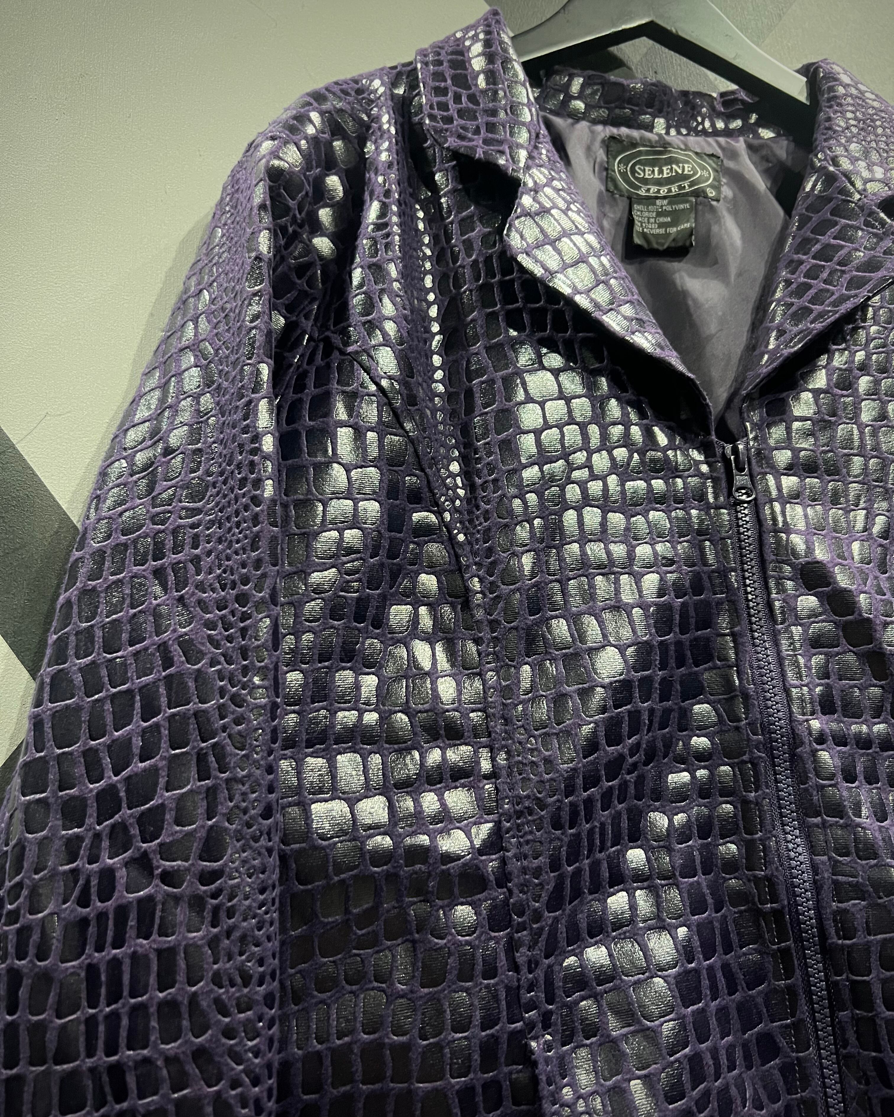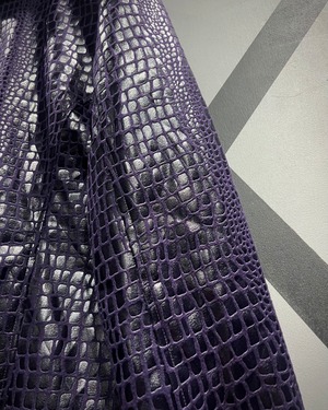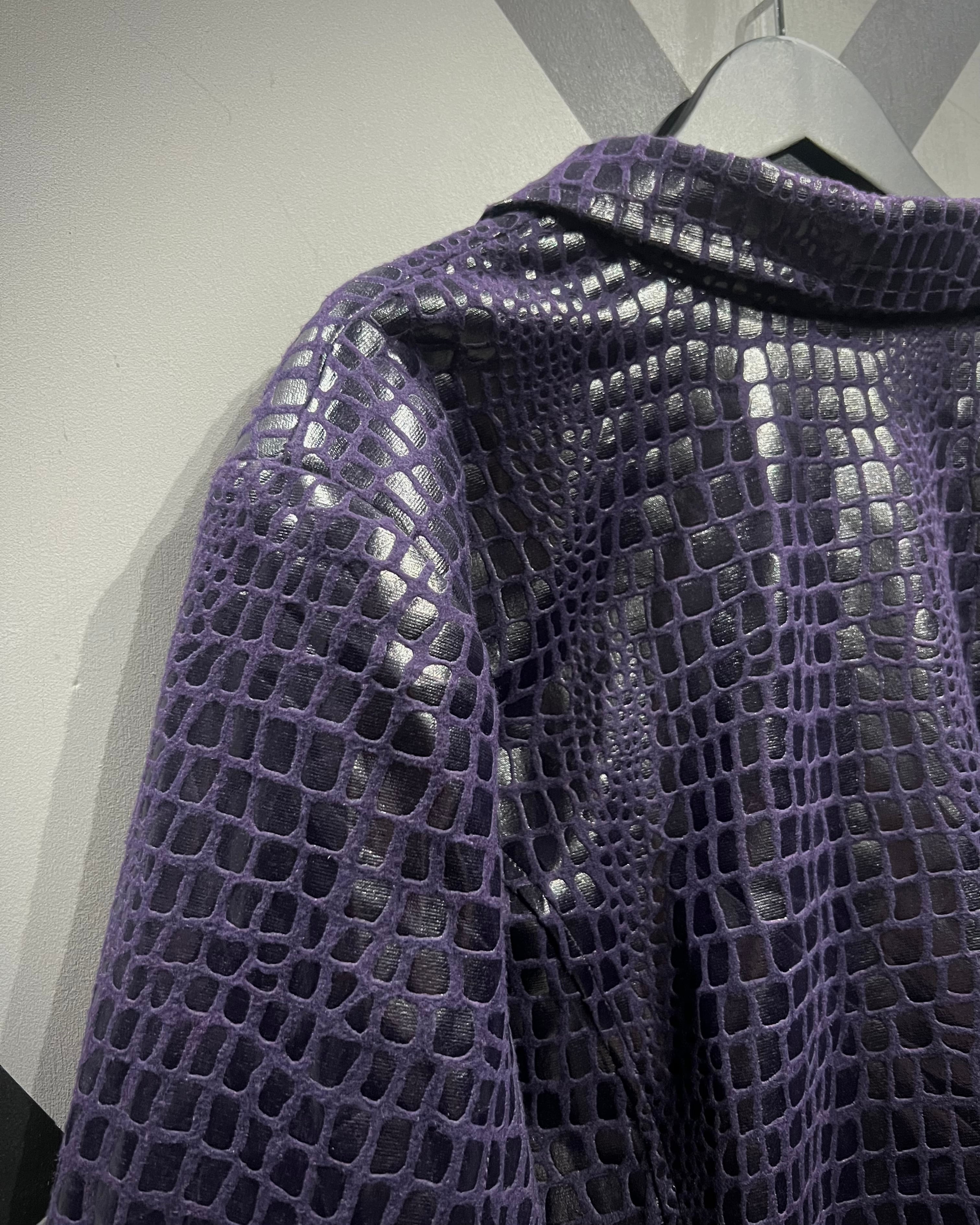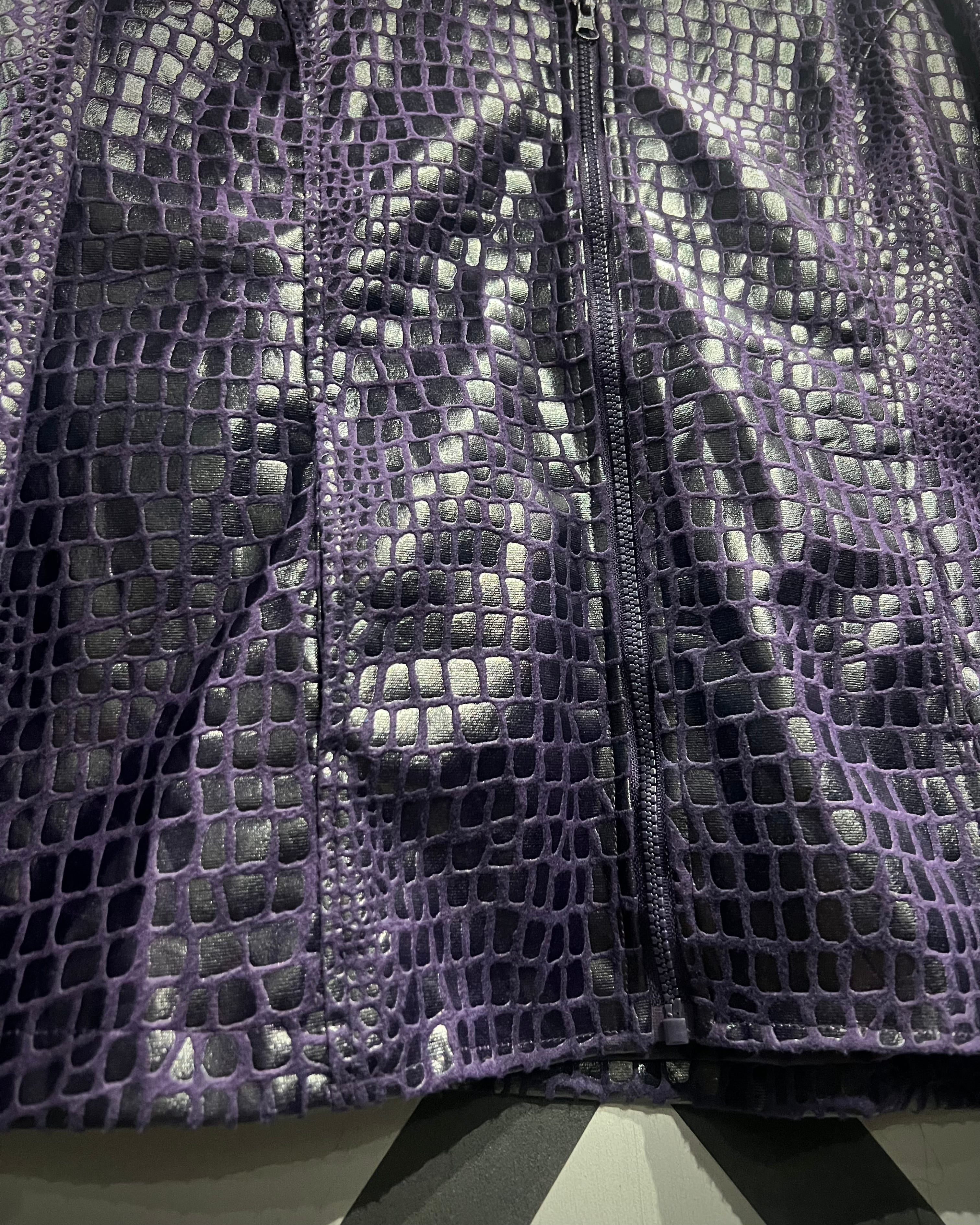 フワッと軽くシーズンレスなポリエステル素材に、鈍く光沢を放つクロコダイル調のコーティングを施し、レザーライクな風合いに仕上げたジャケット。