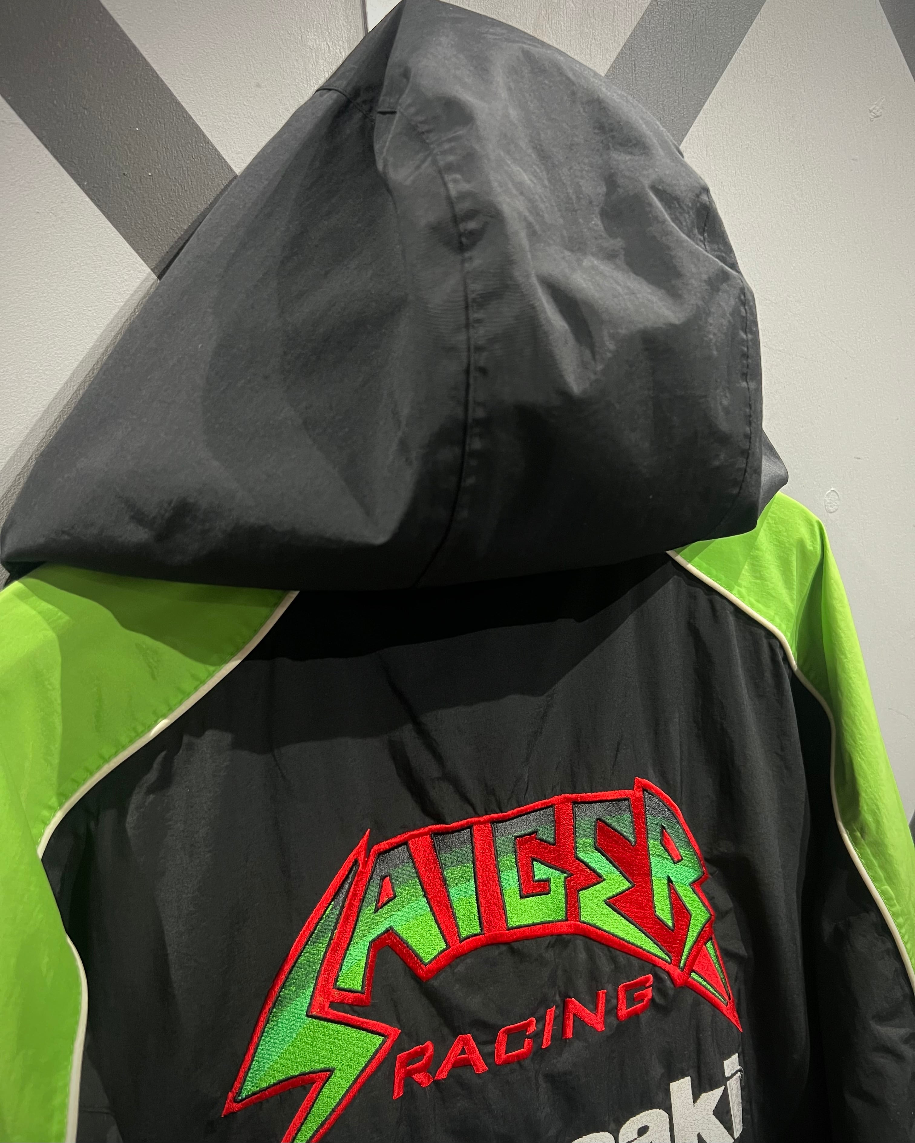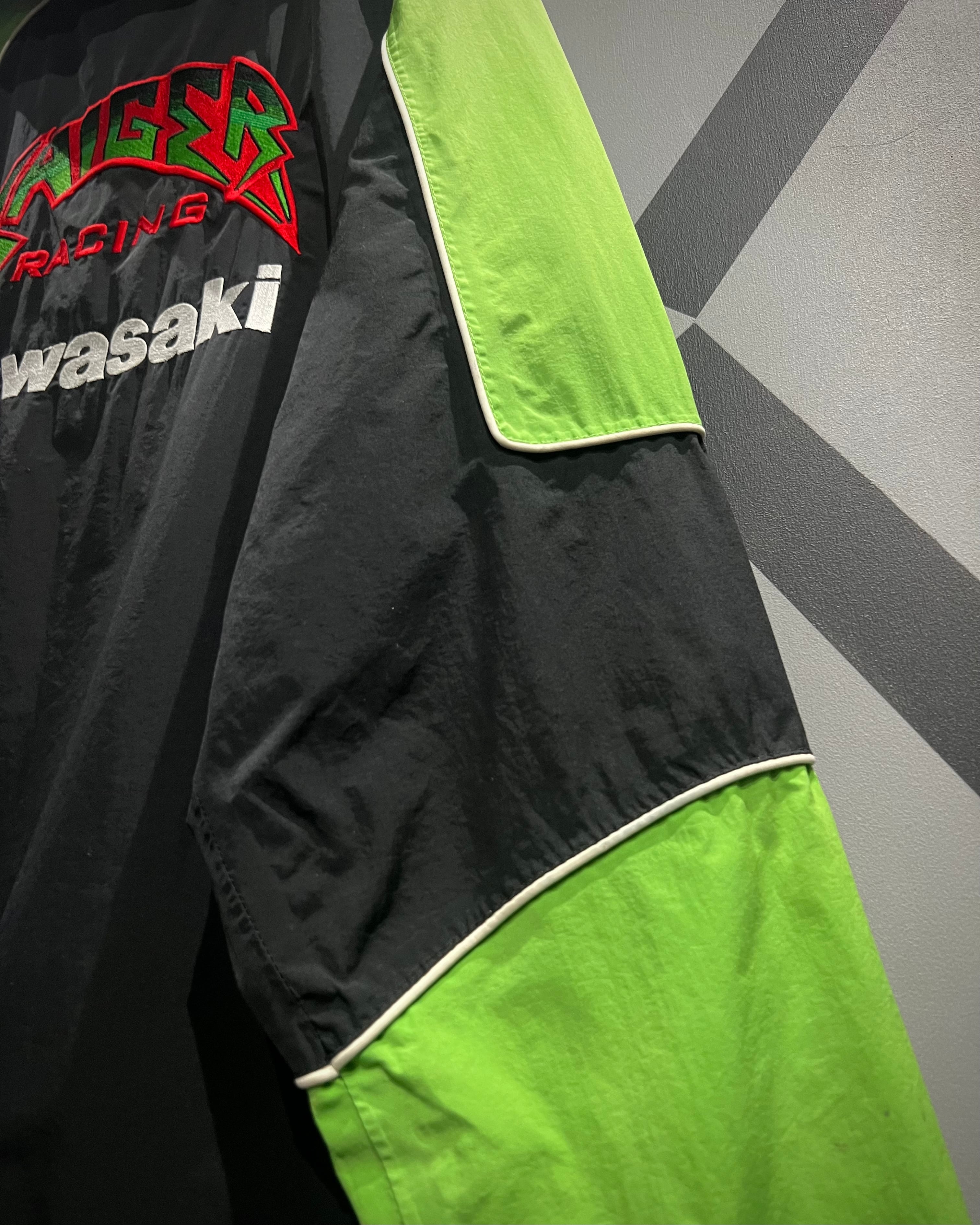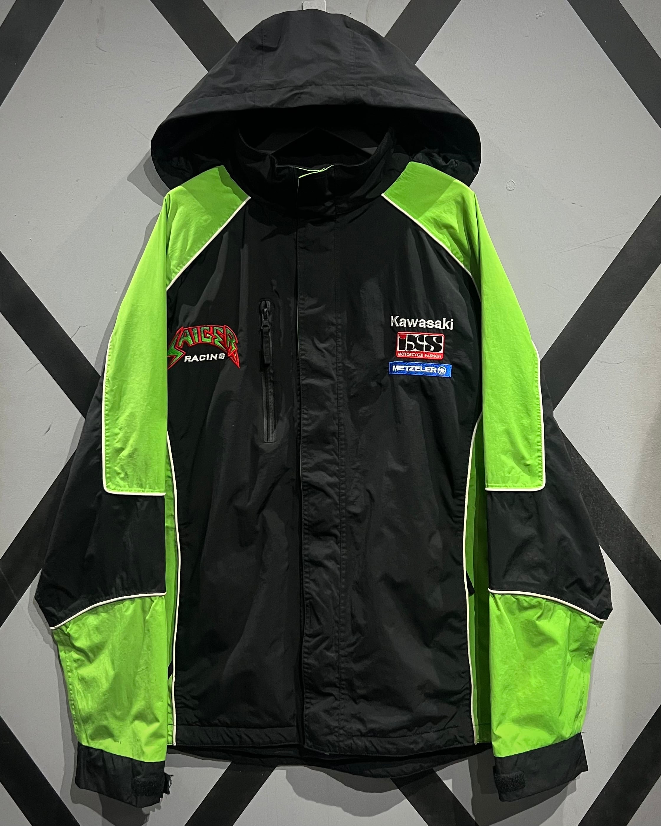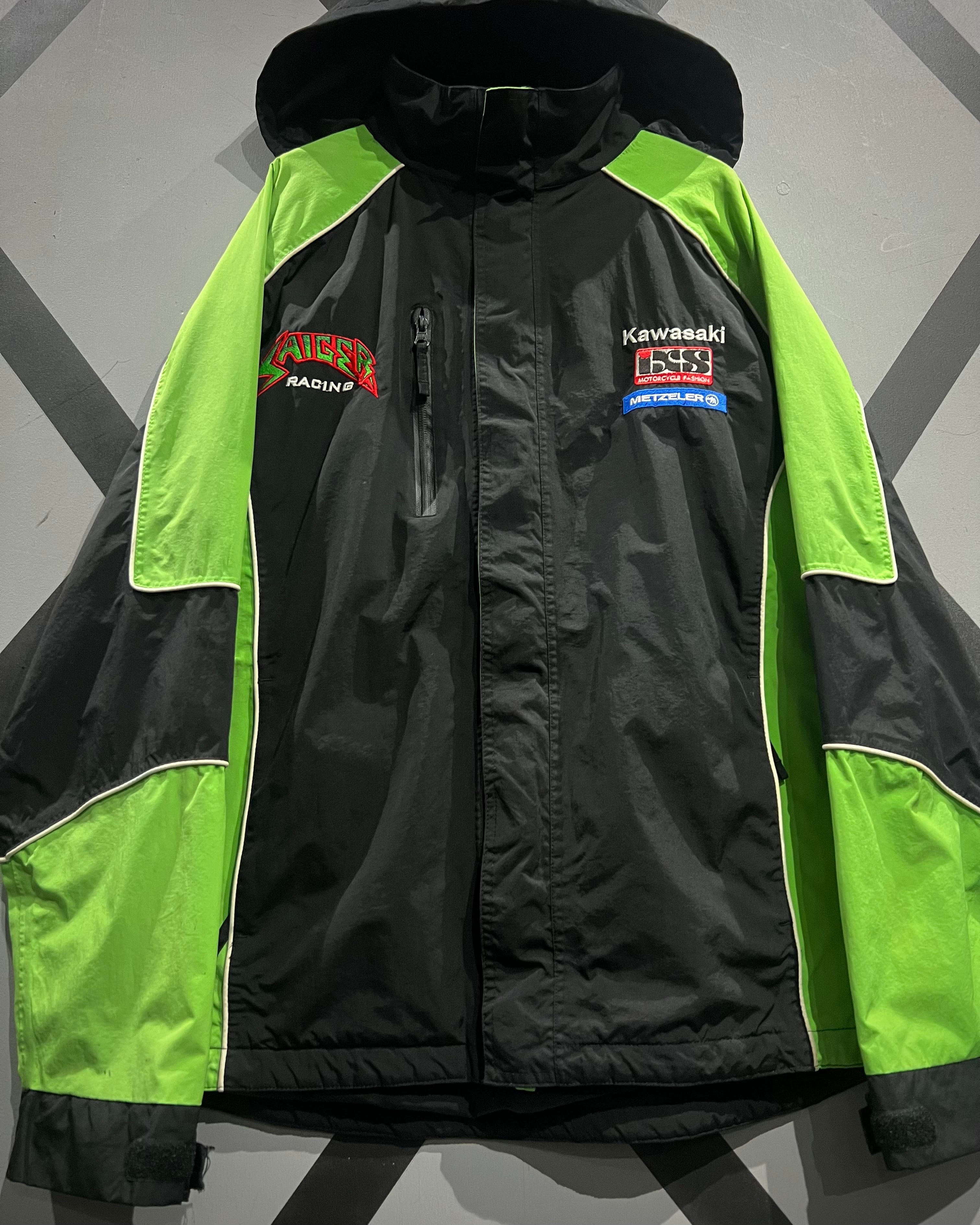 胸元には “KAWASAKI” “METZELER” “BSS” などのオフィシャルロゴ刺繍を、背面には大判の “SAIGER RACING” ロゴを配置。さらに切り替え部にはパイピングを施し、立体的なデザインラインを強調しています。