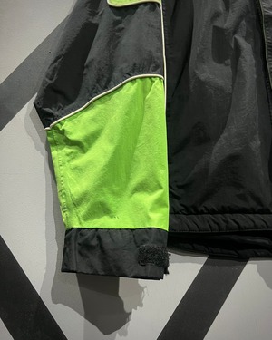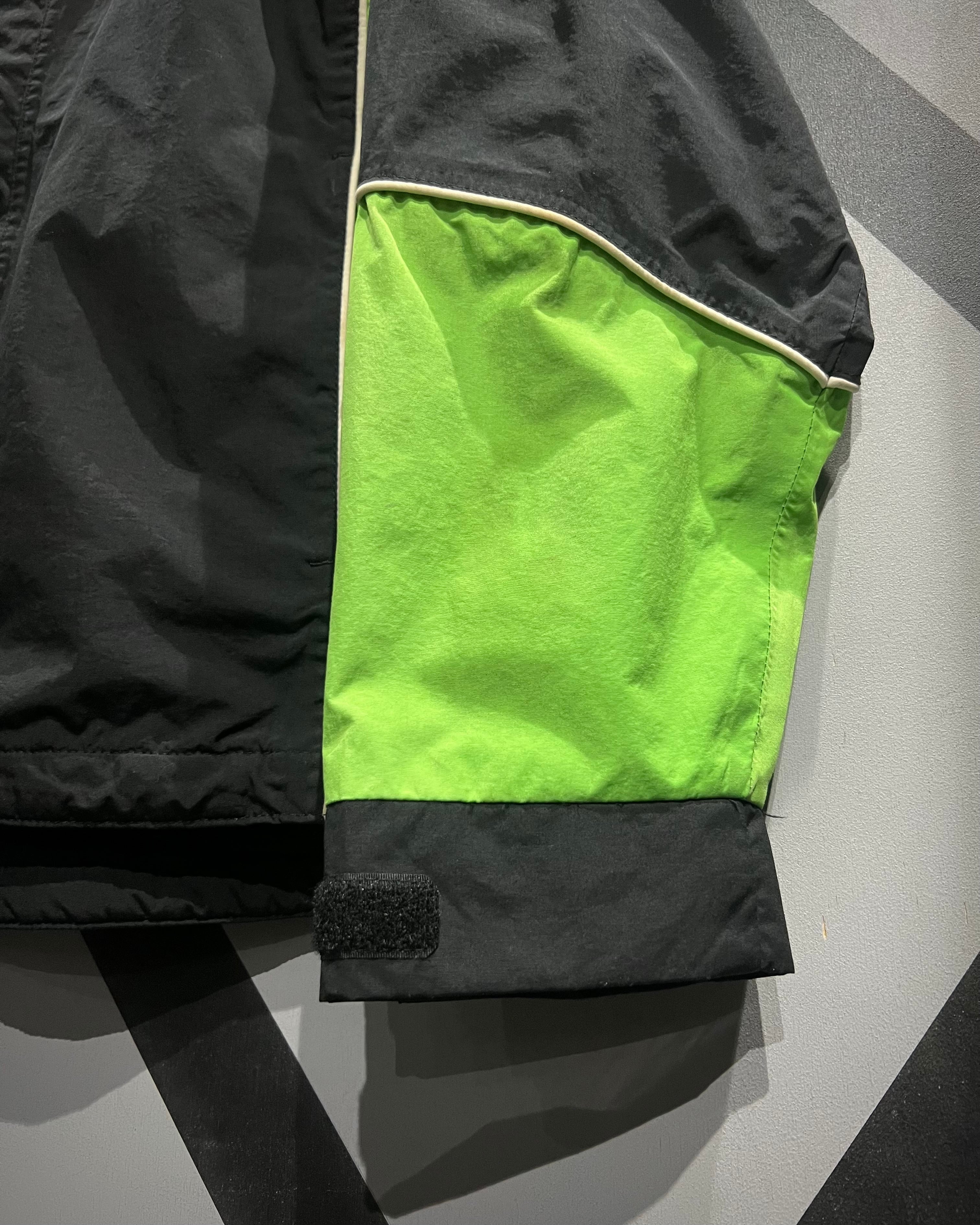シャリ感のあるナイロン素材をベースに、ブラック×ネオングリーンの切り替えで構成された、ブランドテクニカルな雰囲気漂う1着。